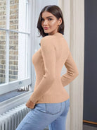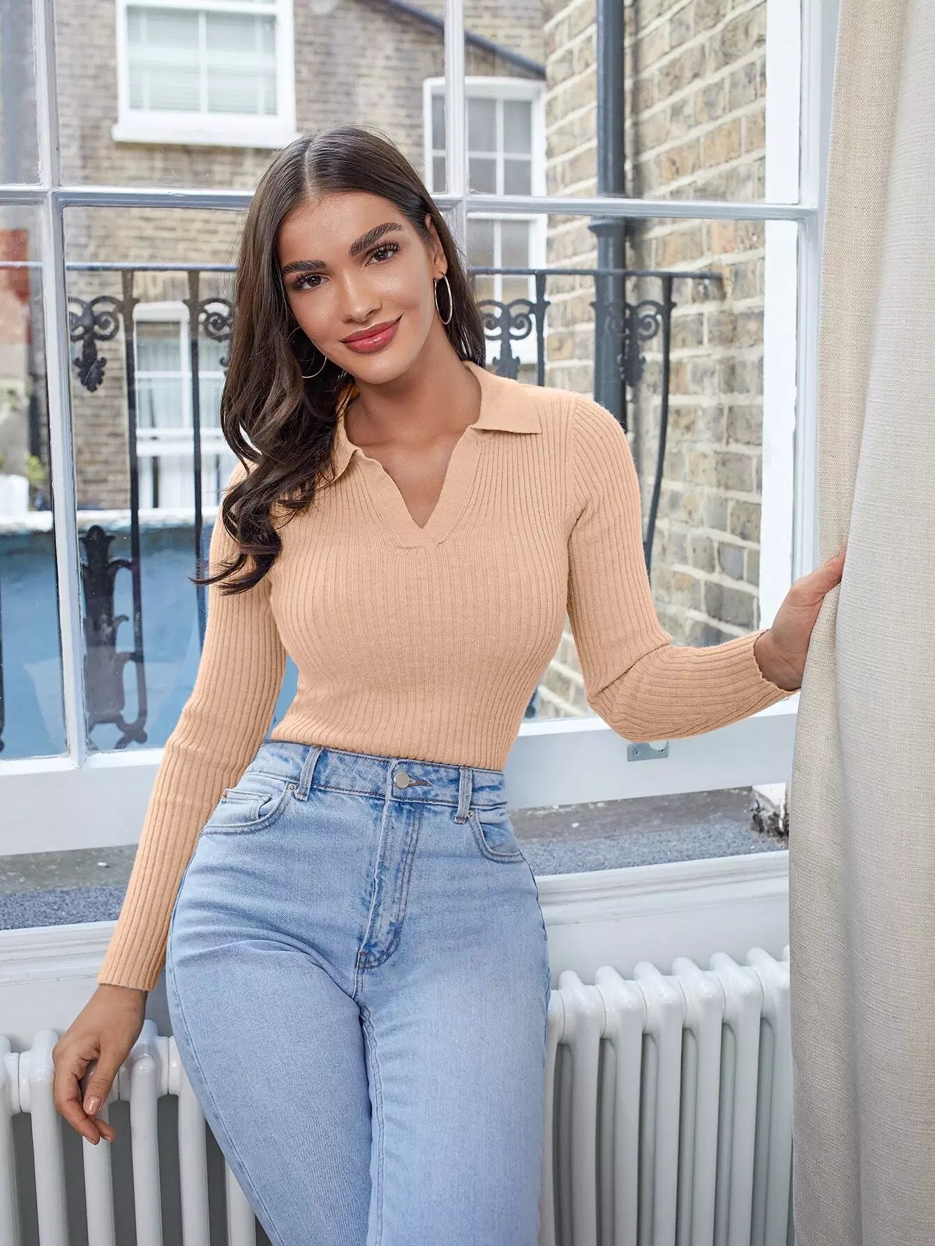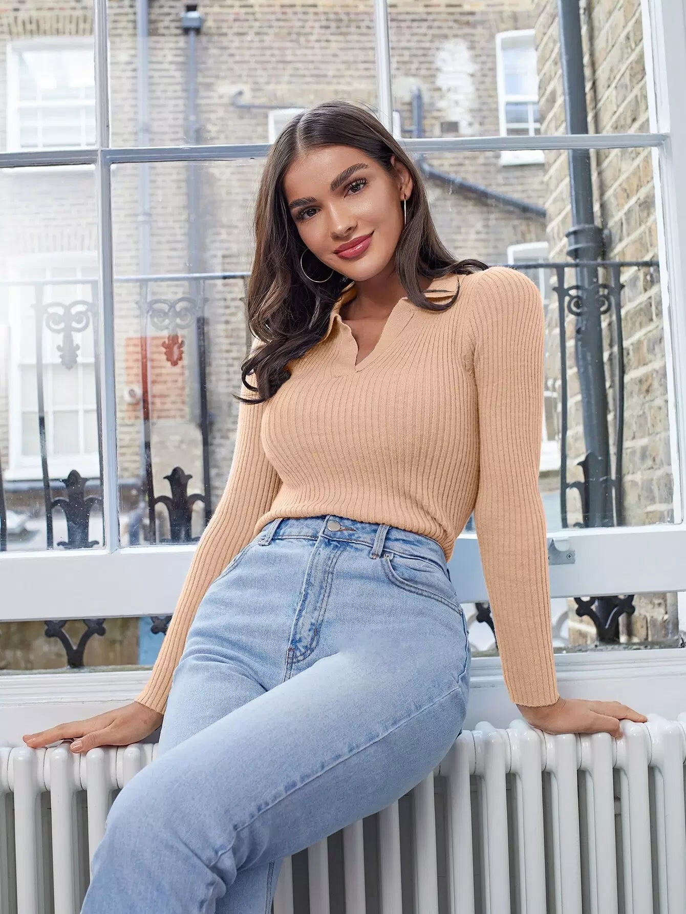 كنزة برقبة على شكل حرف V سادة محبوكة على شكل ضلع على شكل حرف V