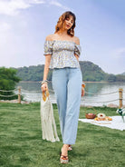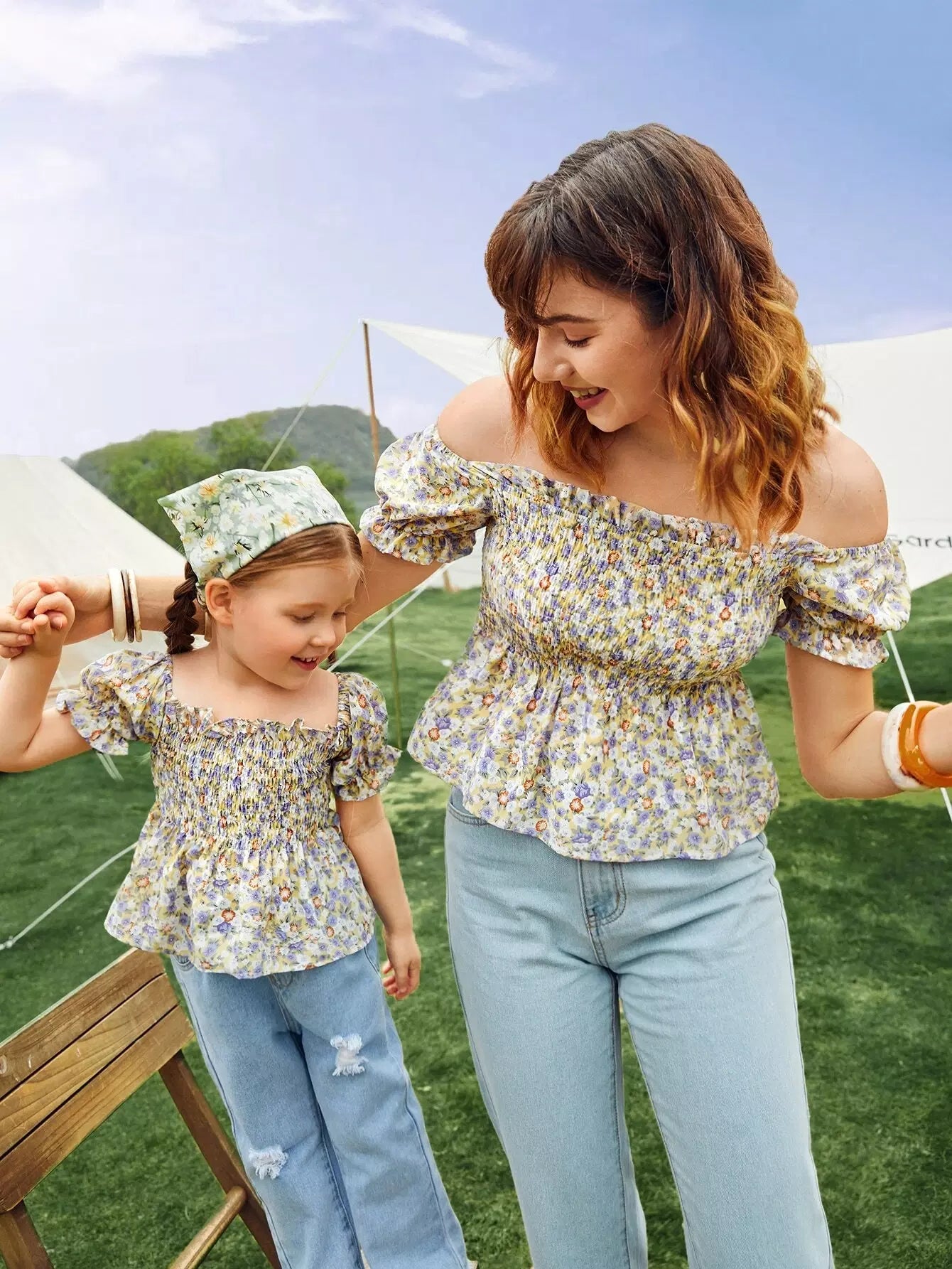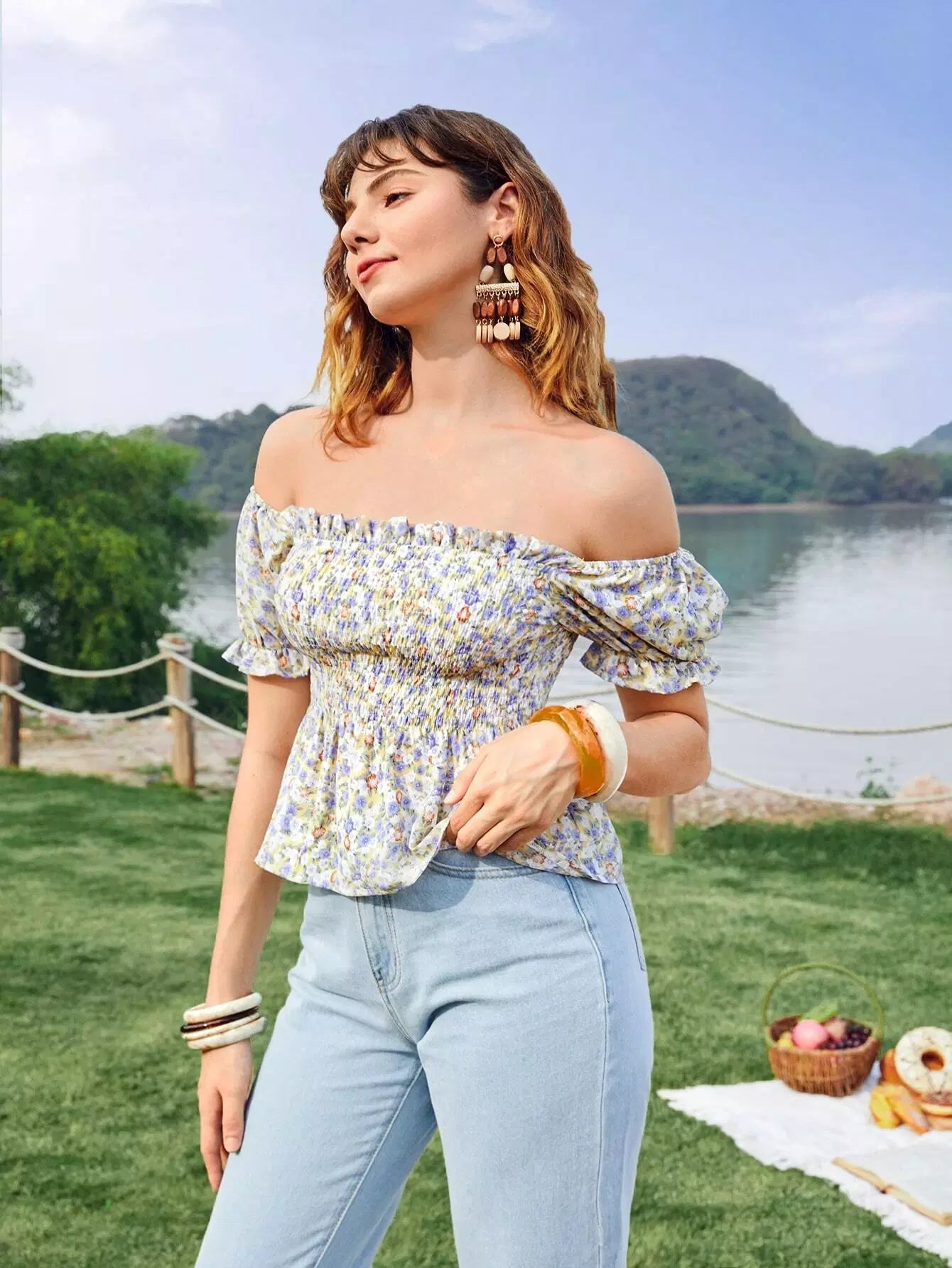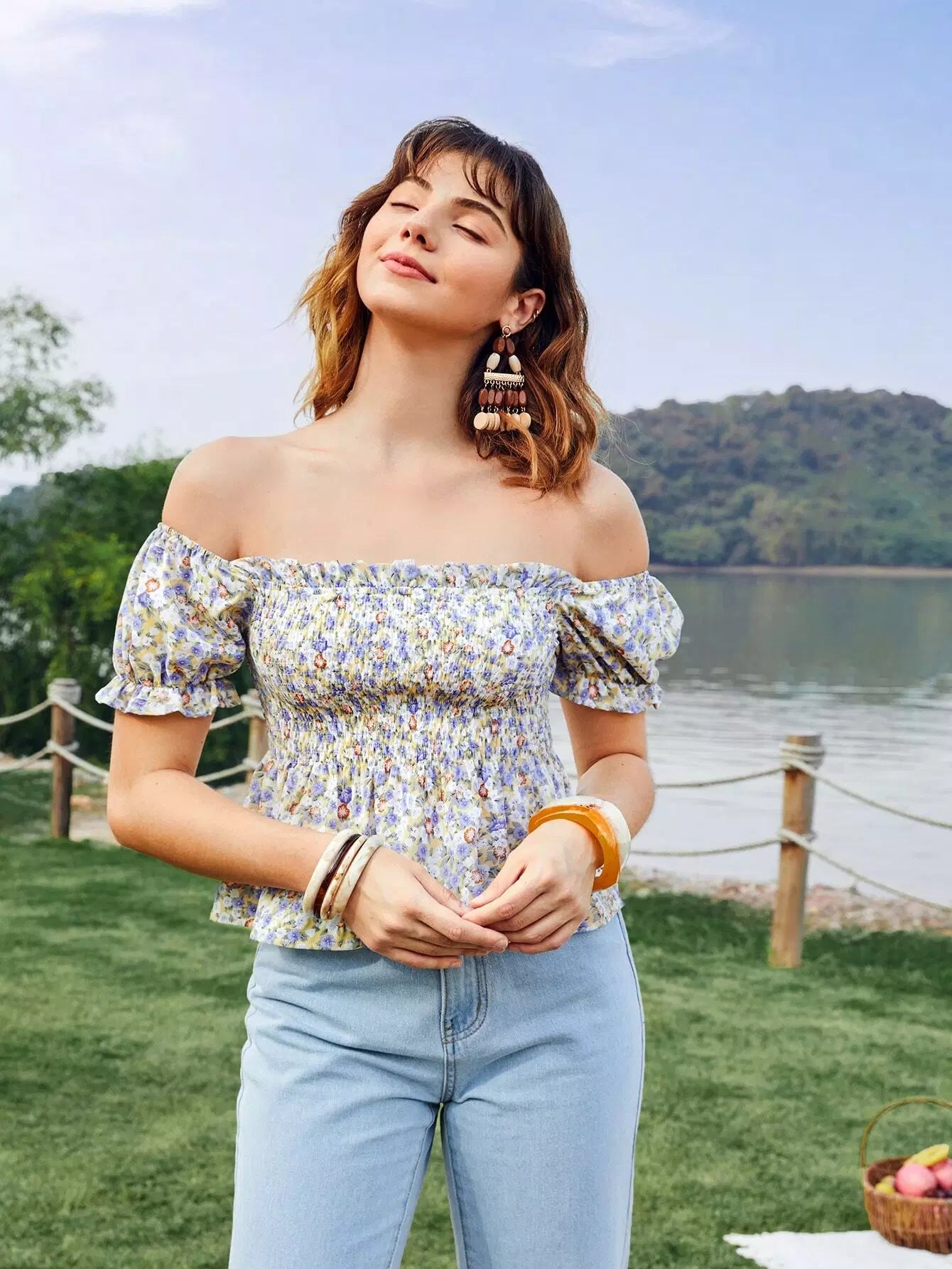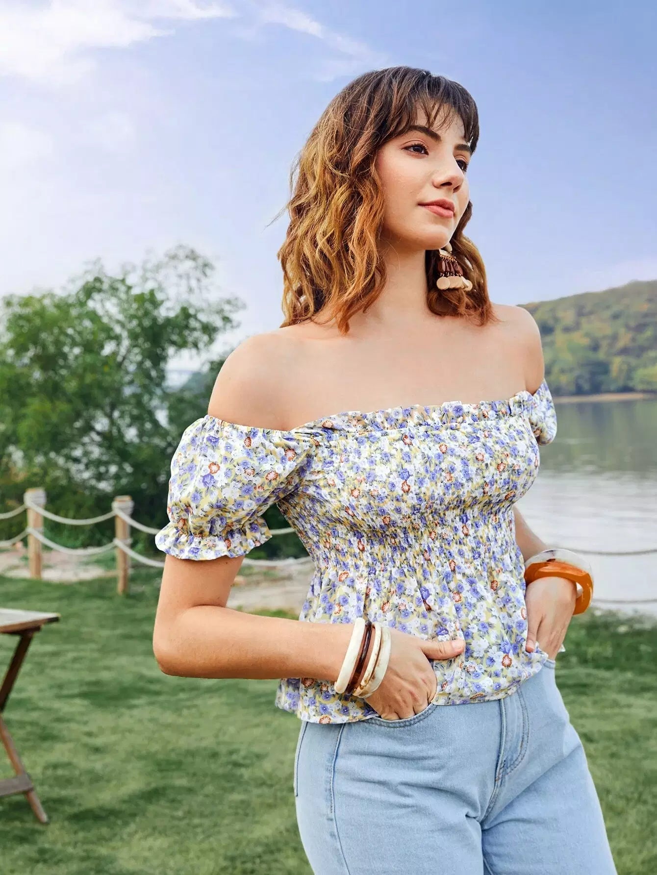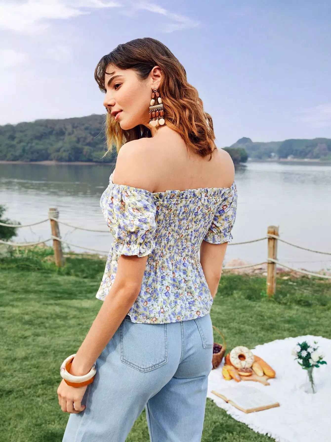 قطعة واحدة ديتسي ديتسي ديتسي فلورال بأكمام منفوشة بأكمام منفوخة مكشوفة الأكتاف