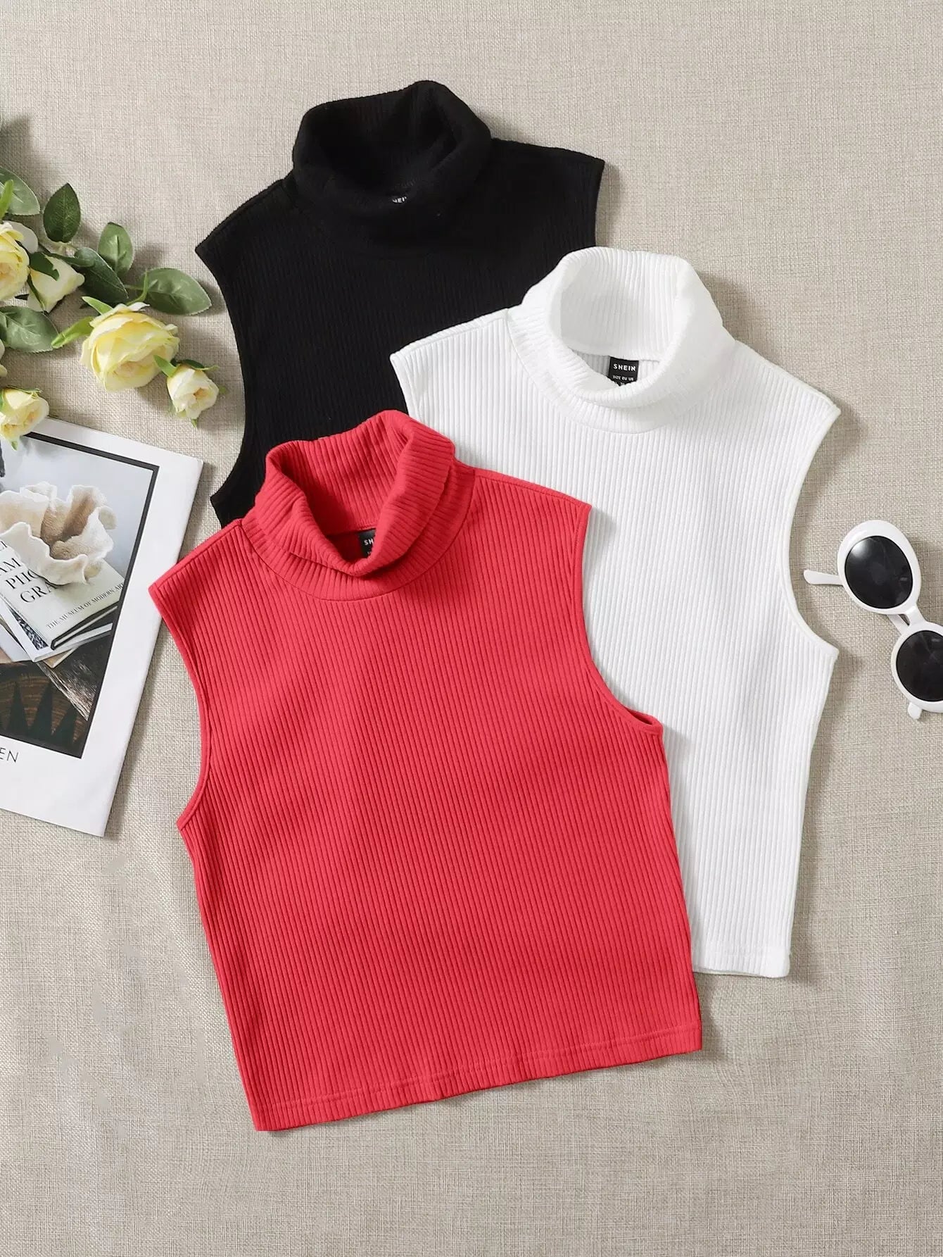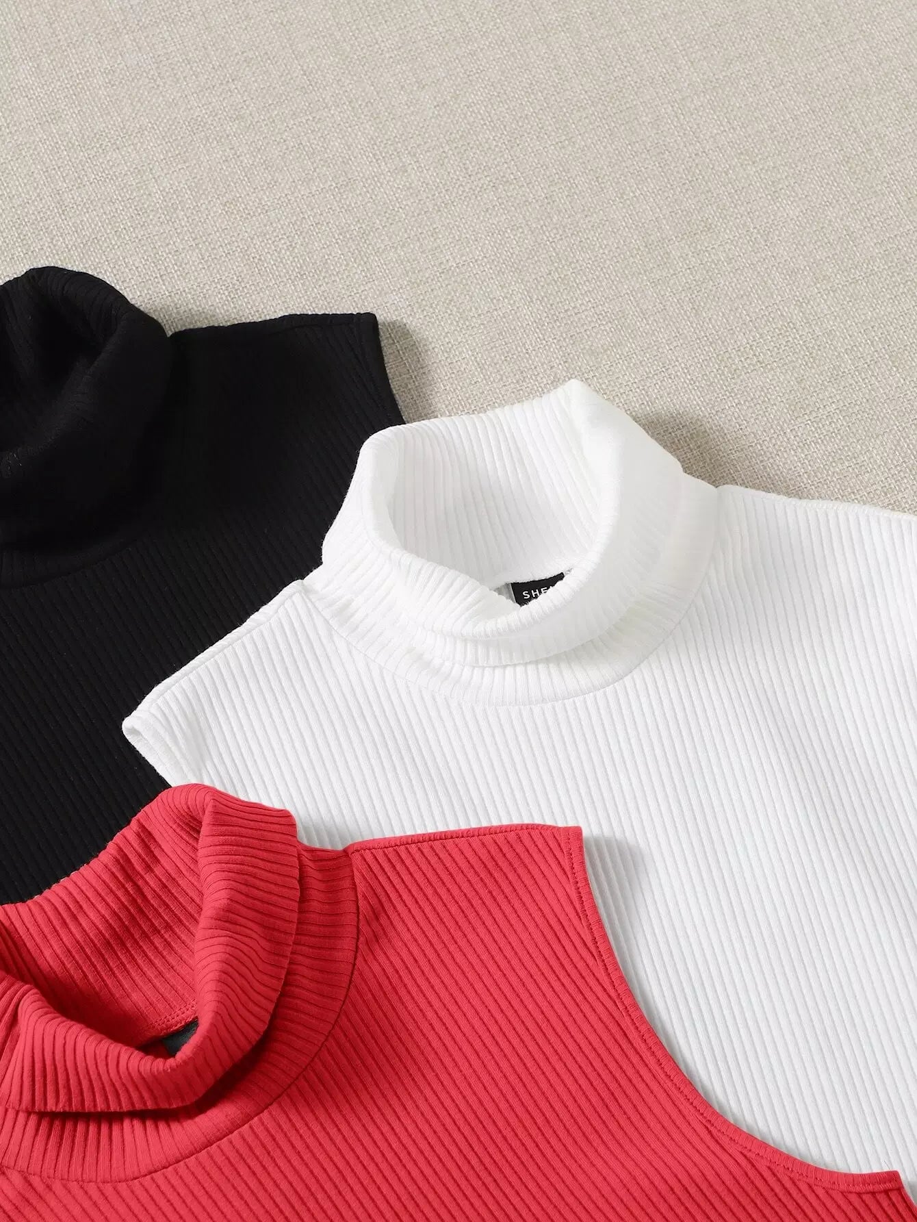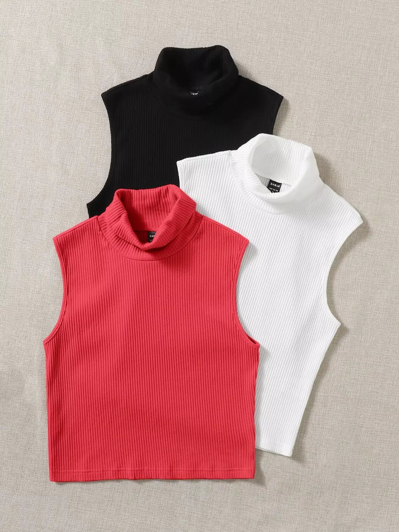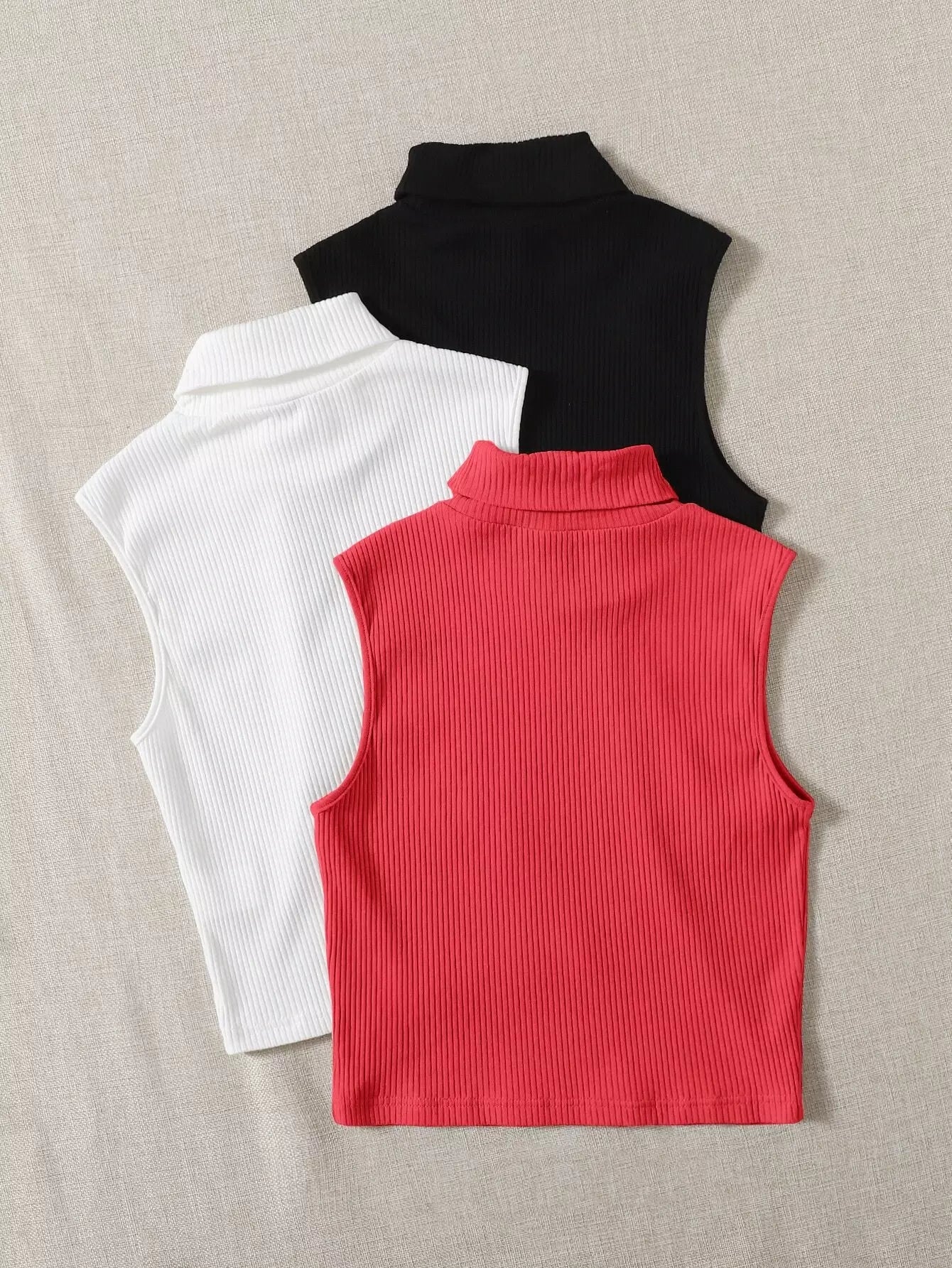 3 قطع تانك بلا أكمام سادة بياقة مدورة مضلعة متماسكة مضلعة