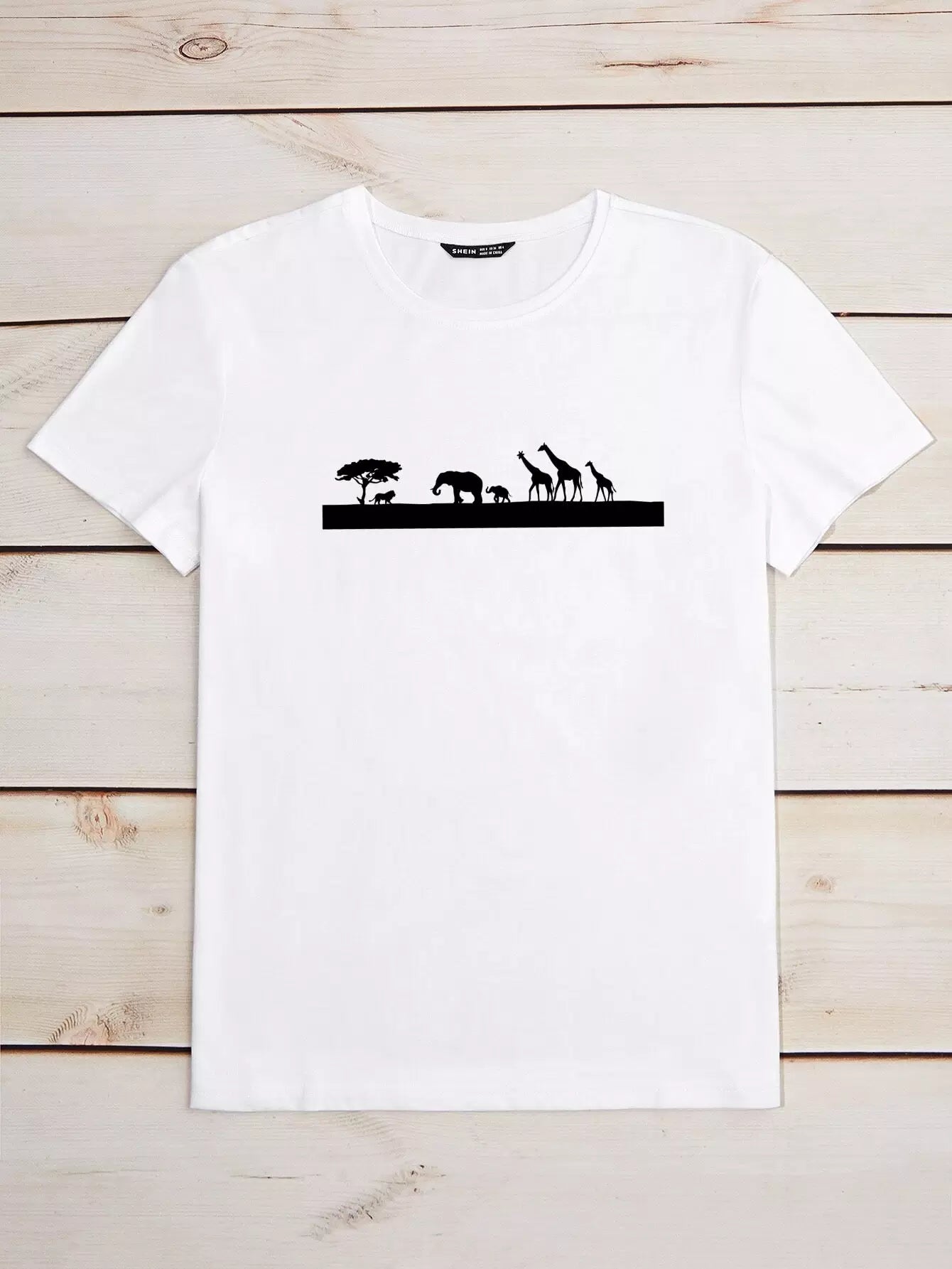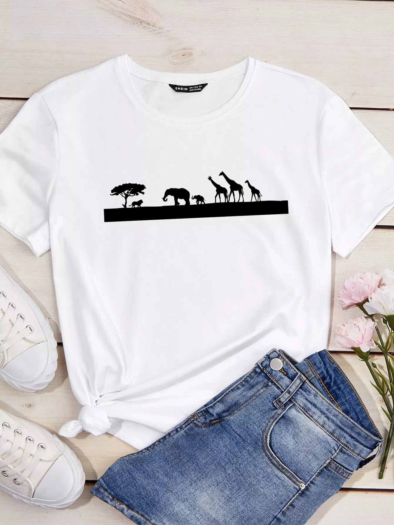 تي شيرت برقبة دائرية بقصّة برقبة دائرية برسمة حيوان