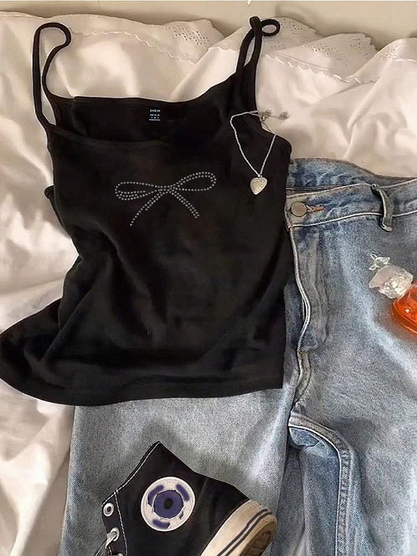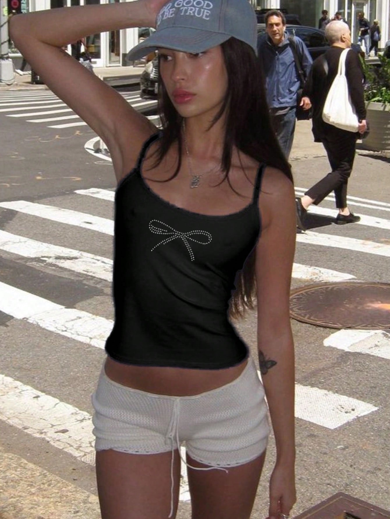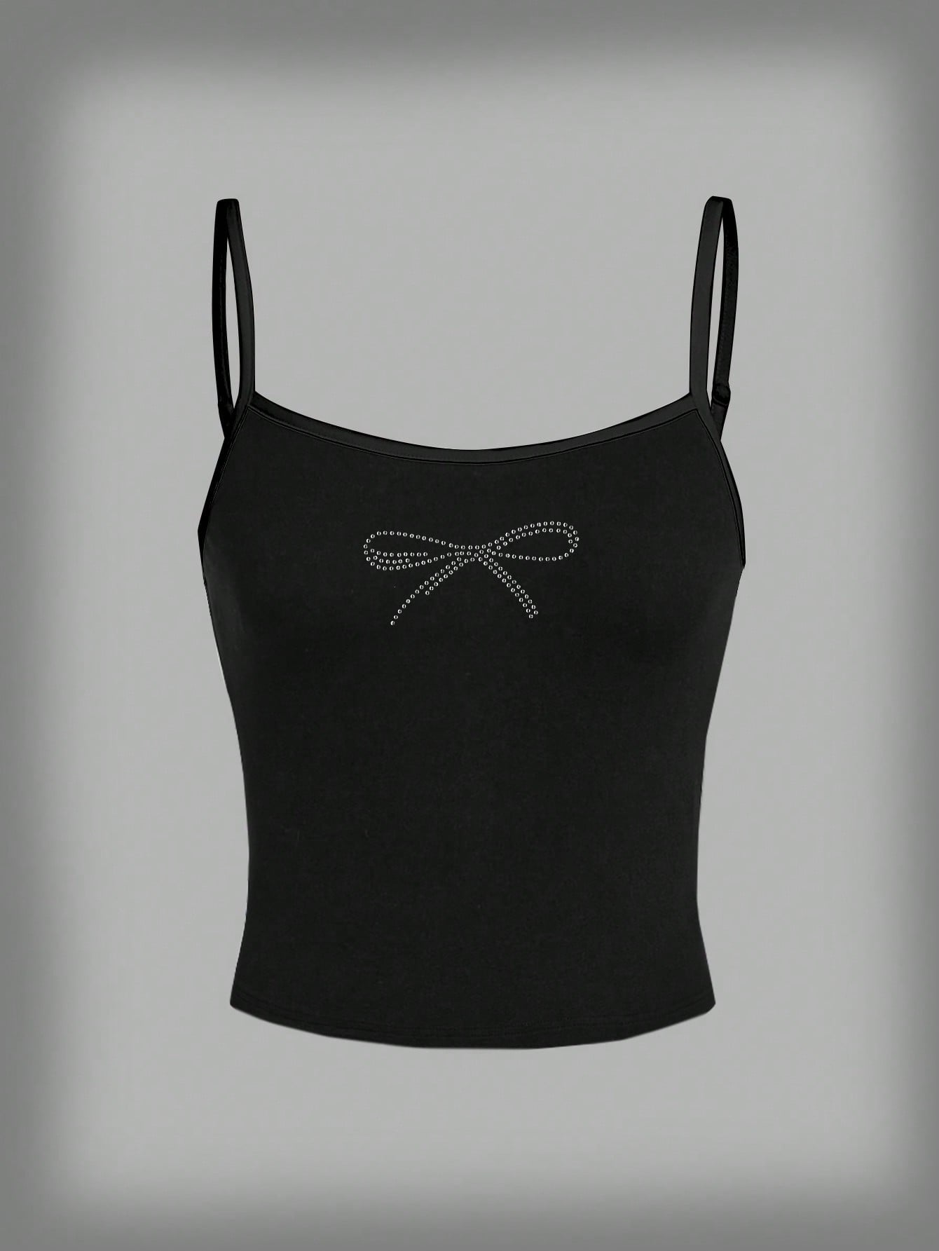 Attitoon Casual Rhinestoned Bowknot Sexy Spaghetti Strap Fitted Tank Top For Women, Summer