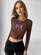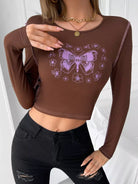 تي شيرت قصير بطبعة فراشات وأزهار مع خياطة علوية