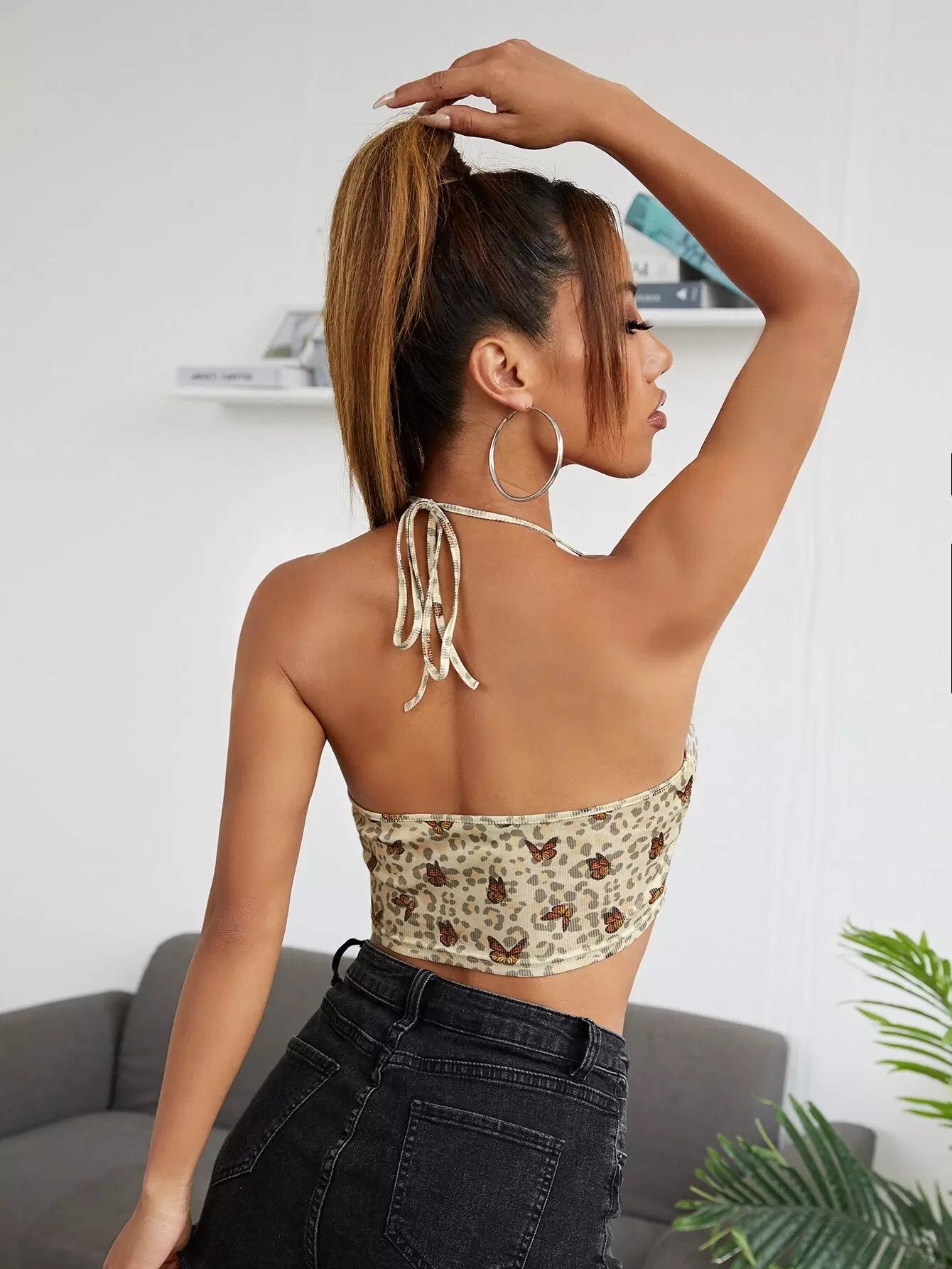 بلوزة قصيرة بطبعة فراشة وفهد مطبوع عليها رسن
