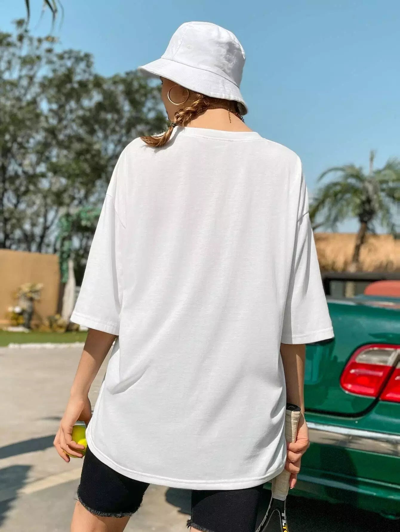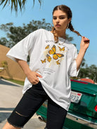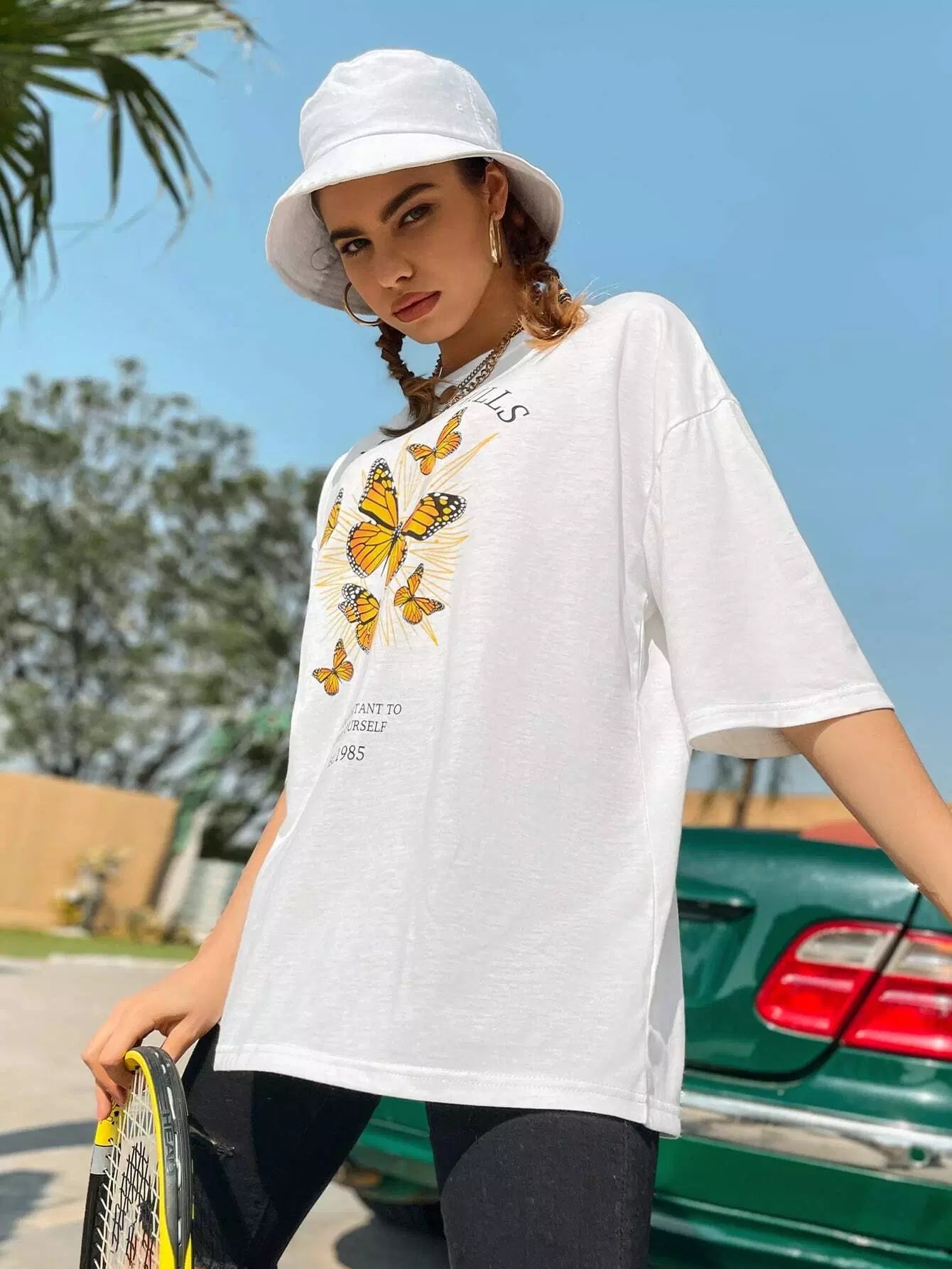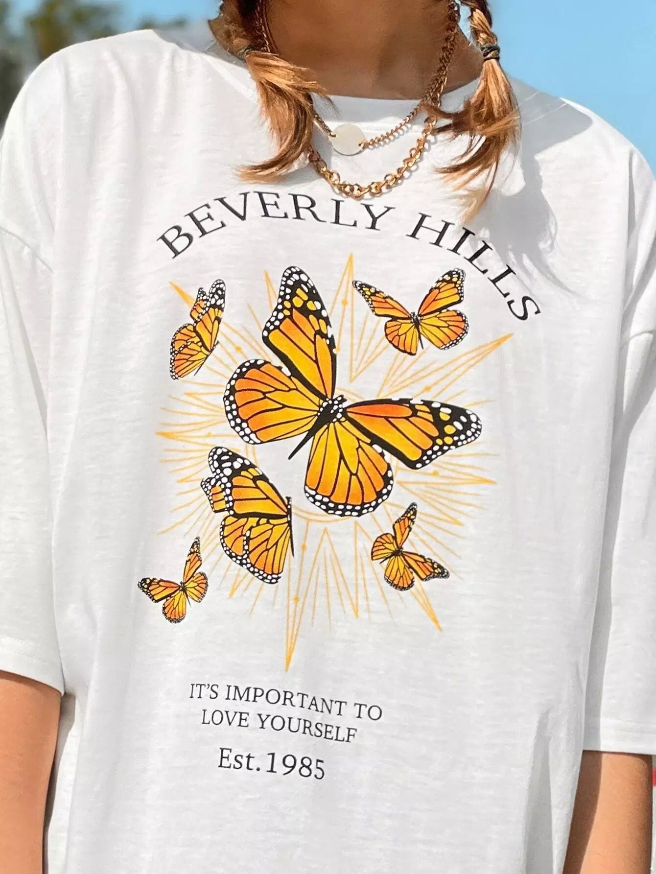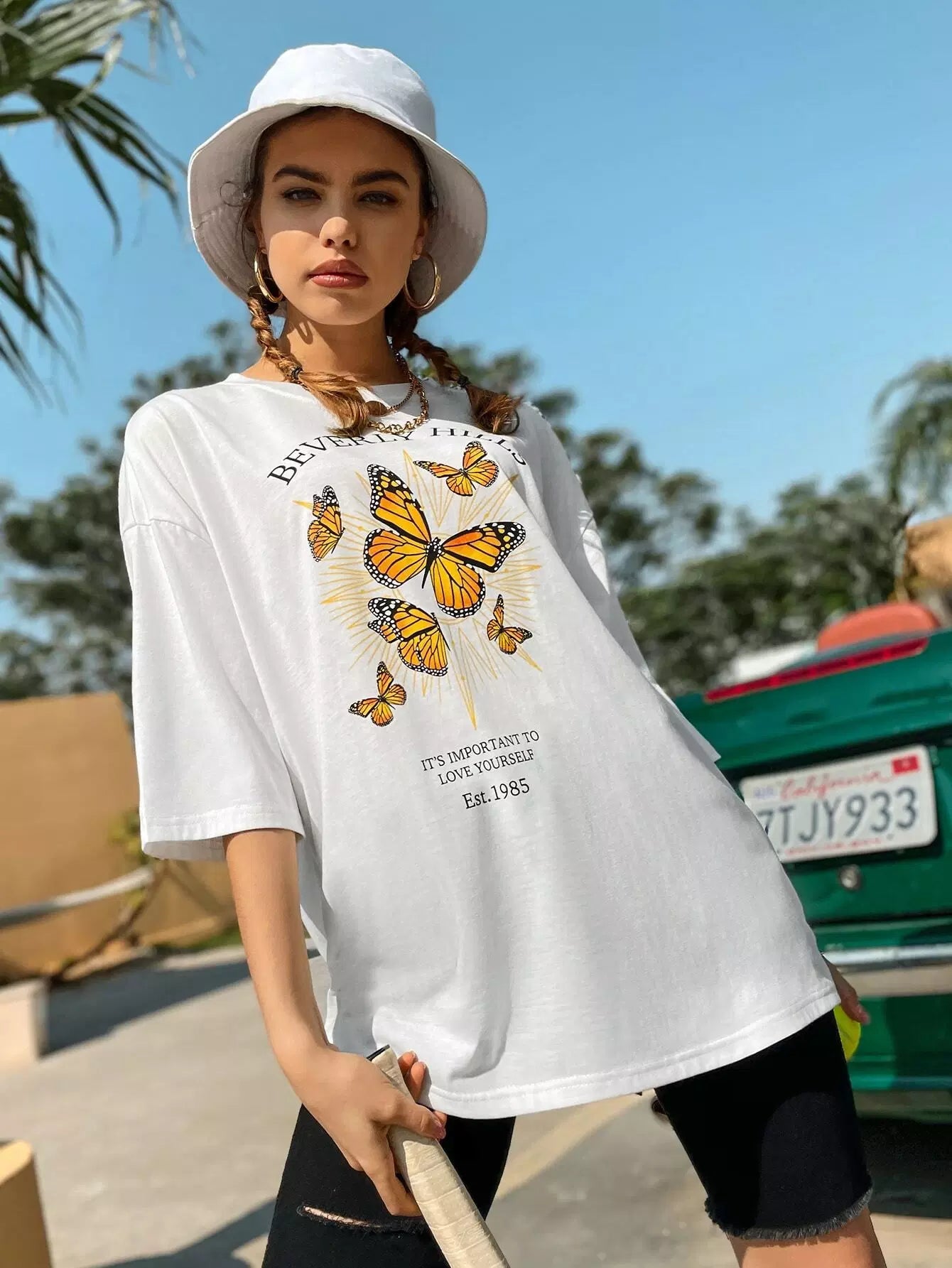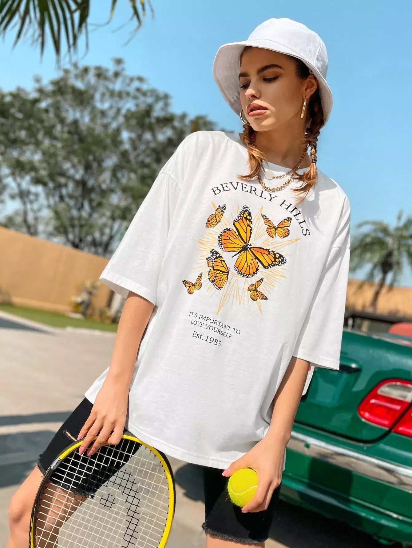 للنساء - تي شيرت كبير الحجم برسومات الفراشة والشعار