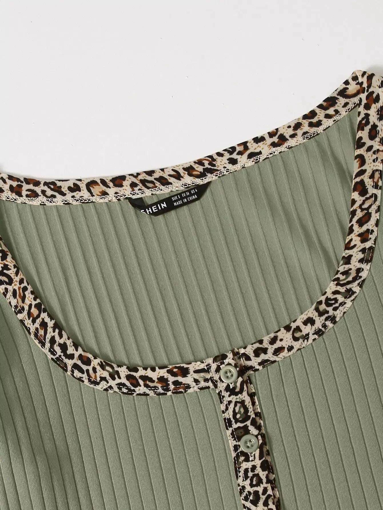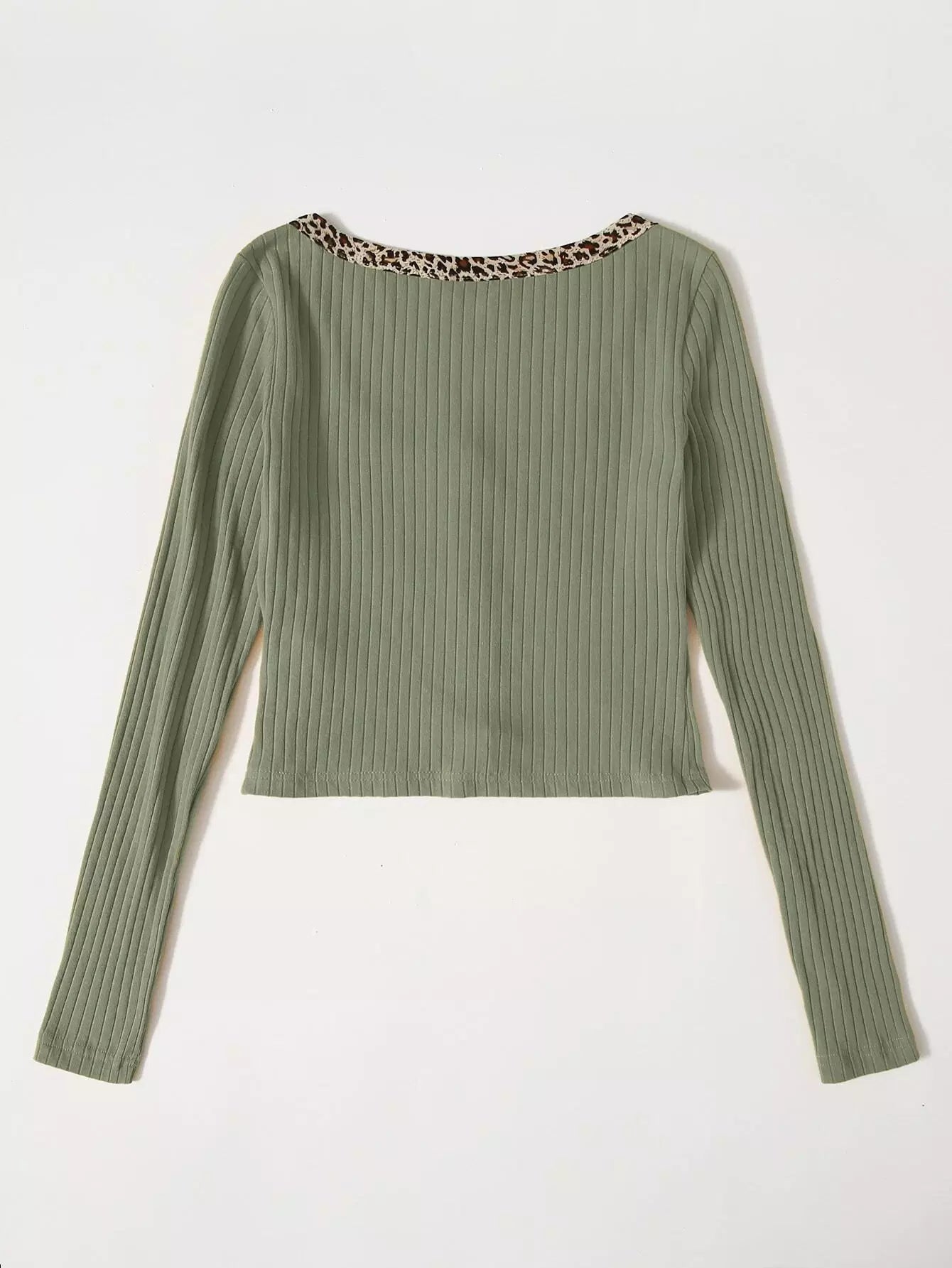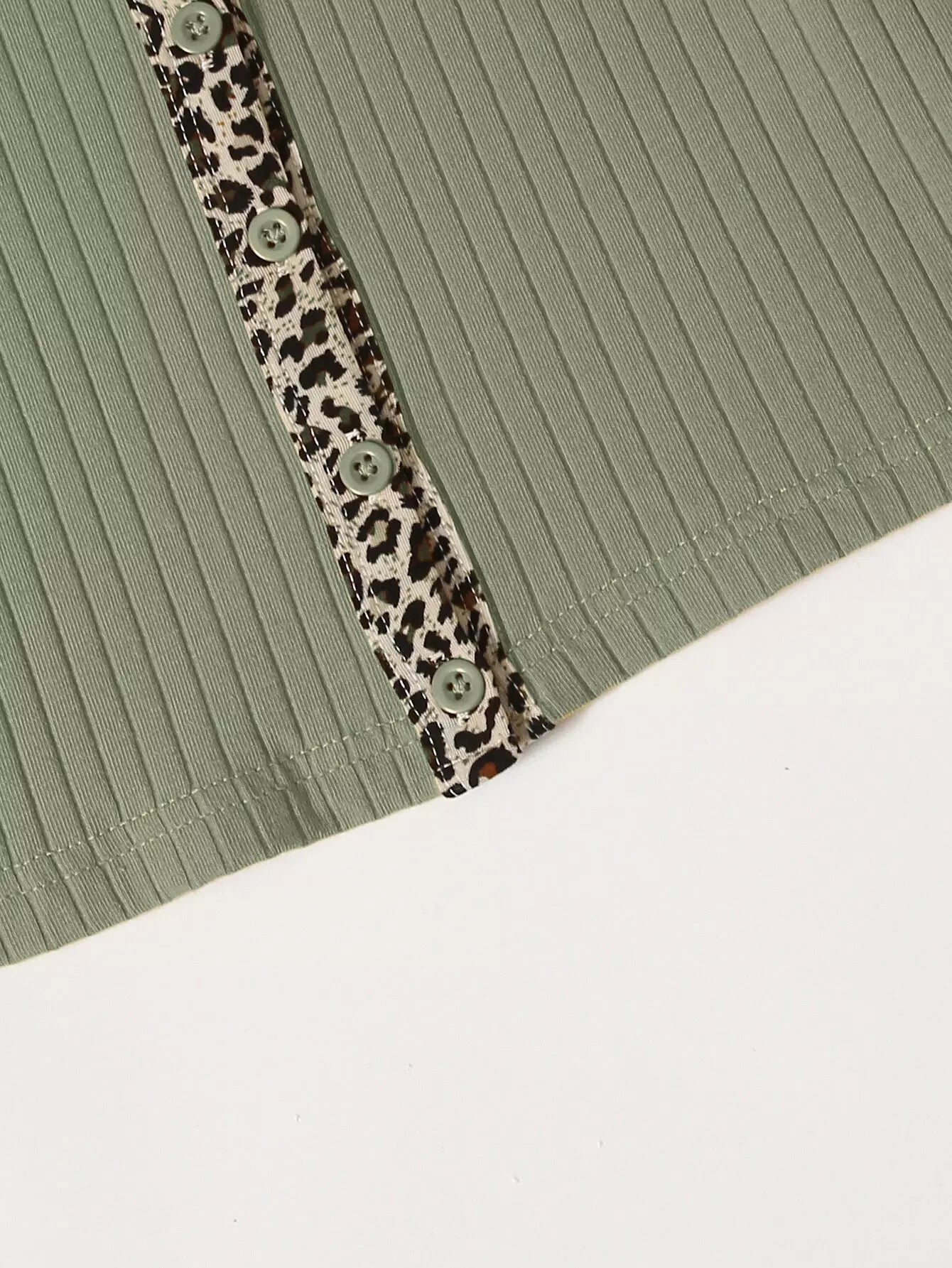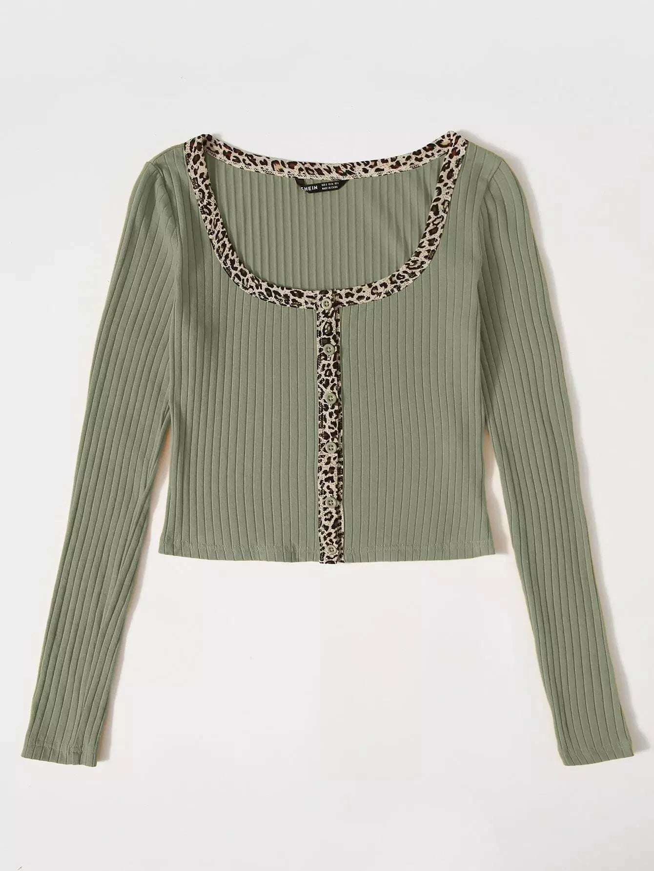 بلوزة محبوكة مضلعة مع أزرار أمامية وحواف متباينة من جلد النمر
