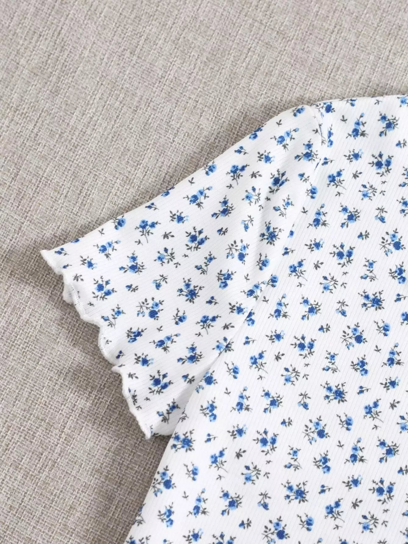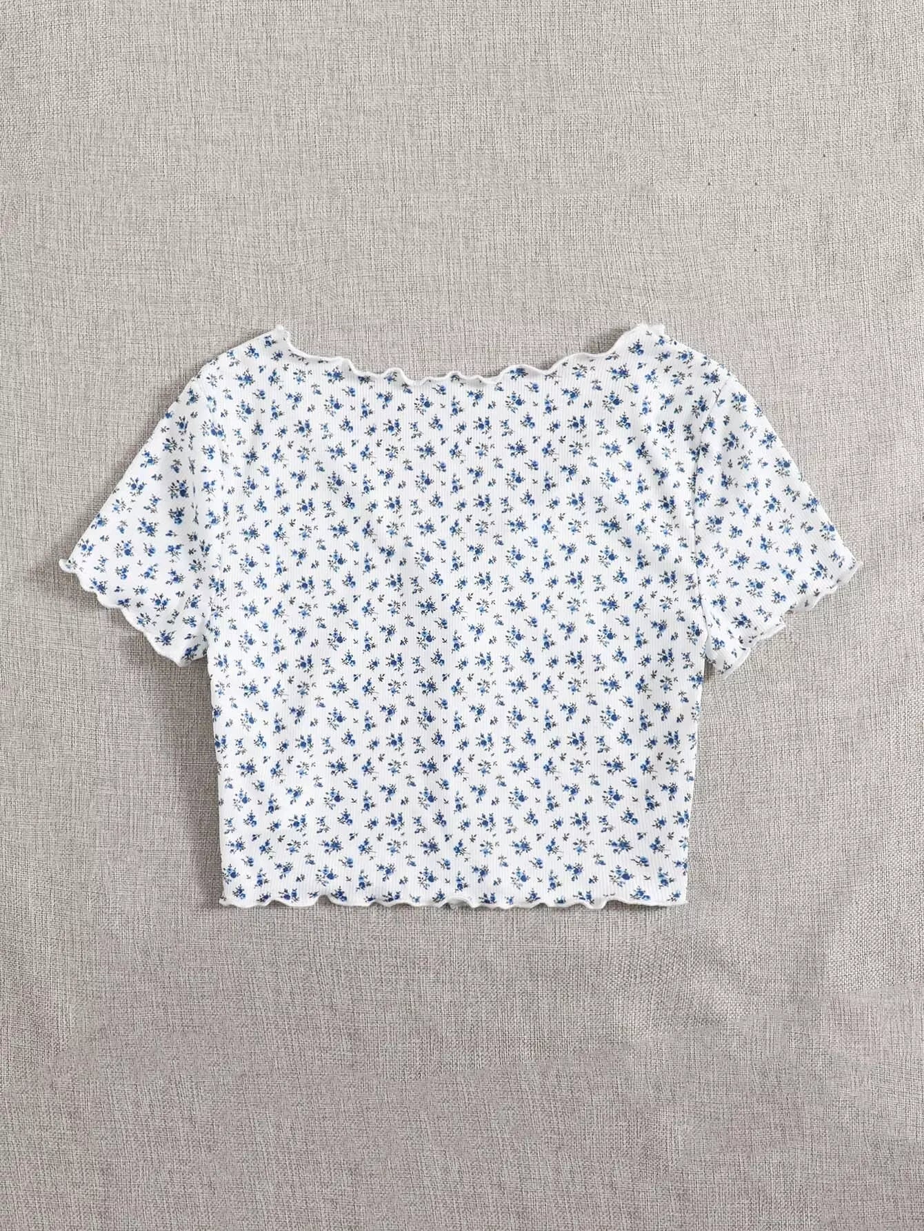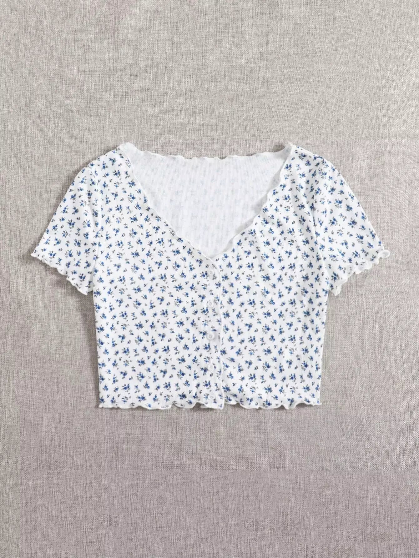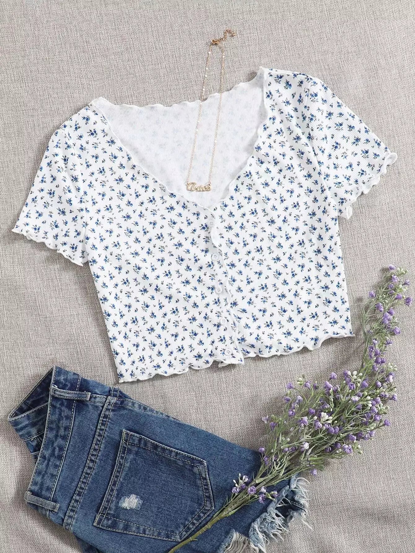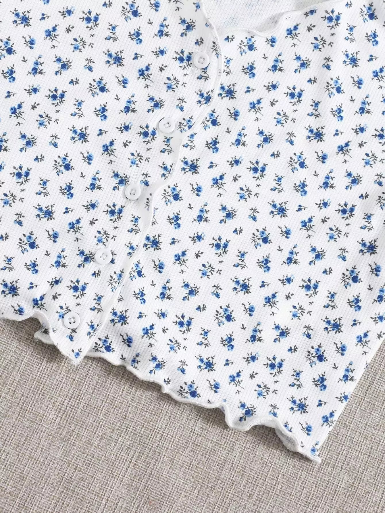 تي شيرت بأزرار أمامية مزين بأزرار من الأمام بحواف من الخس مزين بزهور
