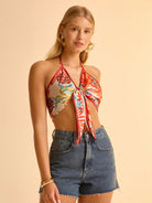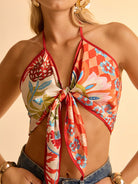 women CAJUNI Women's Boho-Style Orange Tropical Floral Print V-Neck Tie Knot Crop Top