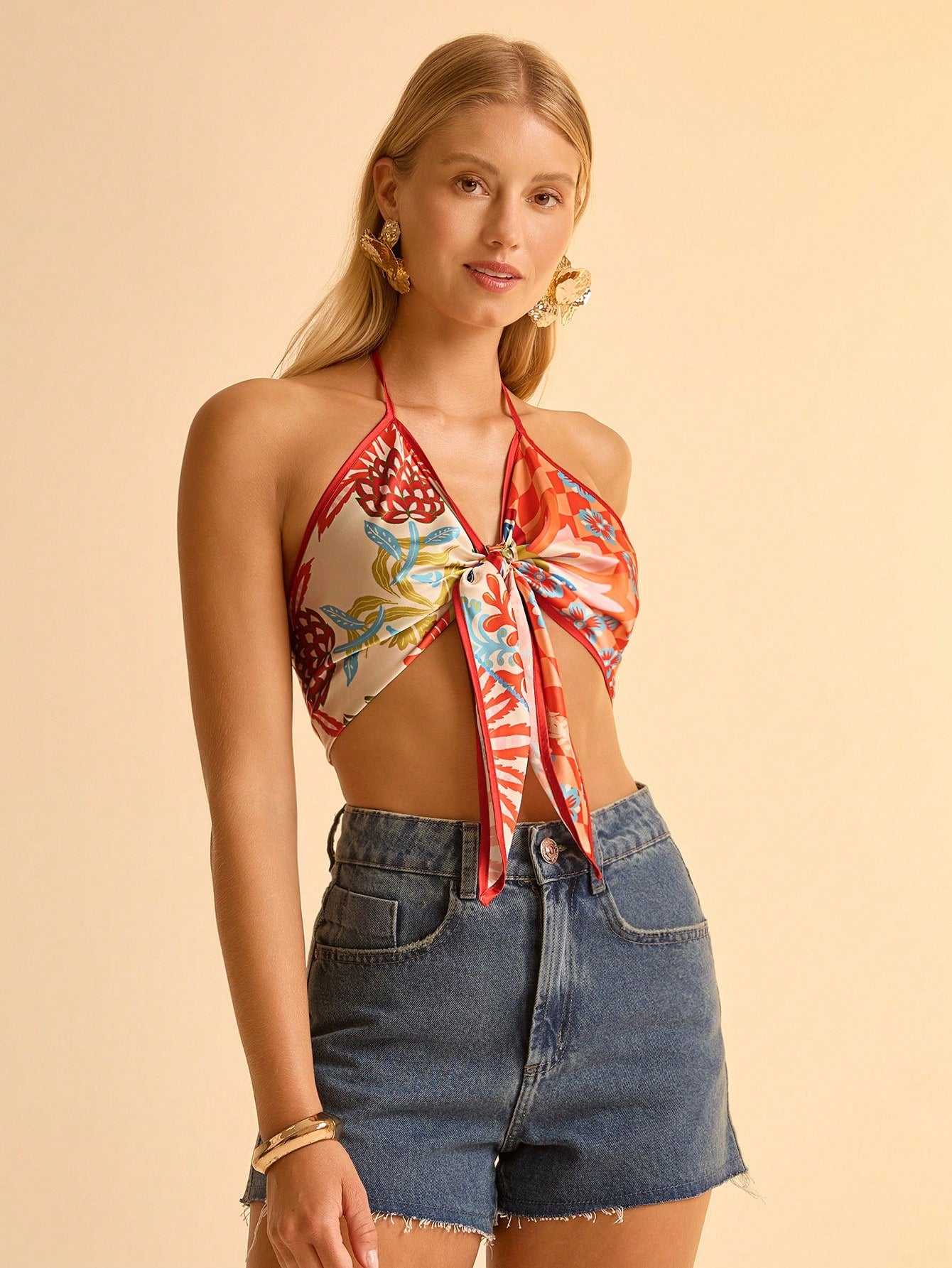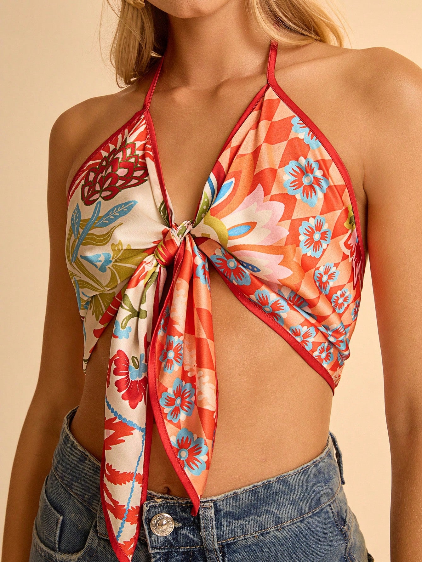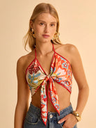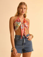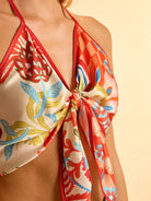 بلوزة CAJUNI النسائية القصيرة ذات النمط البوهيمي، ذات الطباعة الزهرية الاستوائية البرتقالية، وفتحة رقبة على شكل حرف V، وربطة عنق، وعقدة