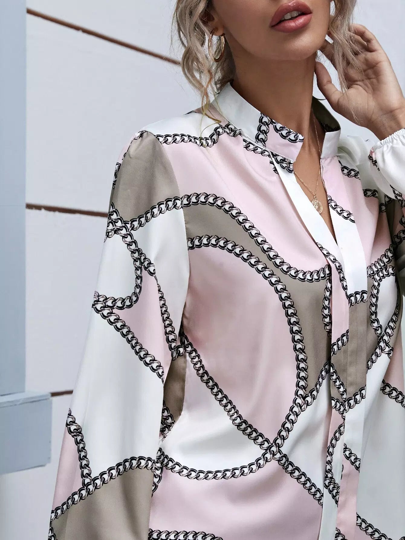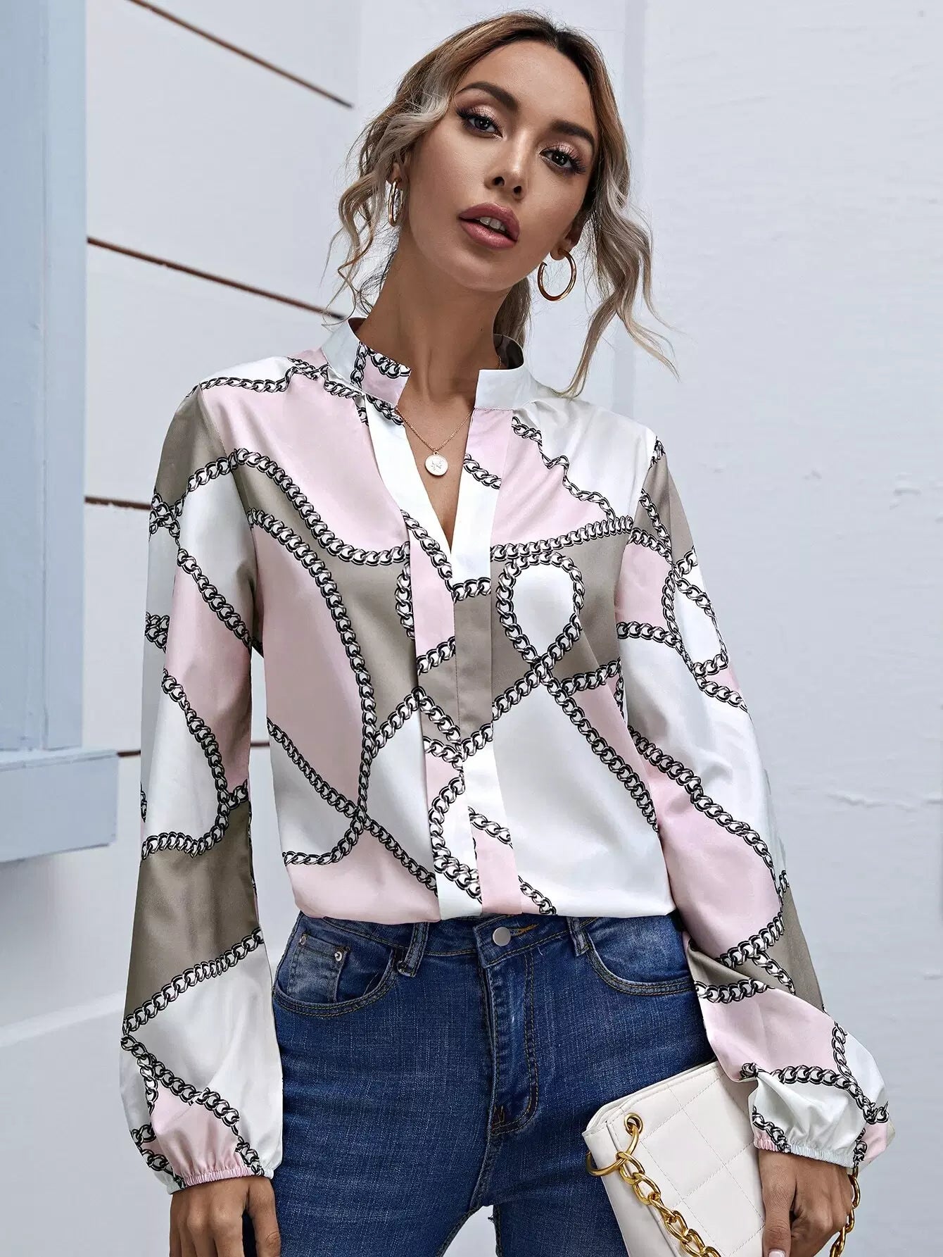 بلوزة بأكمام رقبة منقسمة على شكل سلسلة مطبوع عليها أكمام فلاحين