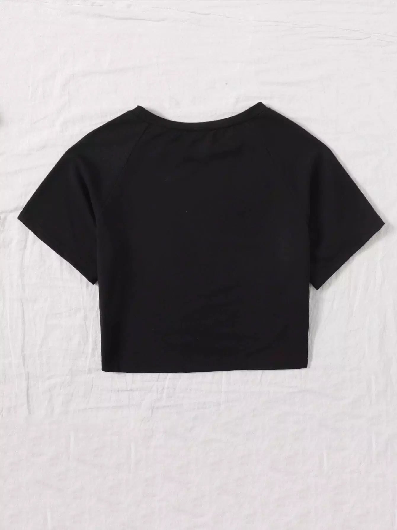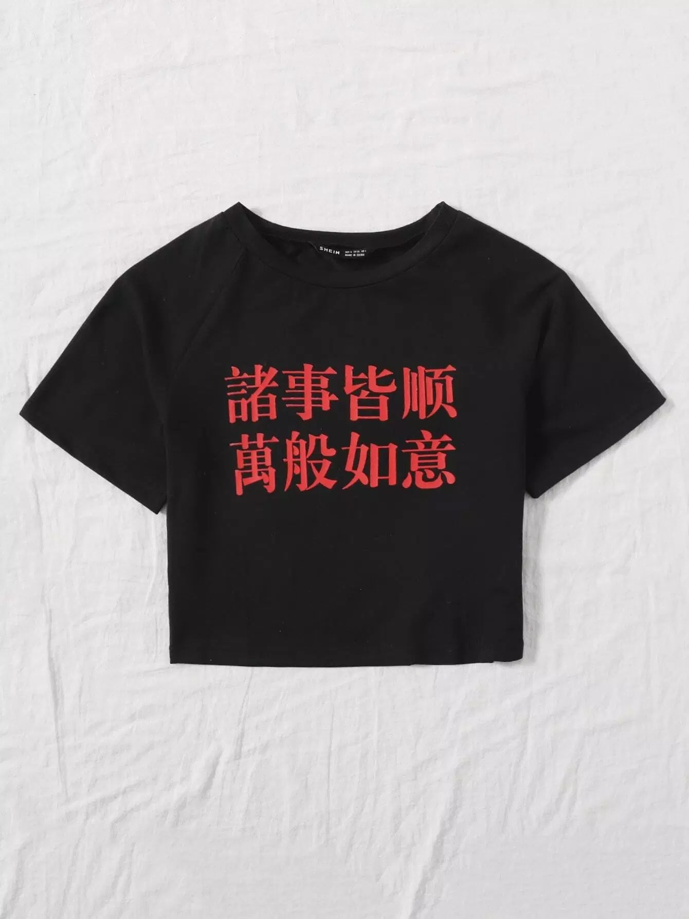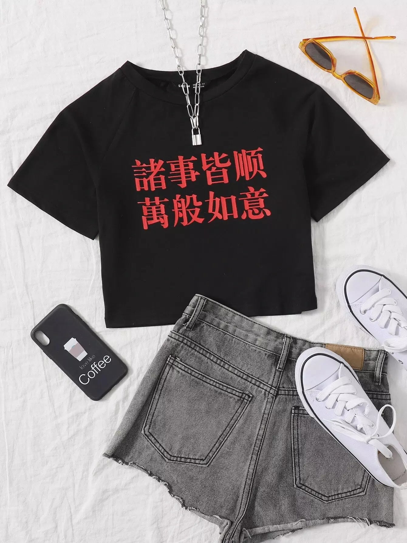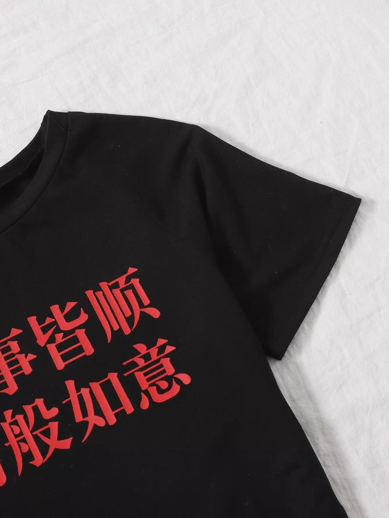 للنساء - تي شيرت قصير بأكمام راجلان برسومات الحروف الصينية