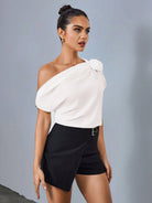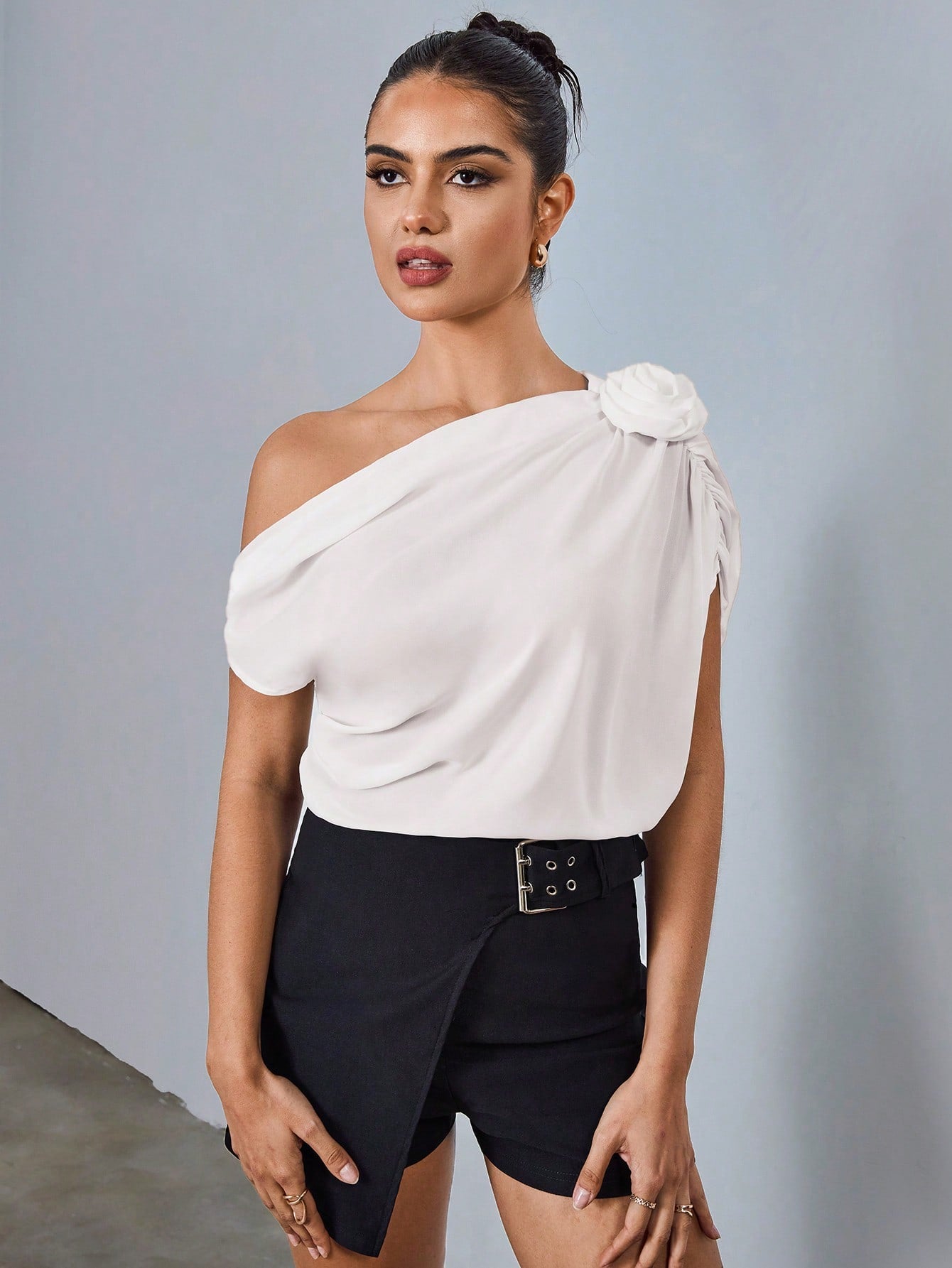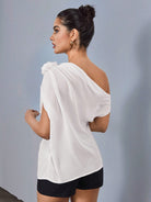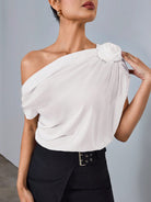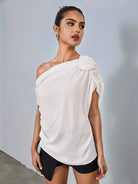 Chiquease Chiffon 3D Hand-Crafted Floral Print Loose Fit Asymmetric Shoulder Short Sleeve Pleated Sheer