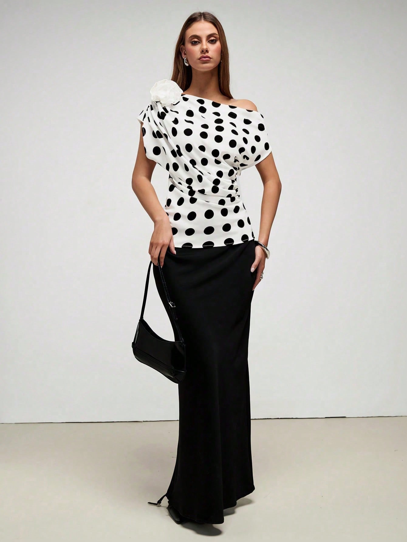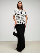 Chiquease Women's Elegant Floral 3D Pleated Oblique Shoulder Polka Dot Blouse