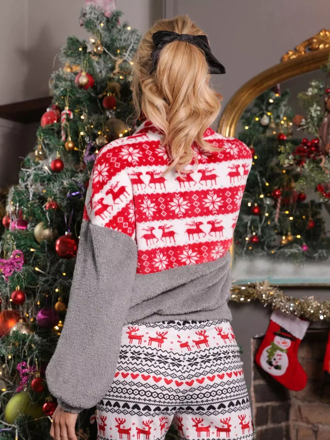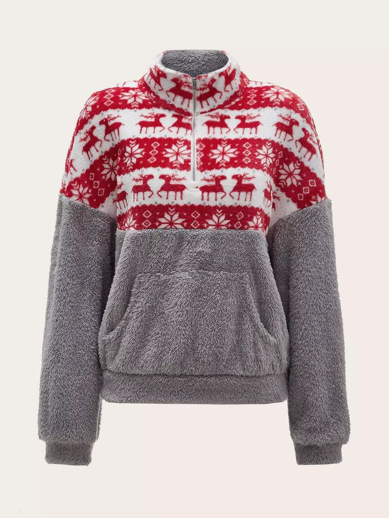 النساء - بلوفر تيدي بنمط لوحة عيد الميلاد بنصف سحاب وفتحة