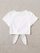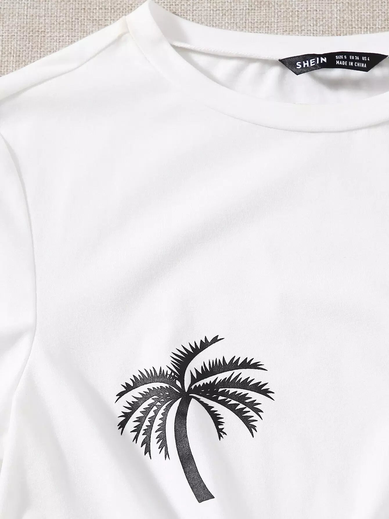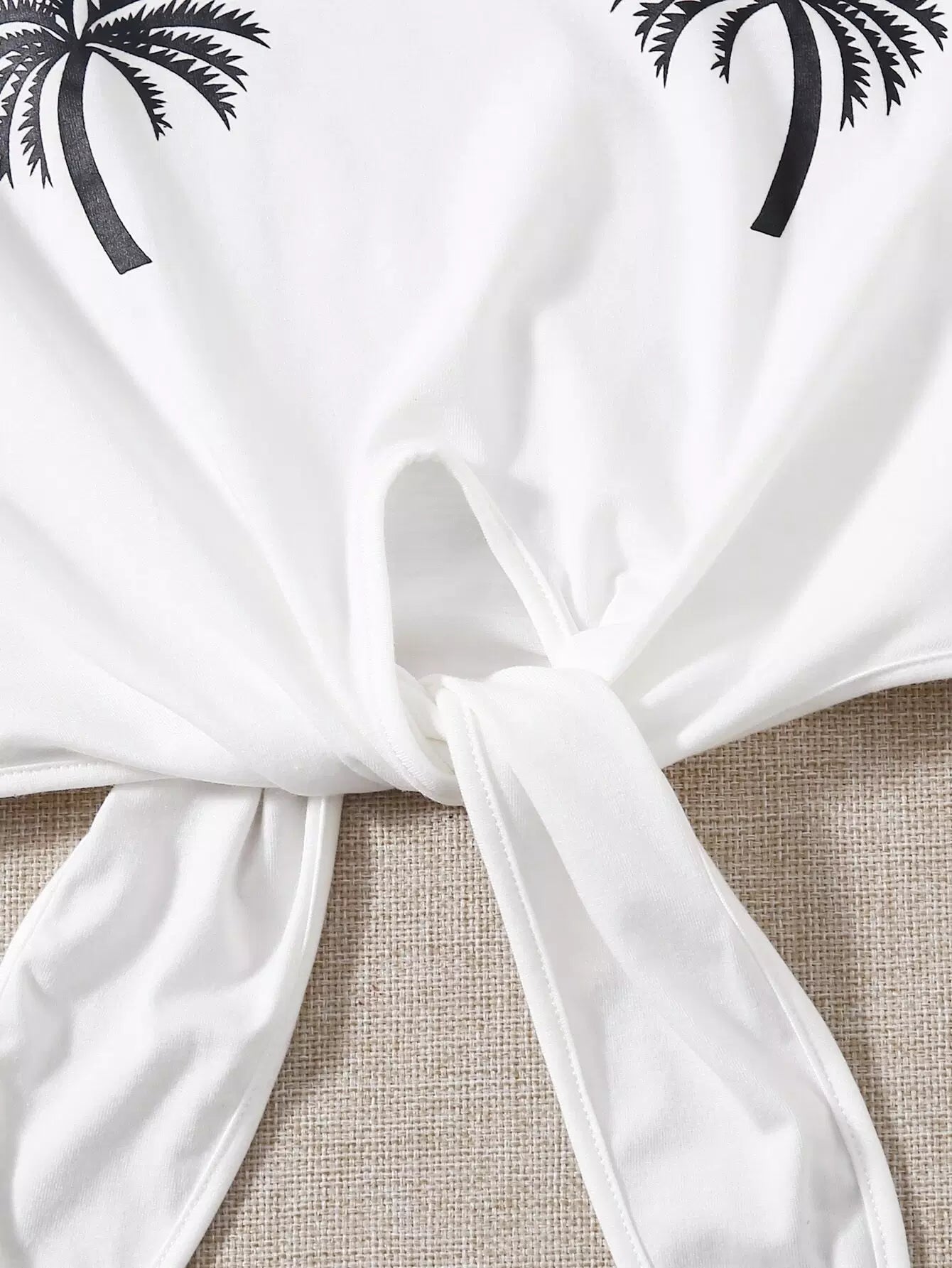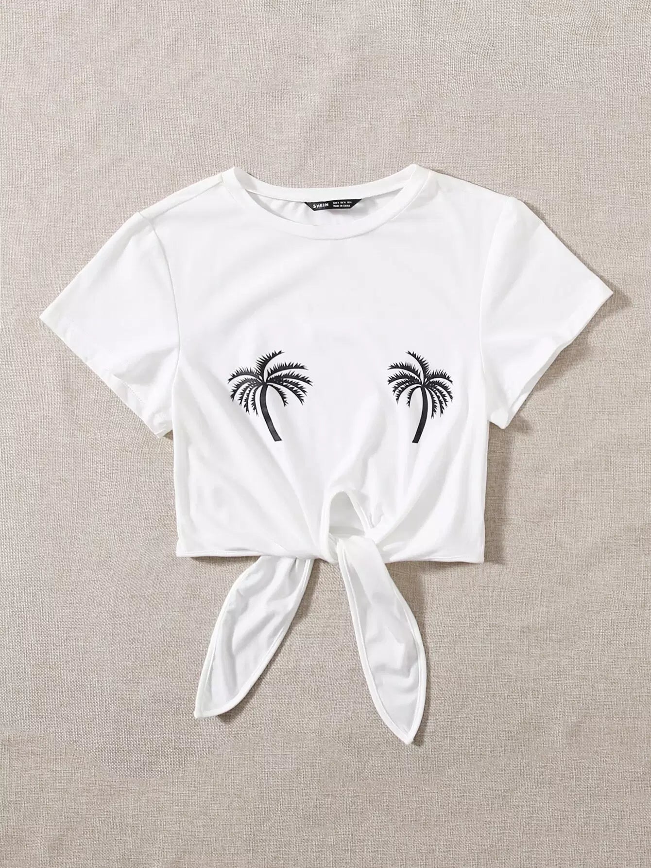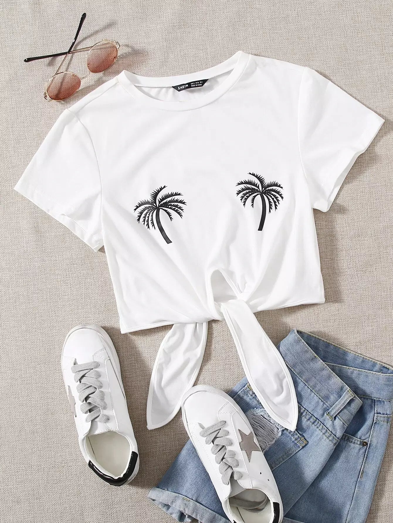 تي شيرت مطبوع بعقدة أمامية بطبعة شجرة جوز الهند