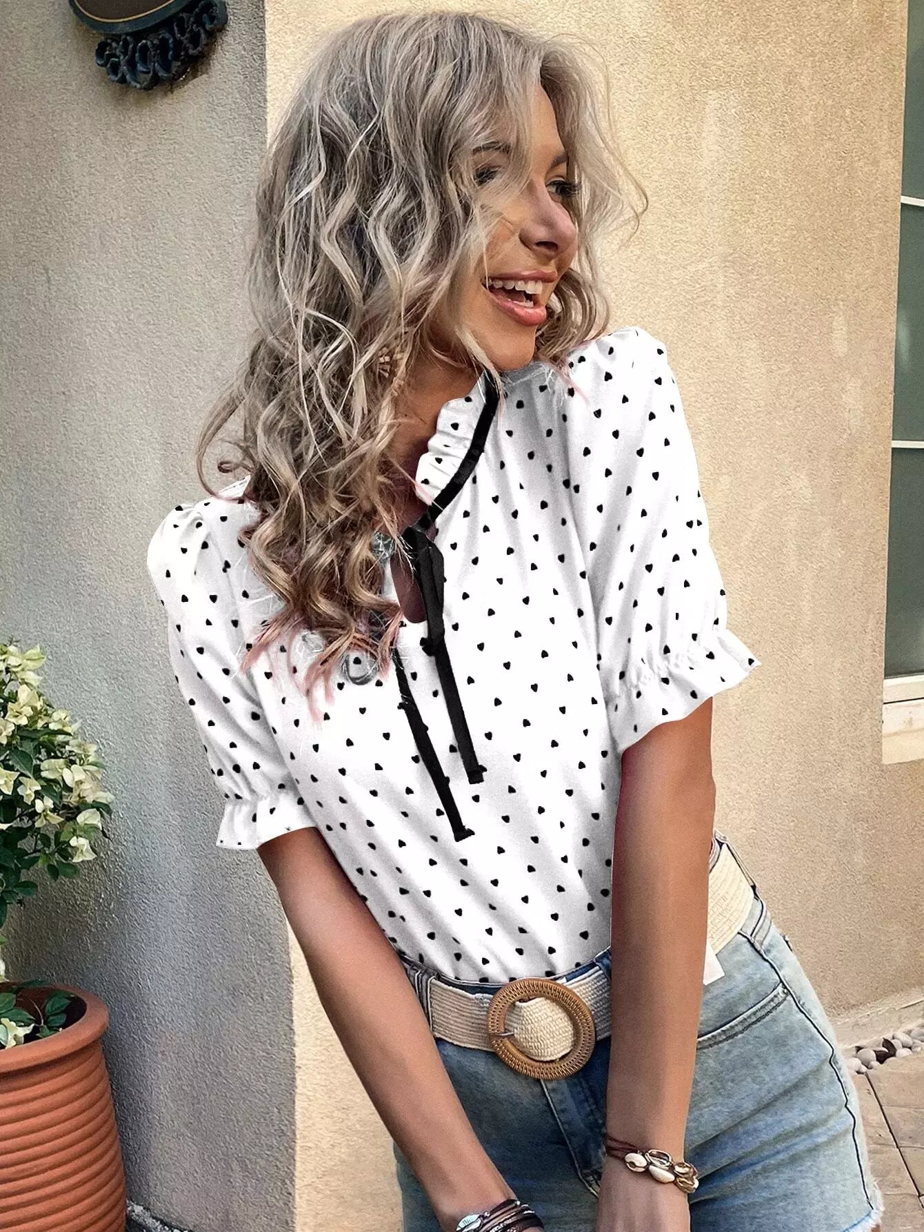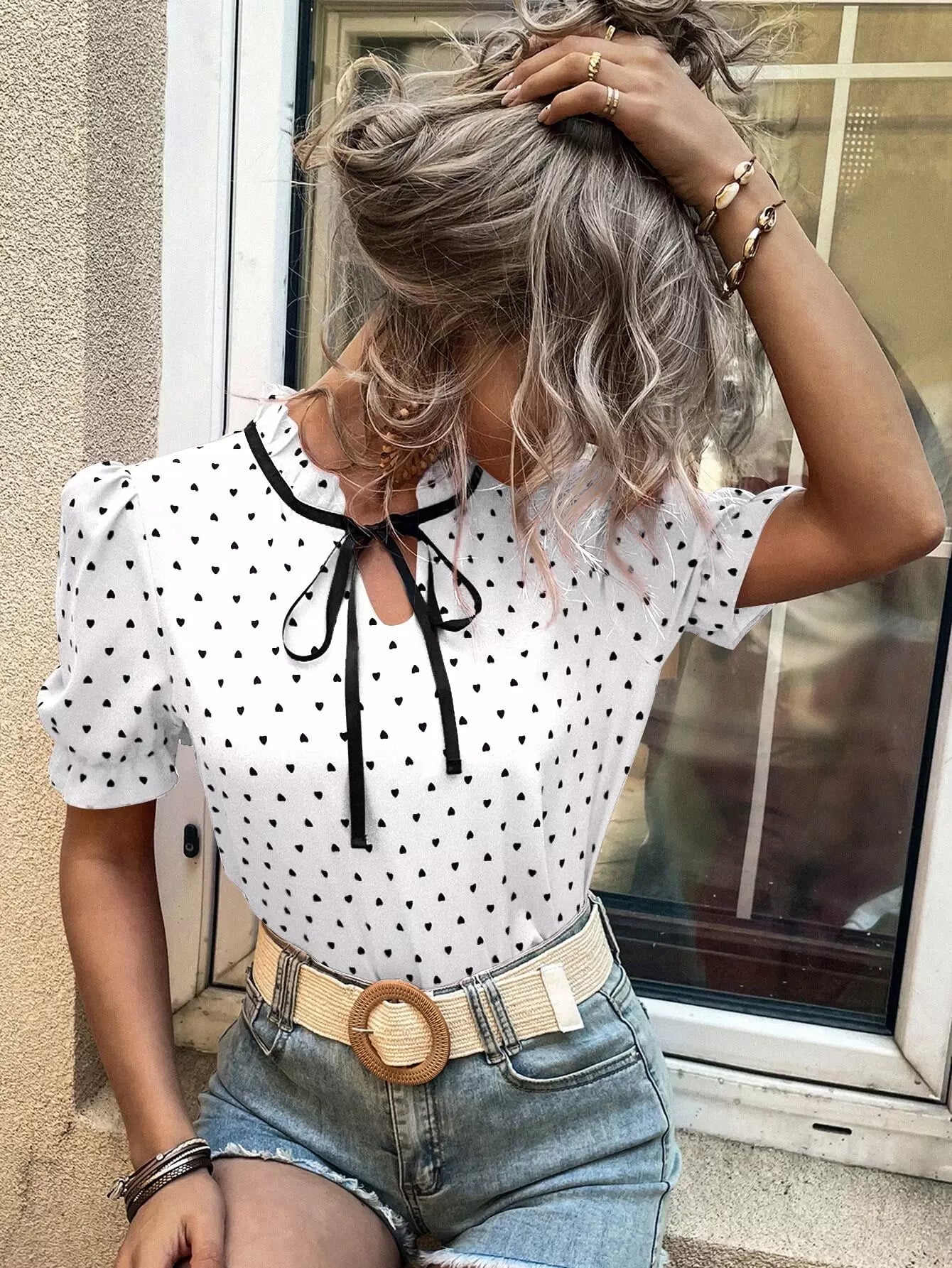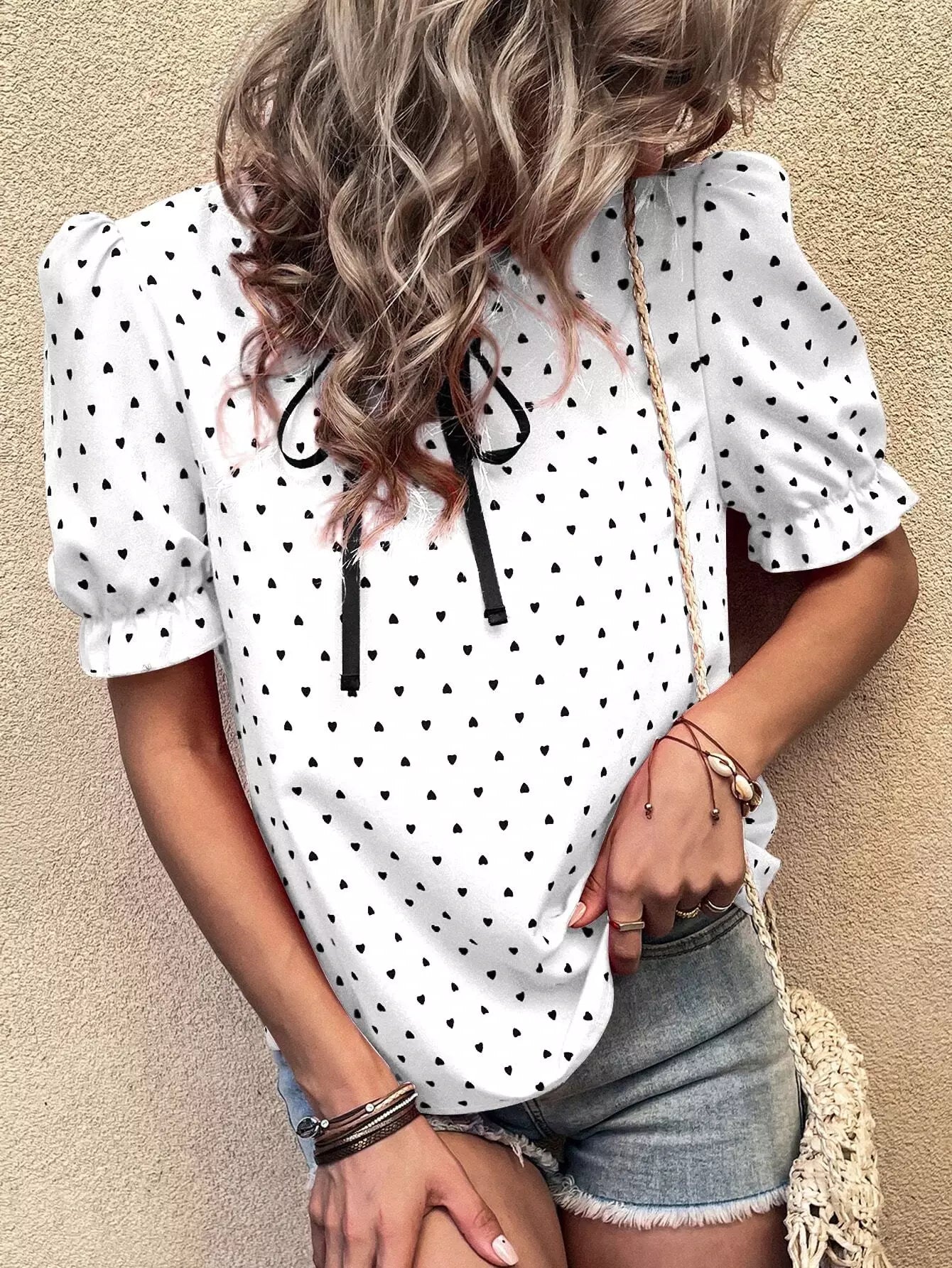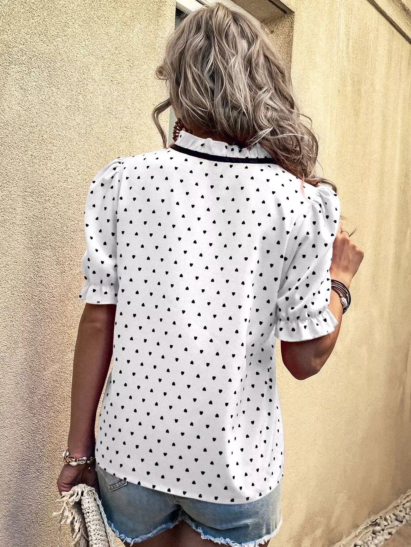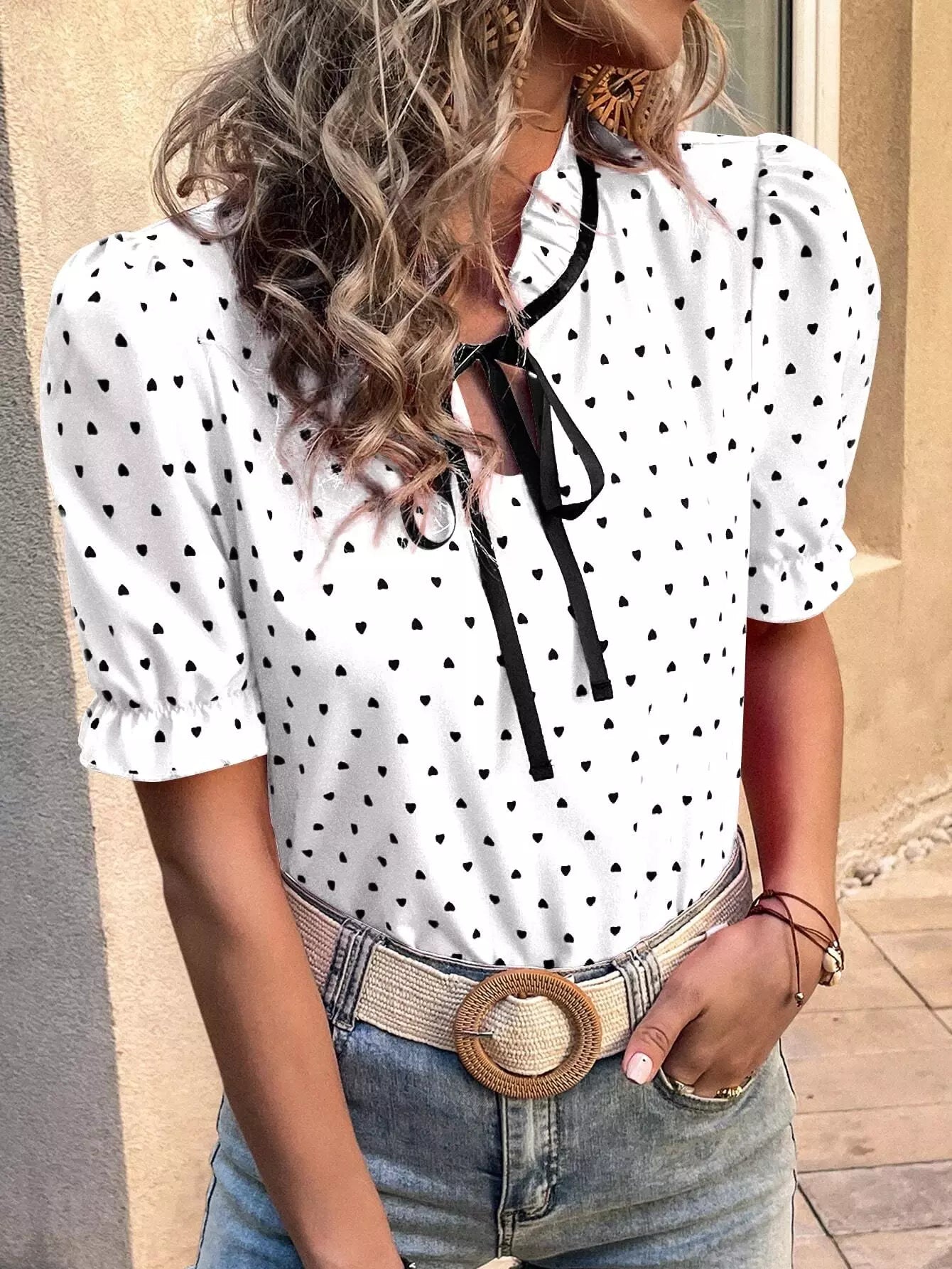 بلوزة بأكمام منفوشة على شكل قلب مطبوع عليها كشكش بربطة عنق منتفخة