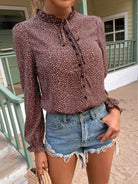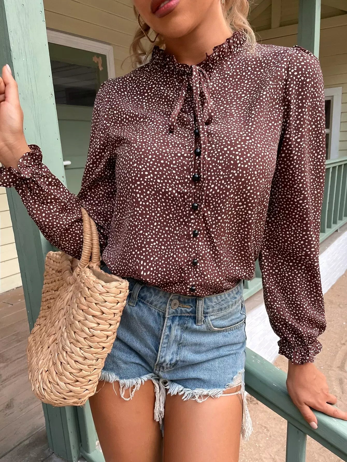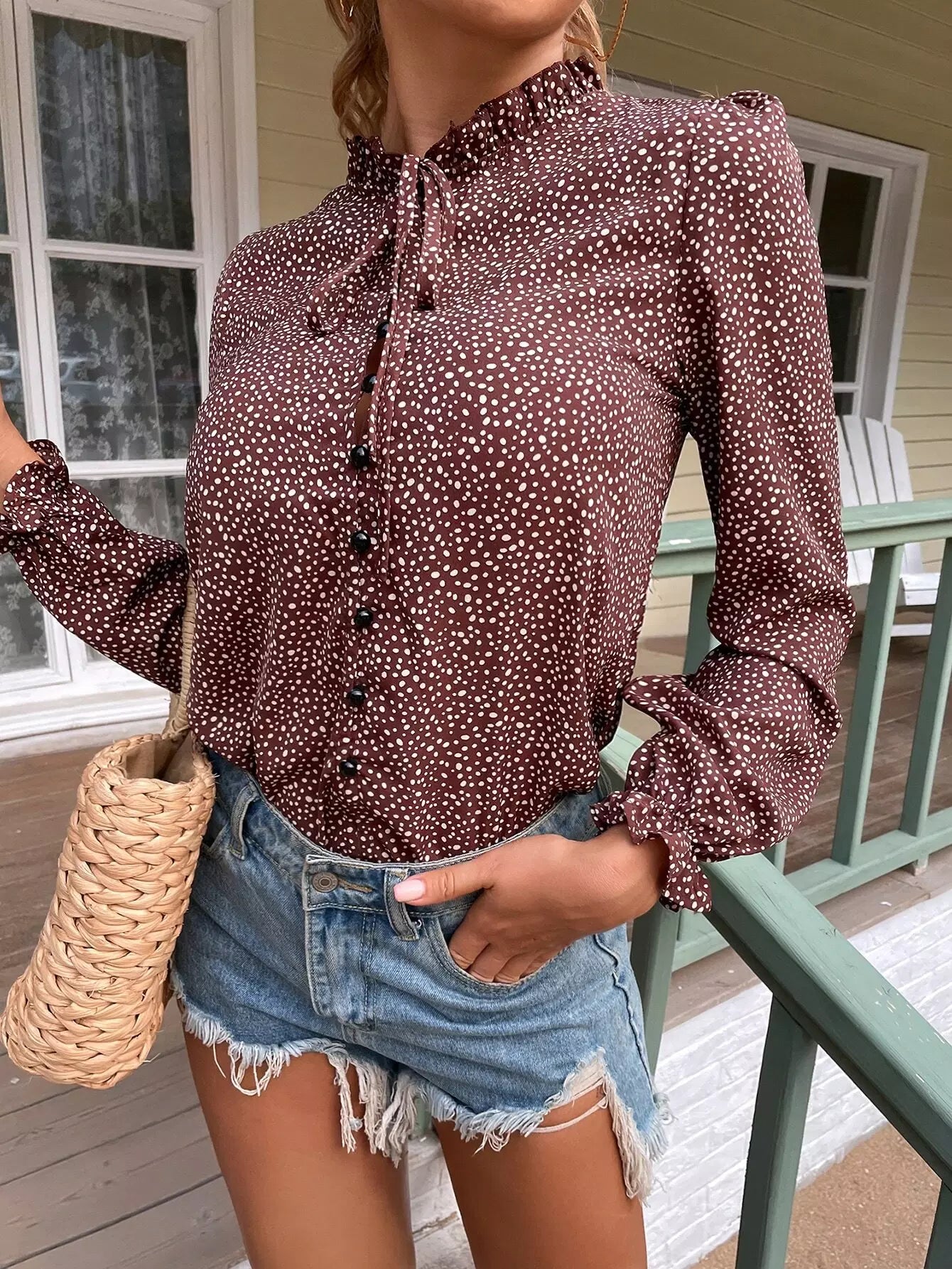 بلوزة مطبوعة على شكل حلويات مطبوعة بربطة عنق على شكل لؤلؤ بأزرار أمامية