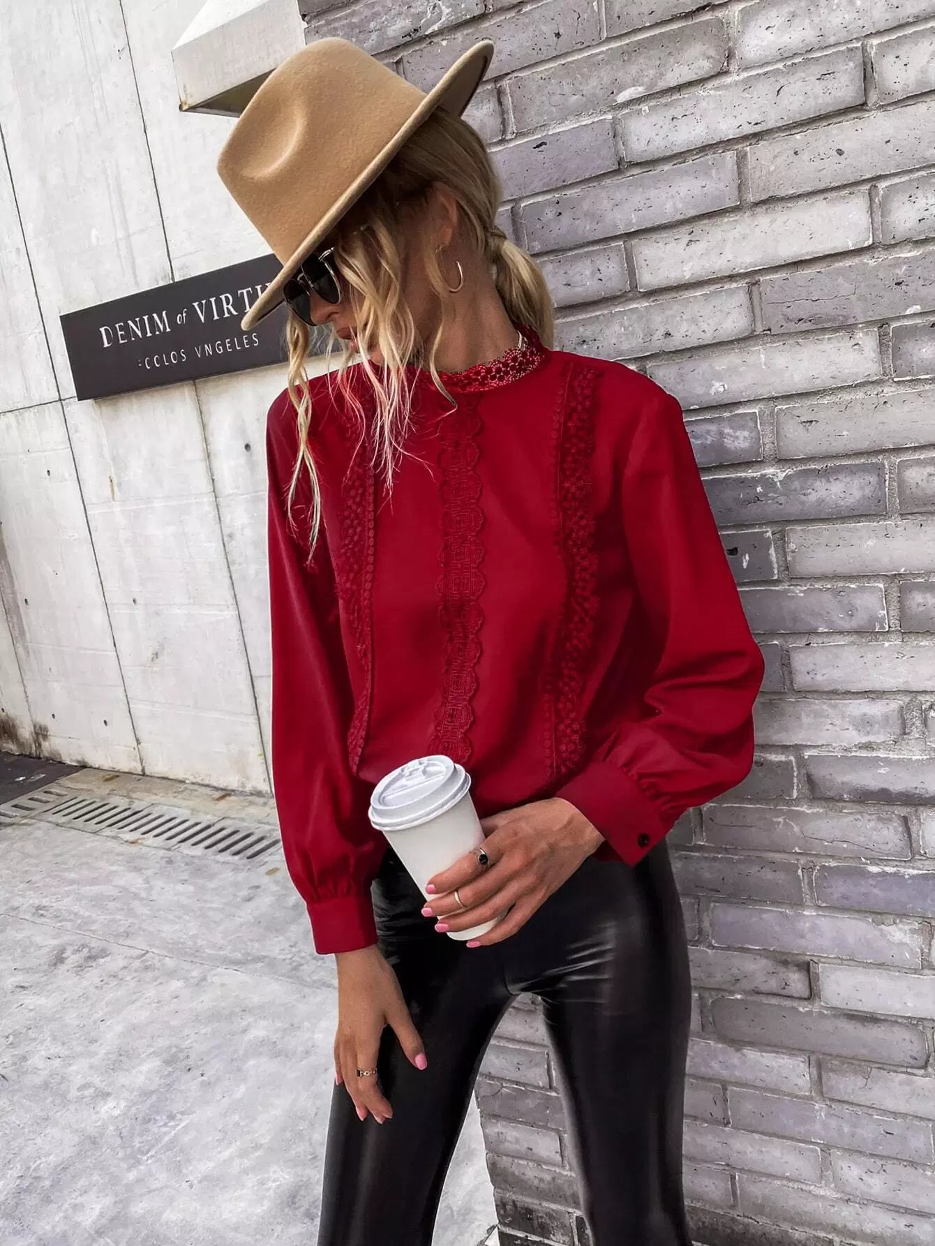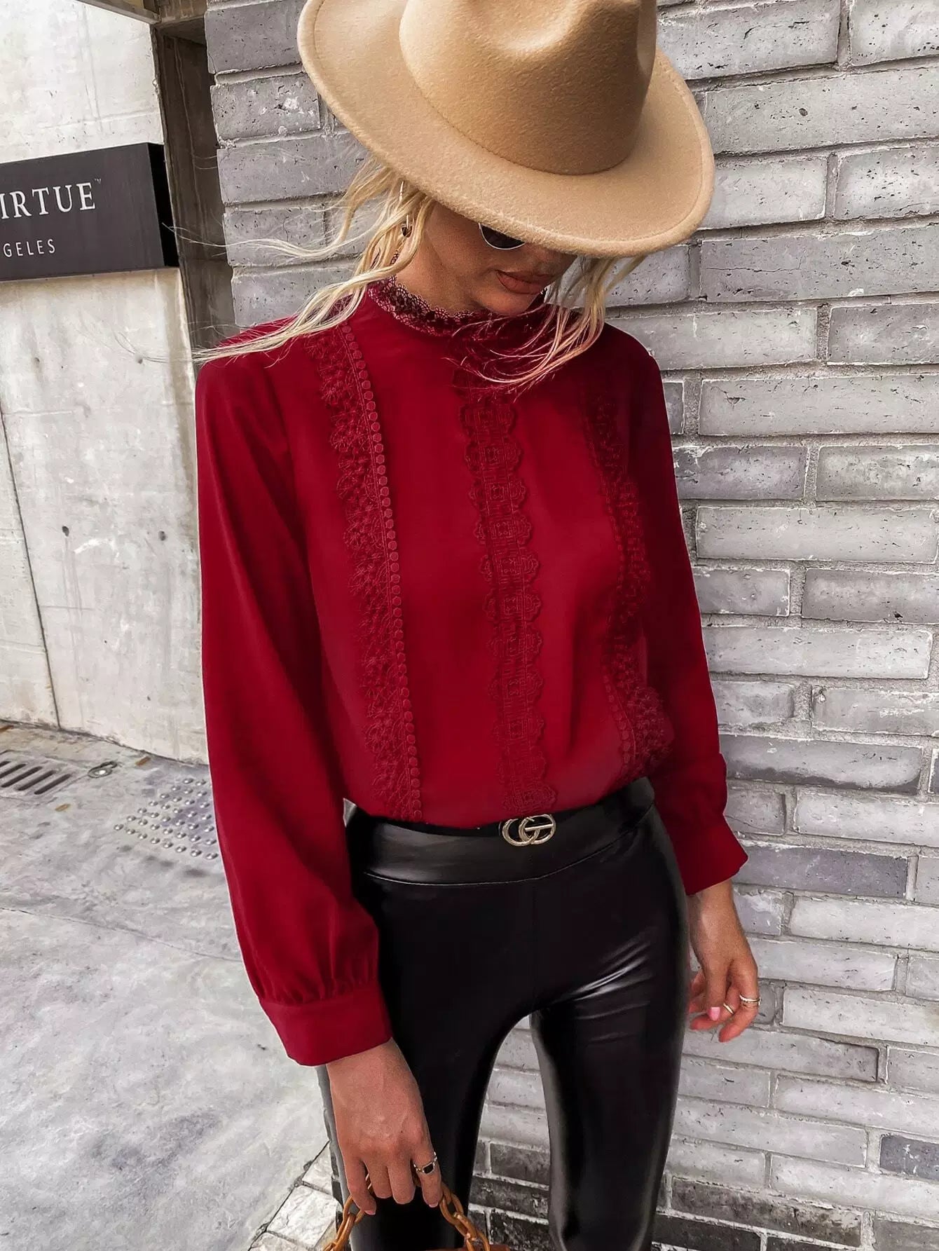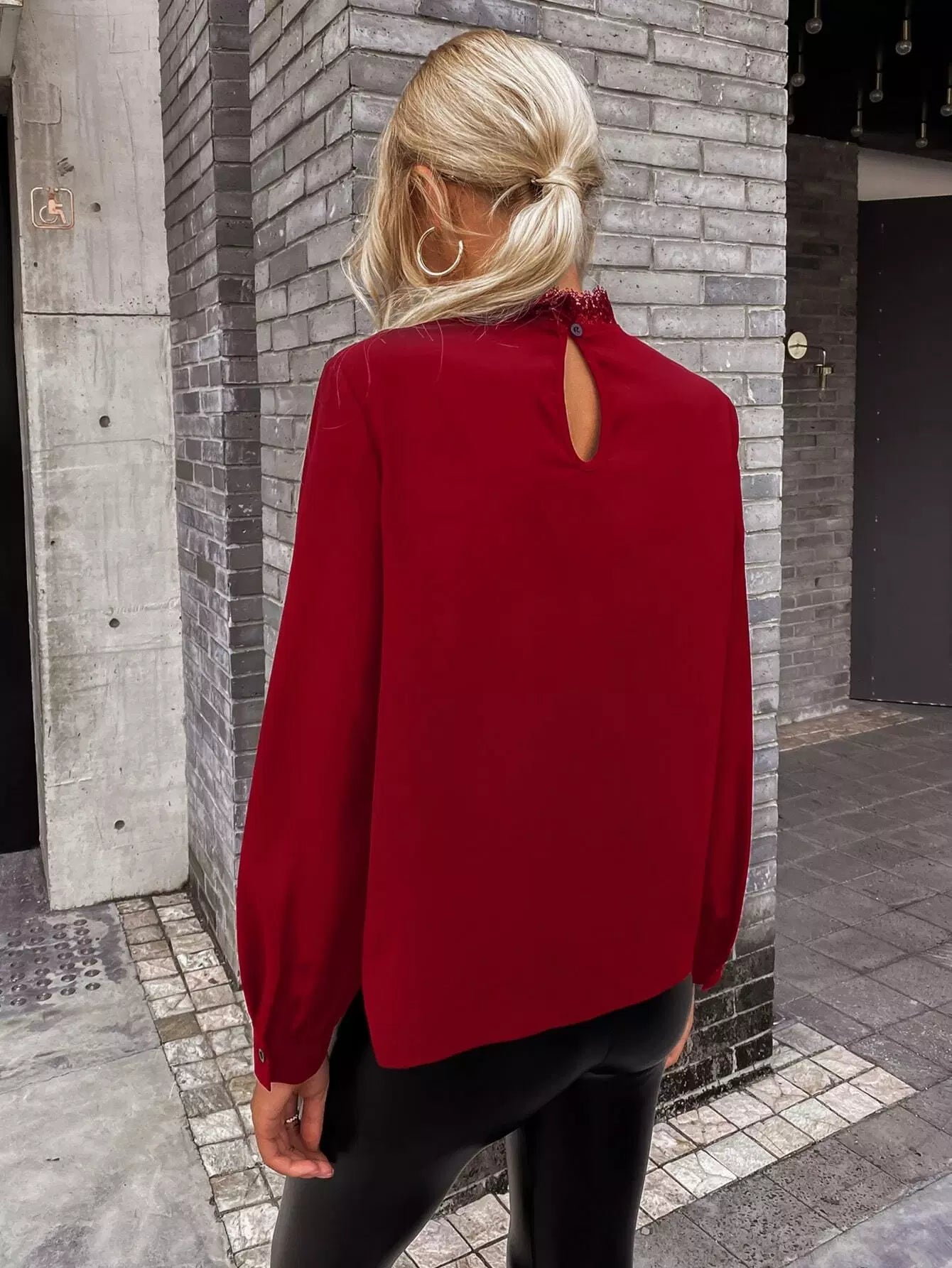 بلوزة من الدانتيل المخرم الدانتيل المخرم بفتحة ظهر من الدانتيل المخرم بلون مغاير