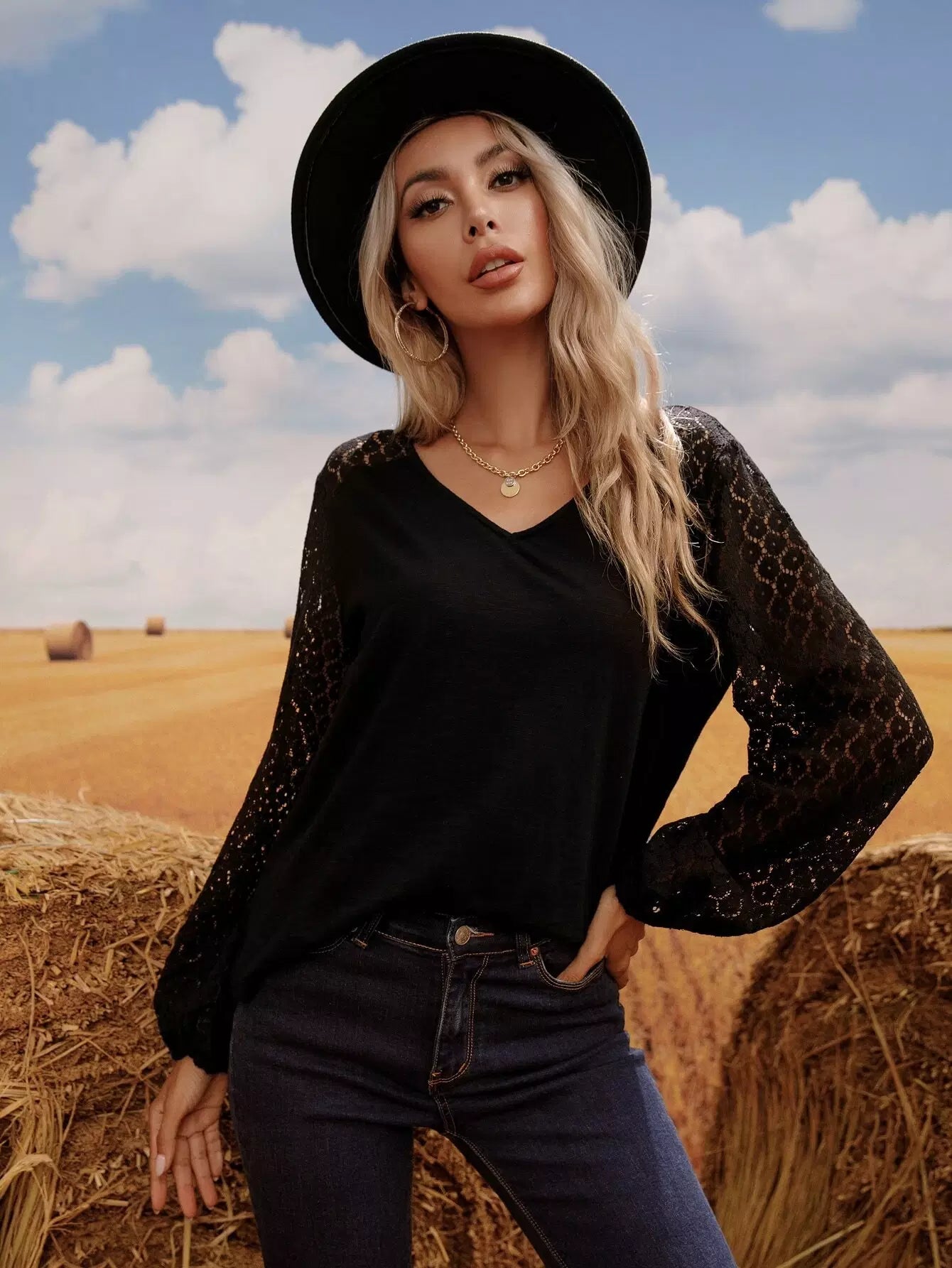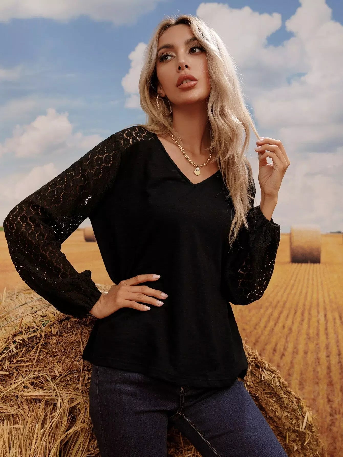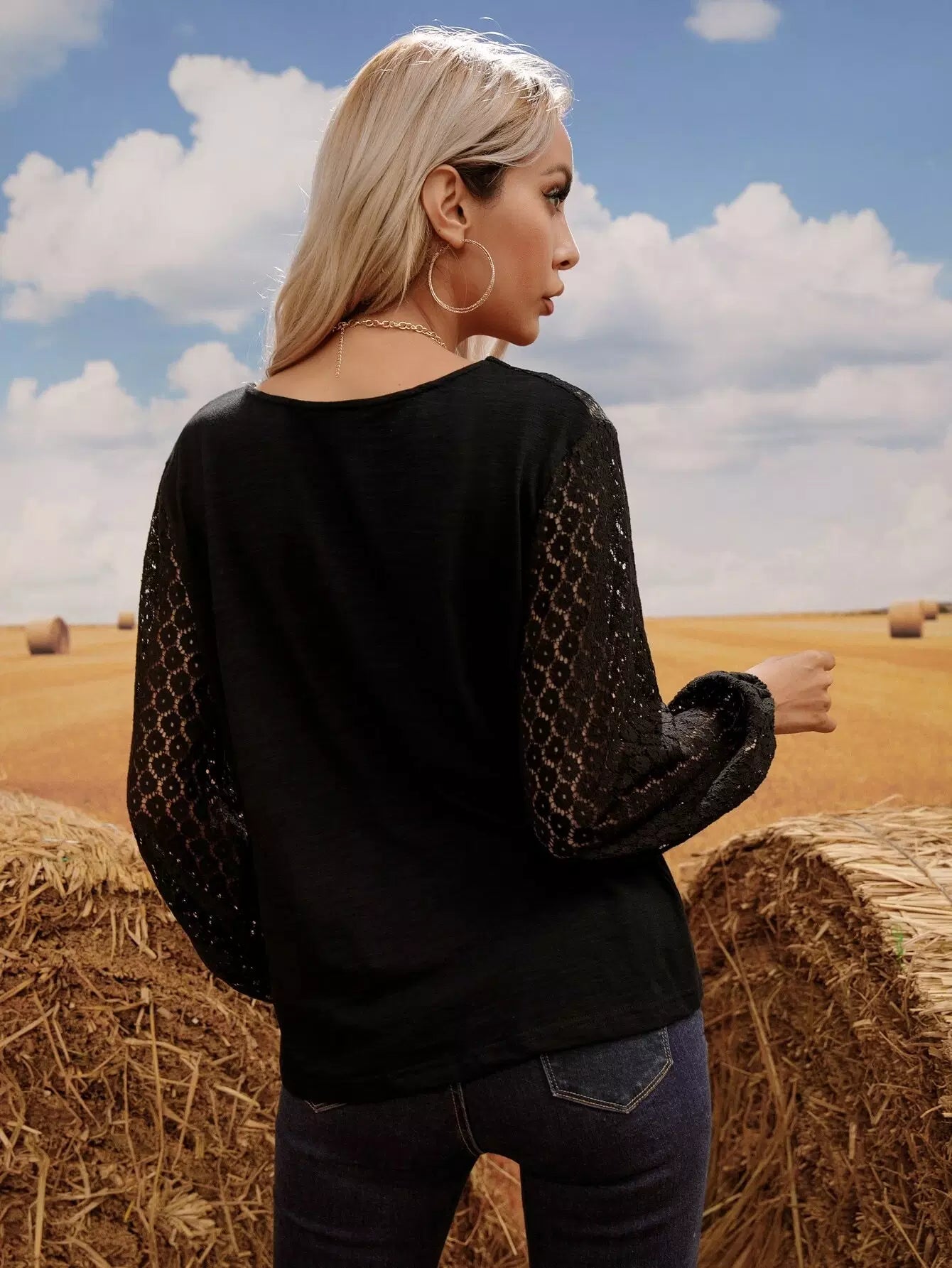 تي شيرت بأكمام دانتيل بلون مغاير سادة