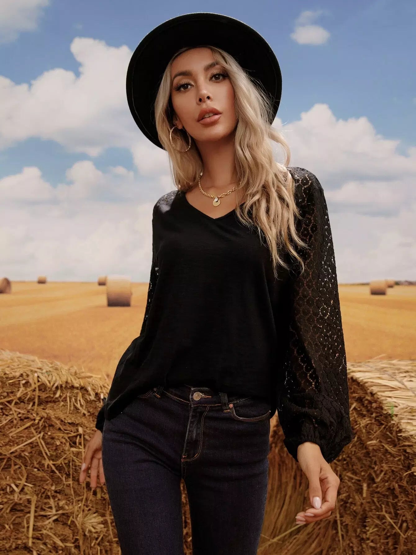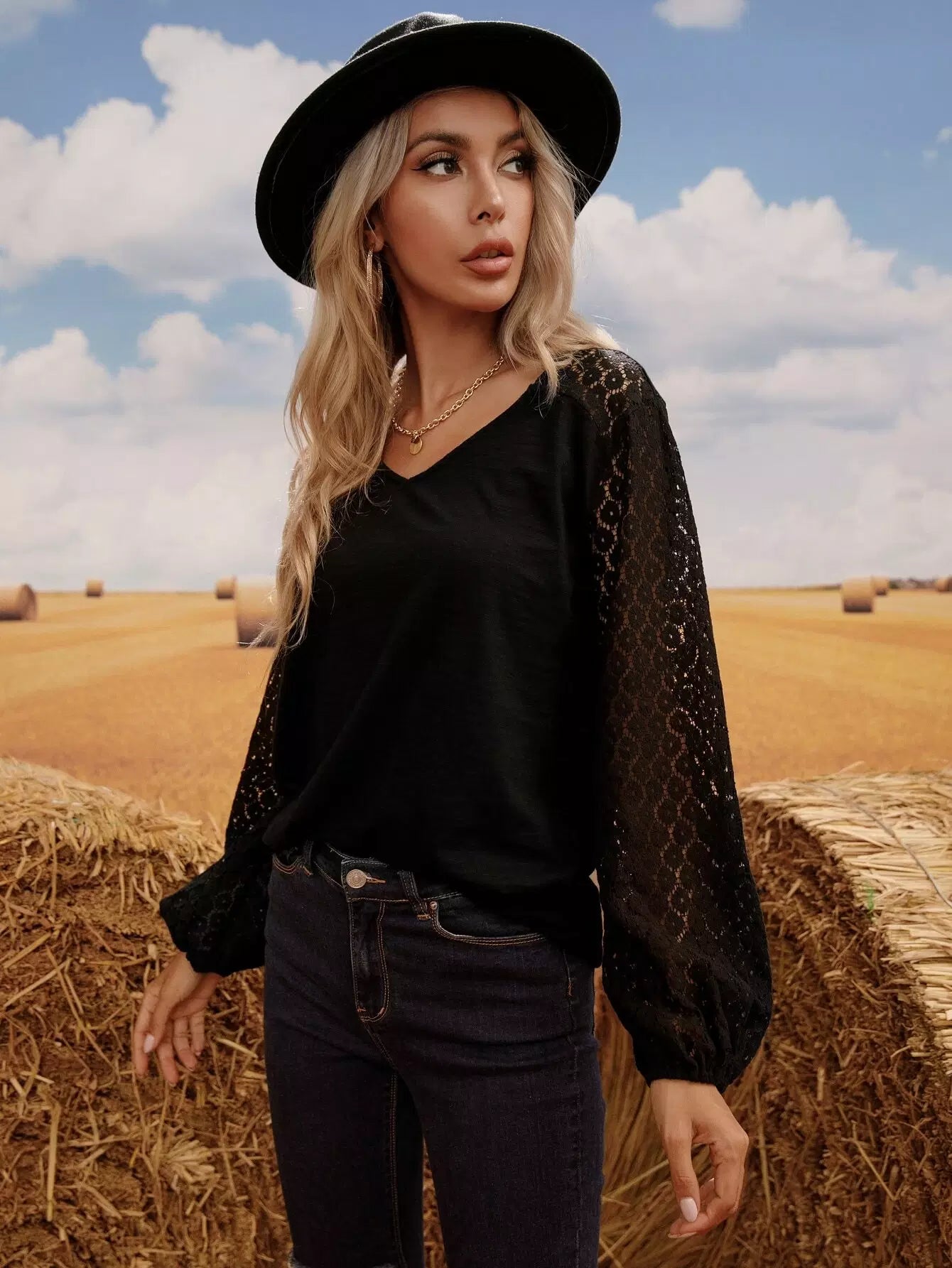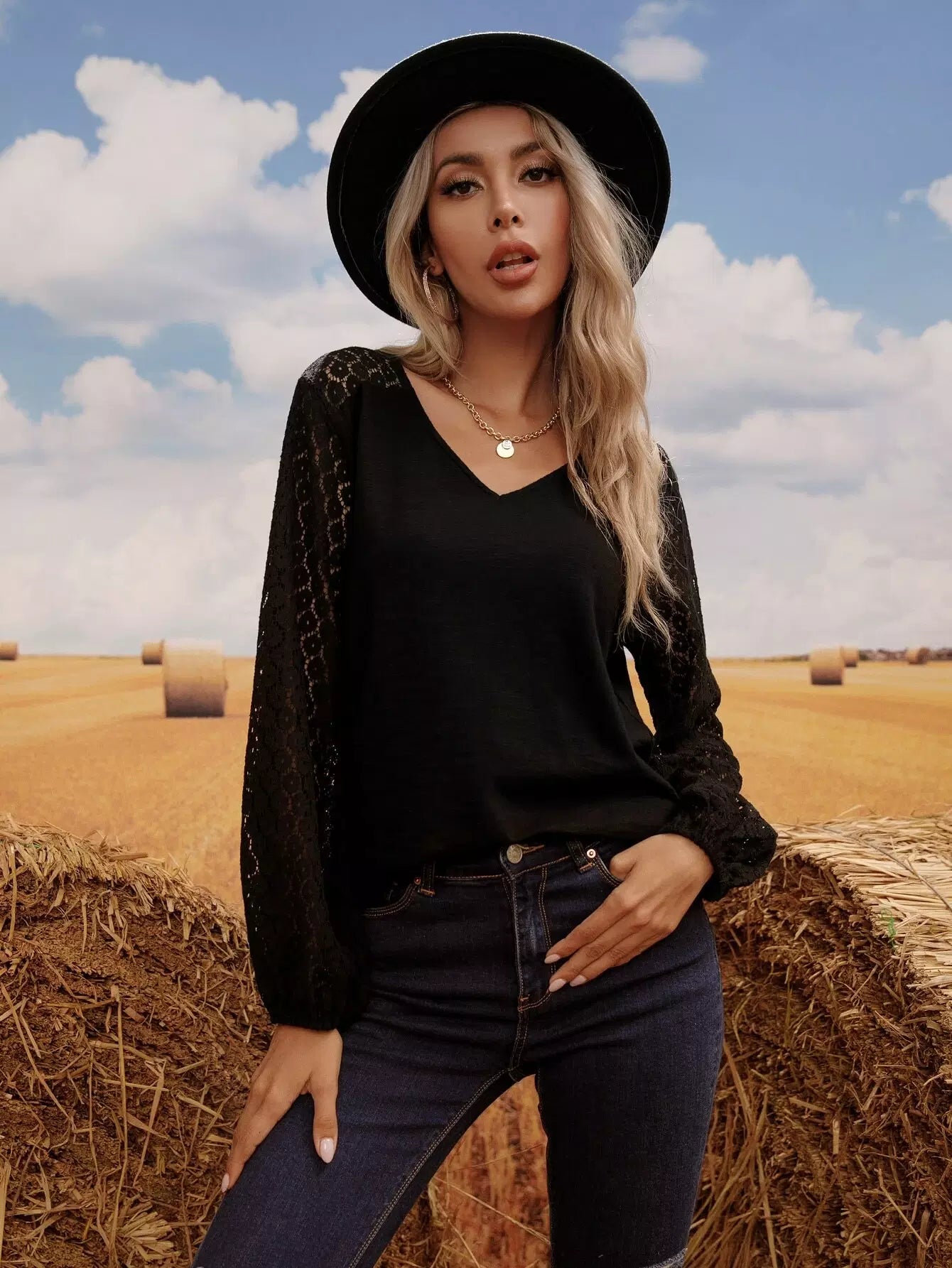 تي شيرت بأكمام دانتيل بلون مغاير سادة