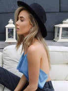 بلوزة من الساتان برقبة طربوش برقبة على شكل صليب متقاطع من الساتان بدون أكمام