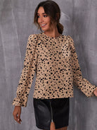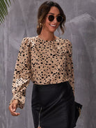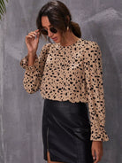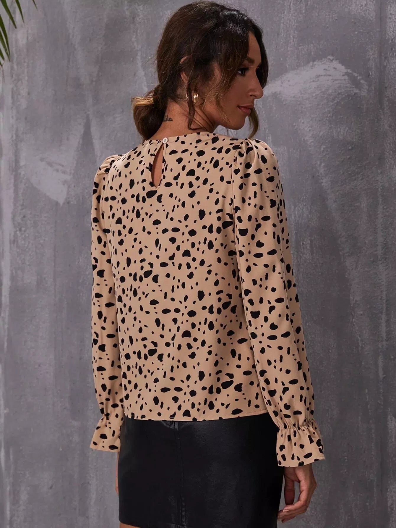 بلوزة بطبعة دلماسية وفتحة خلفية وأكمام مكشكشة