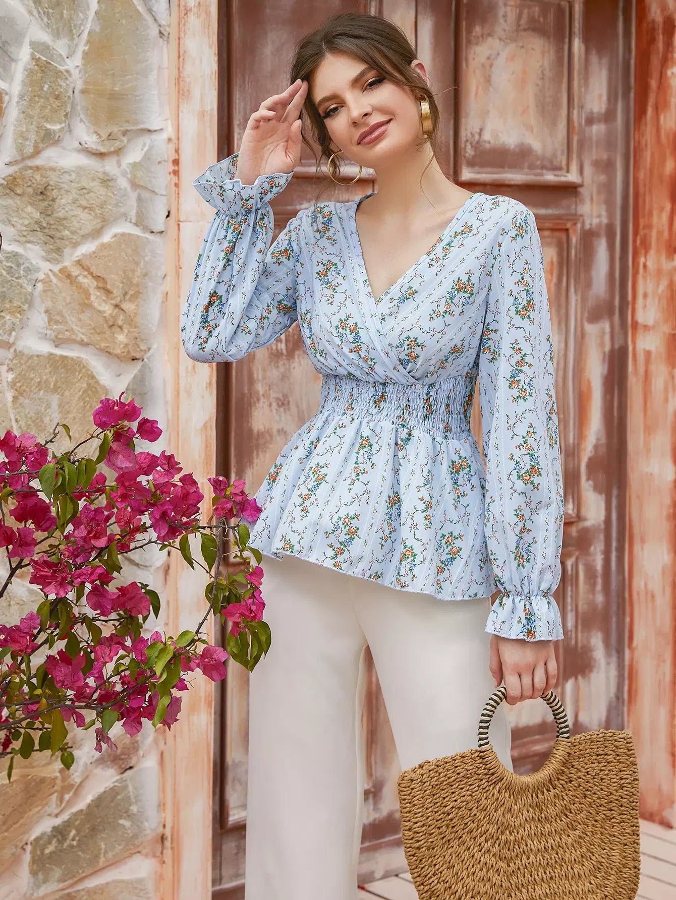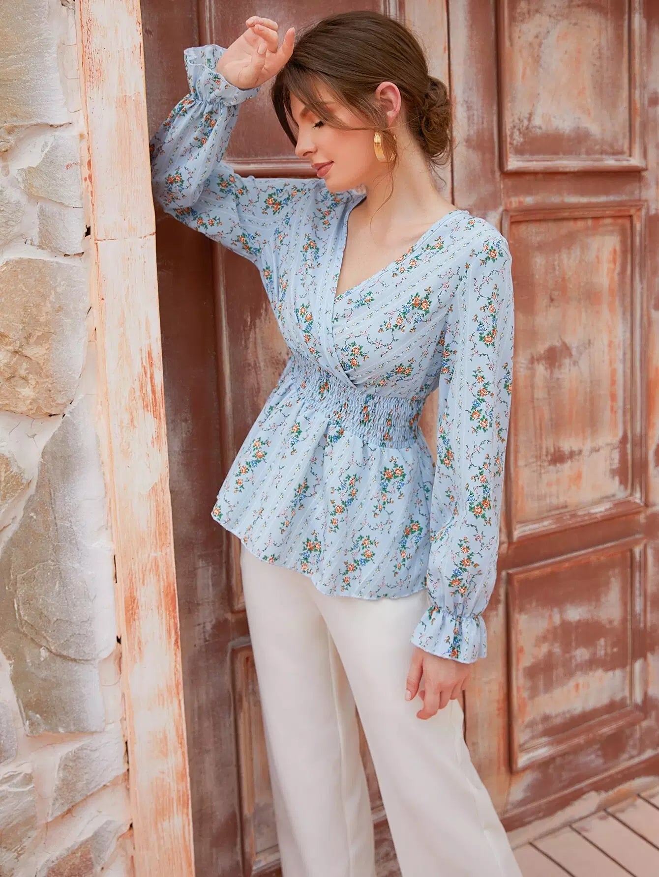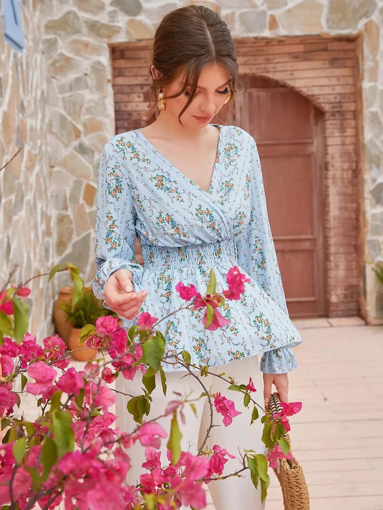 بلوزة بطبعة زهور صغيرة مع ياقة مرفوعة وأكمام منفوشة