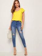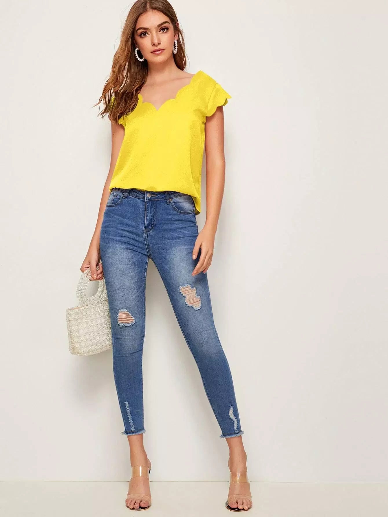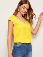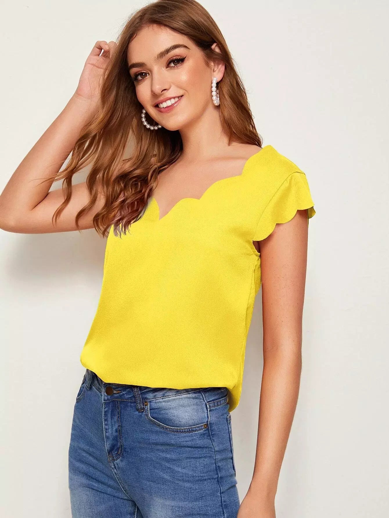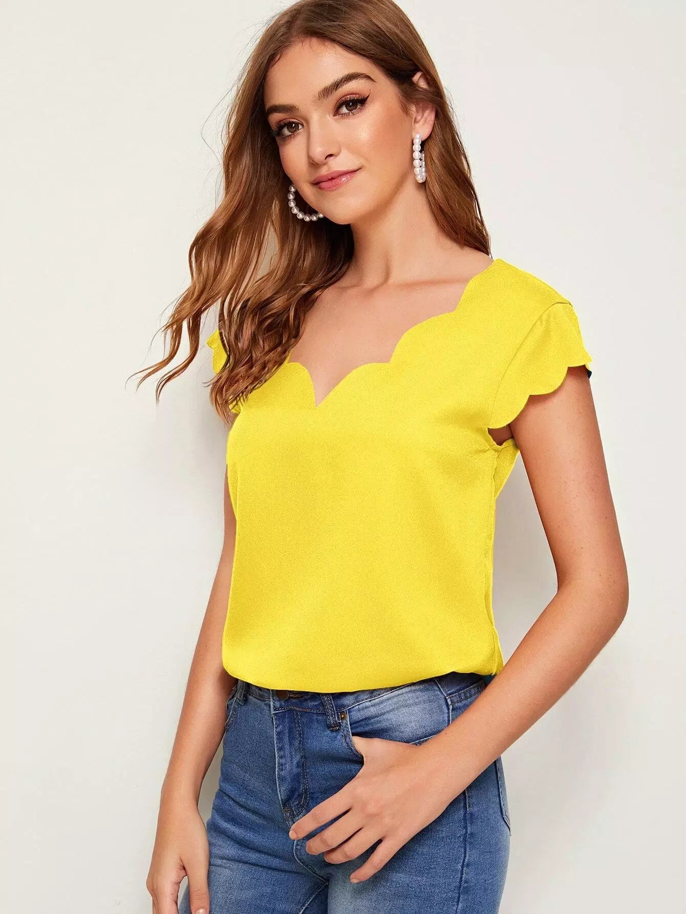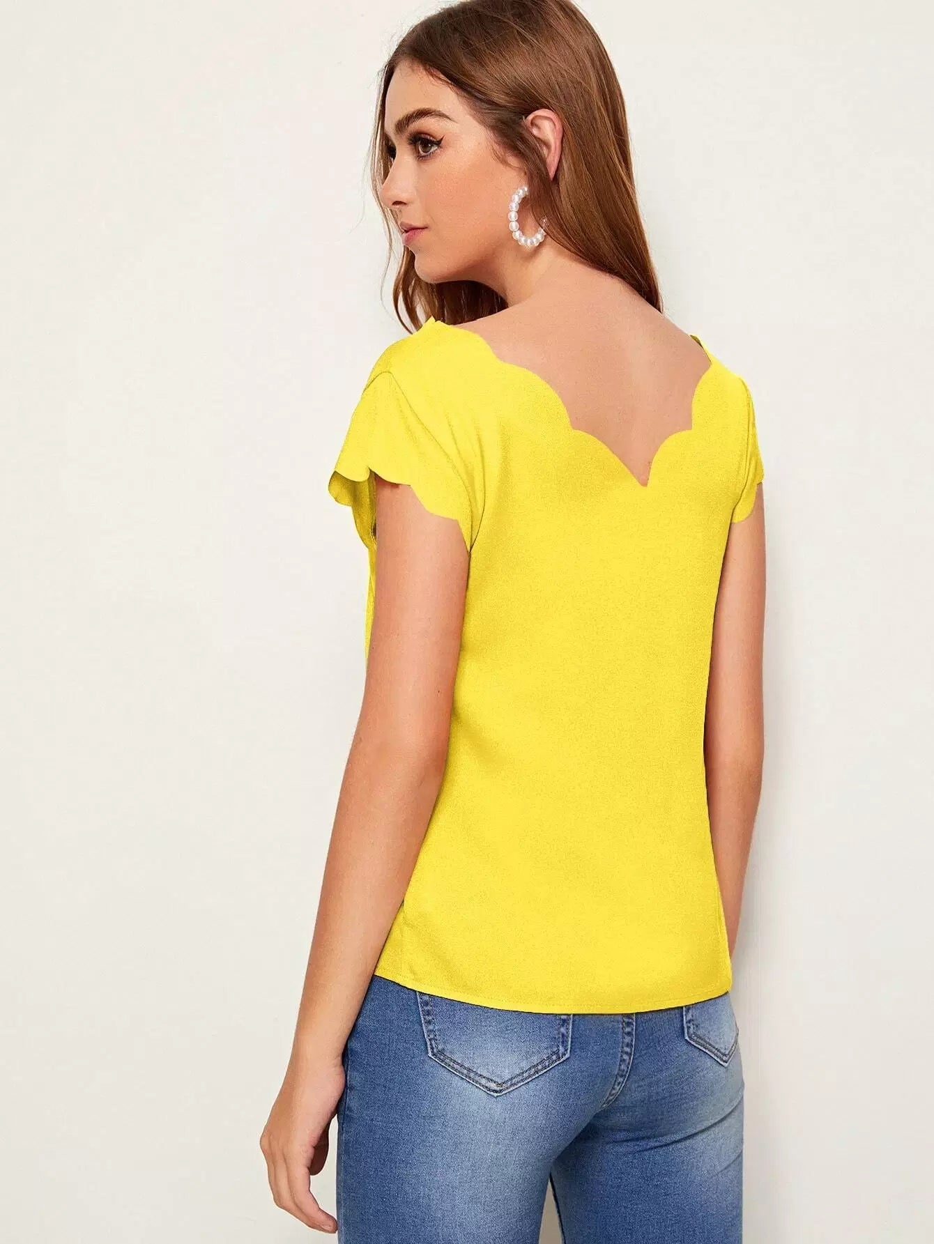 بلوزة برقبة مزدوجة على شكل V بحافة صدفة