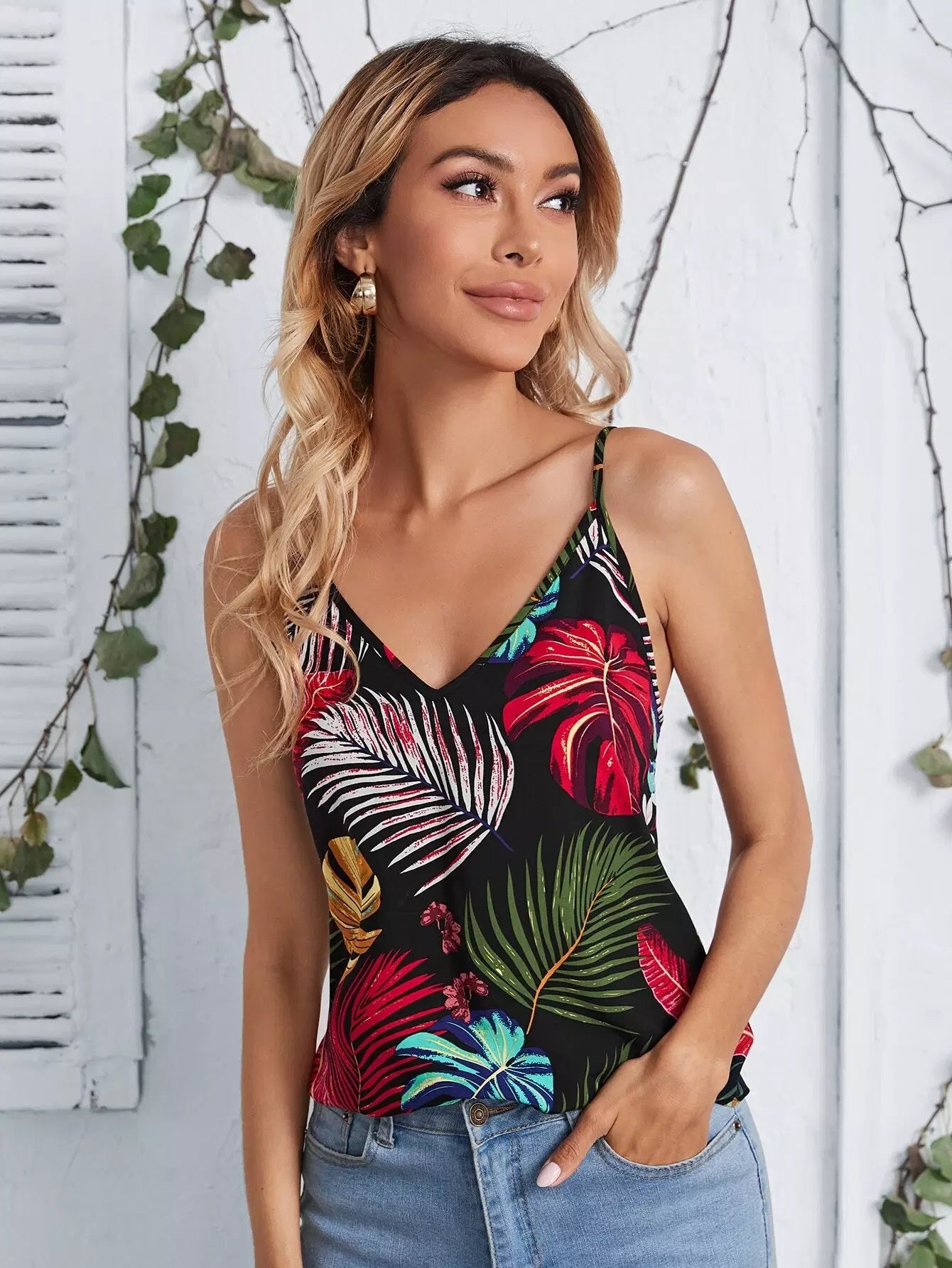 بلوزة برقبة مزدوجة على شكل حرف V مطبوع عليها طبعة استوائية