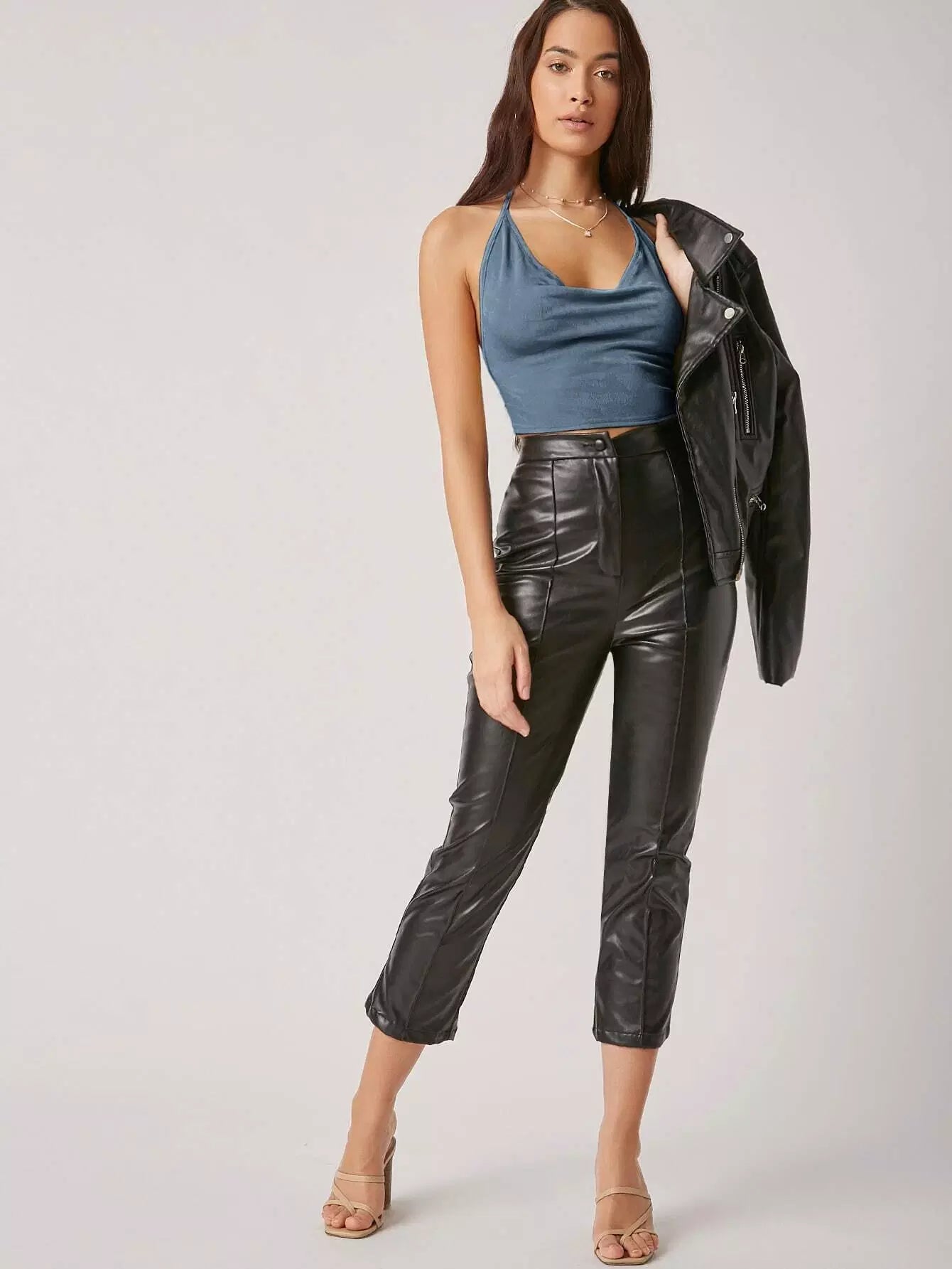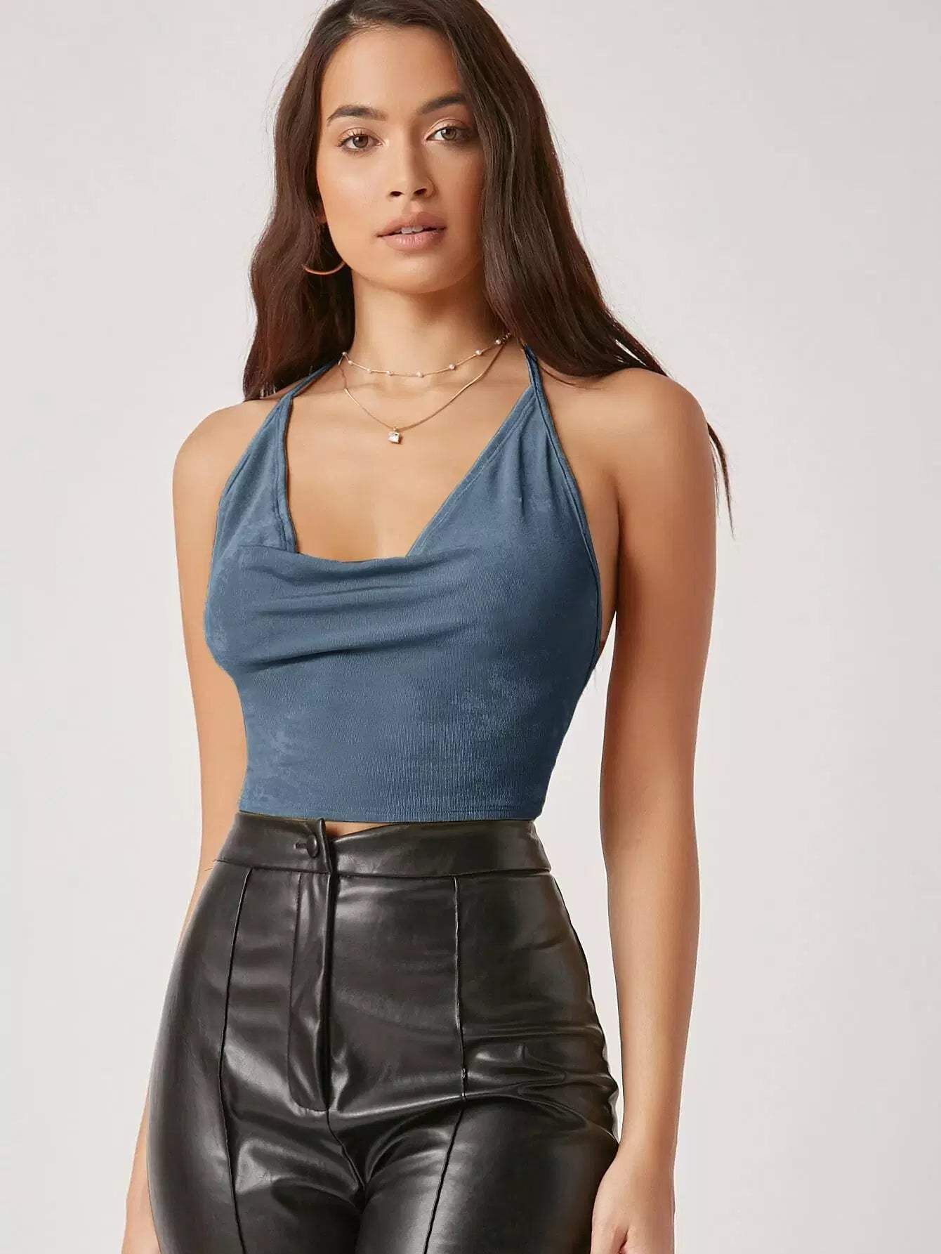 بلوزة برقبة منسدلة بفتحة رقبة مربوطة من الخلف ومكشوفة الصدر