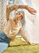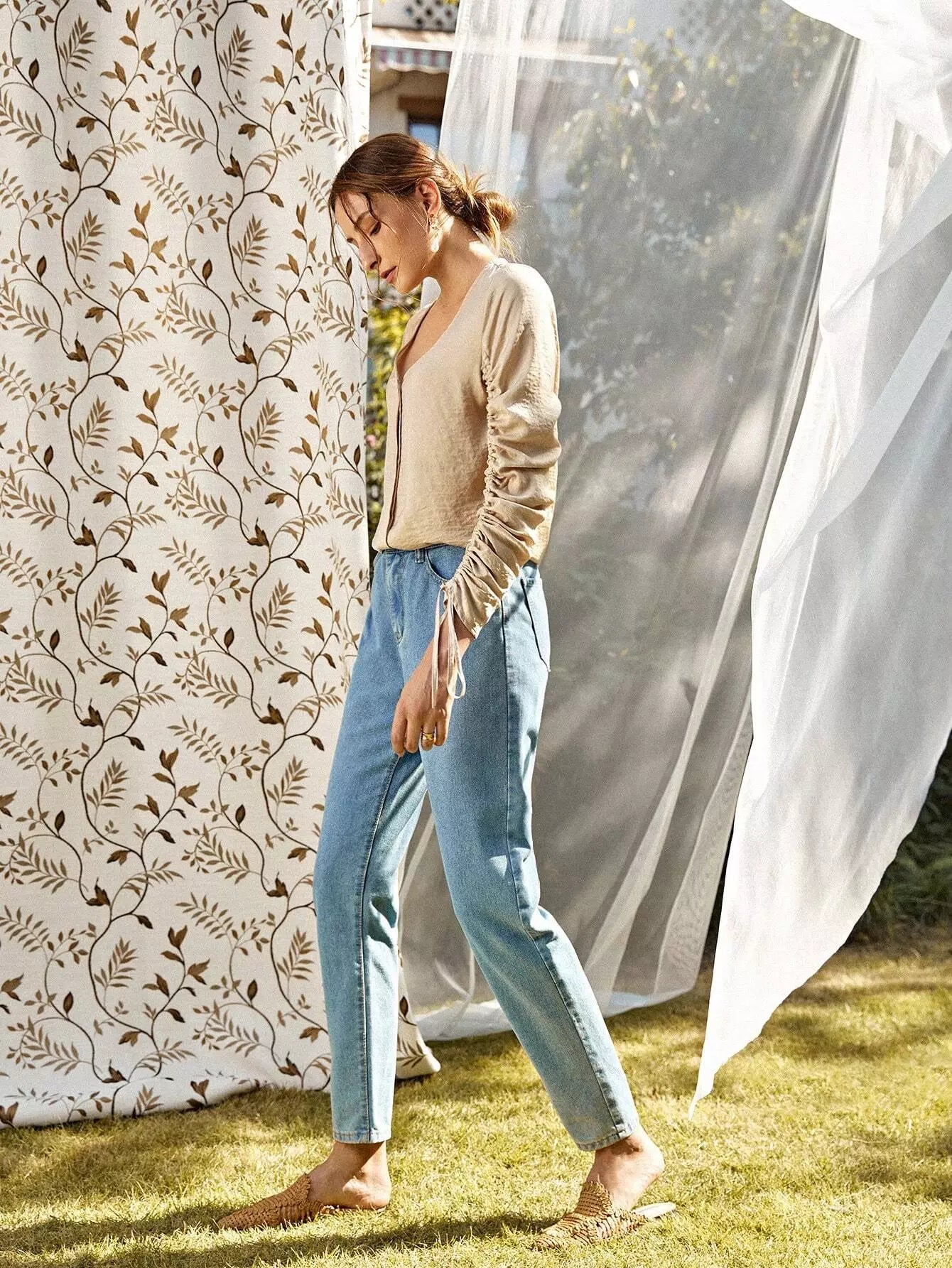 النساء - بلوزة بأزرار أمامية وأكمام برباط