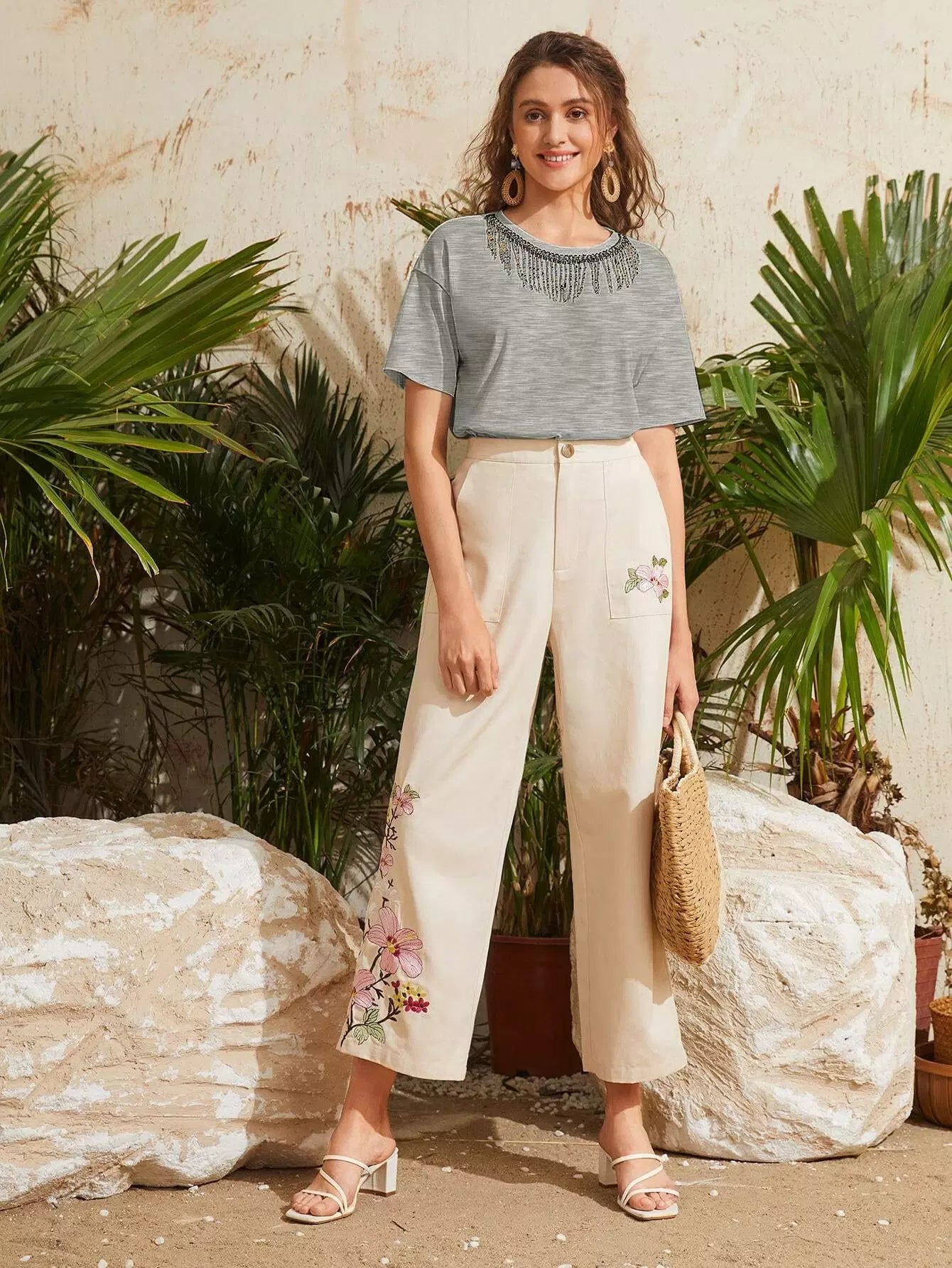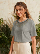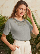 تي شيرت ذو أكتاف منسدلة مزين بالخرز والخرز