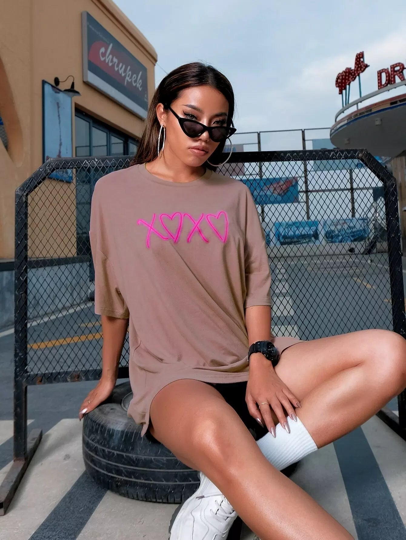 بلوزة منسدلة الكتفين مطبوع عليها قلب