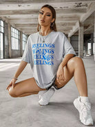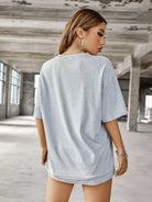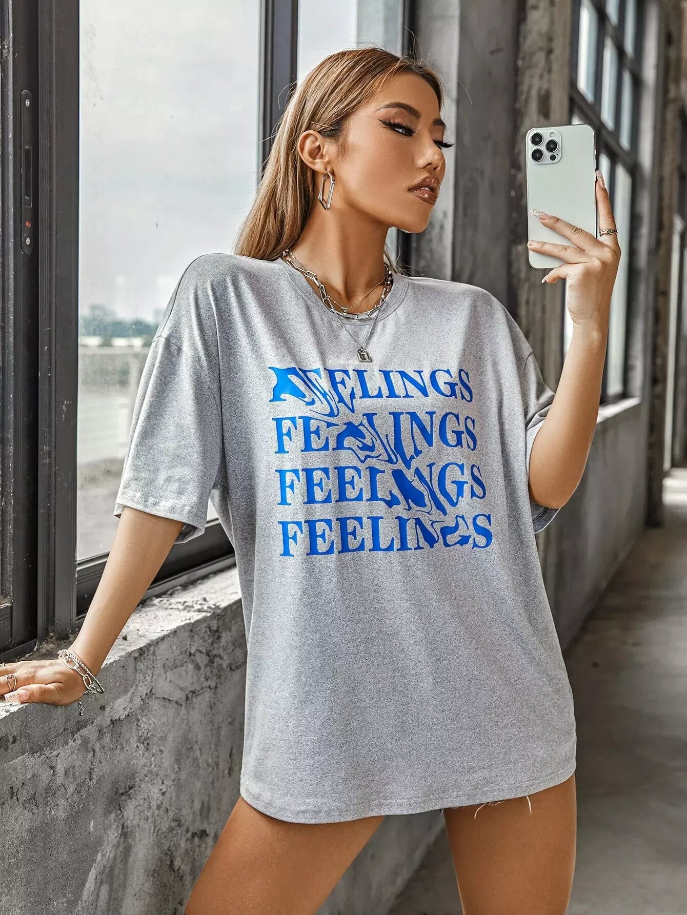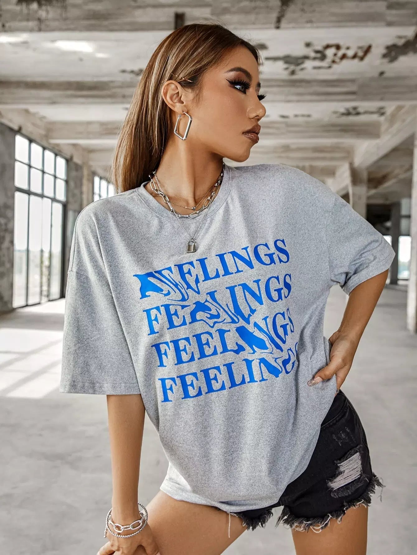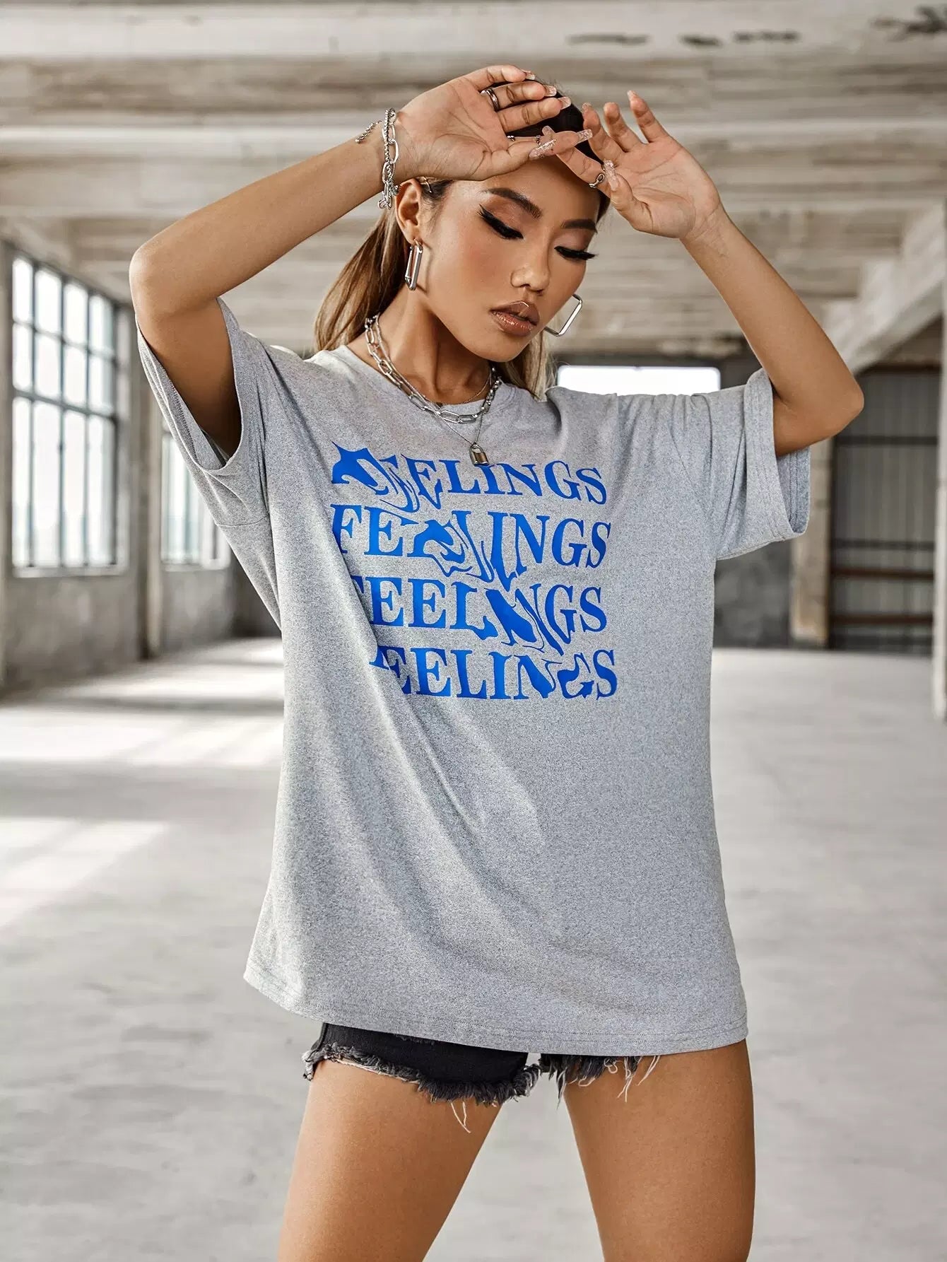 تي شيرت بتصميم منسدل الكتفين برسومات على شكل حرف