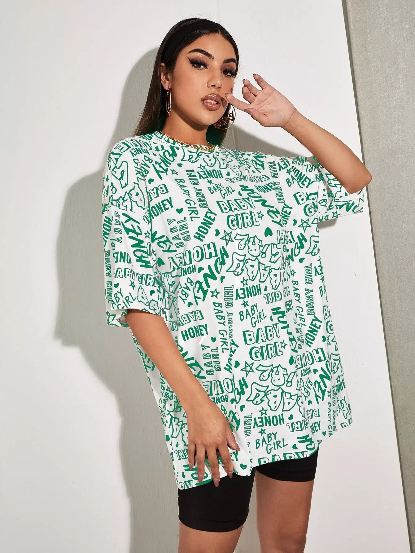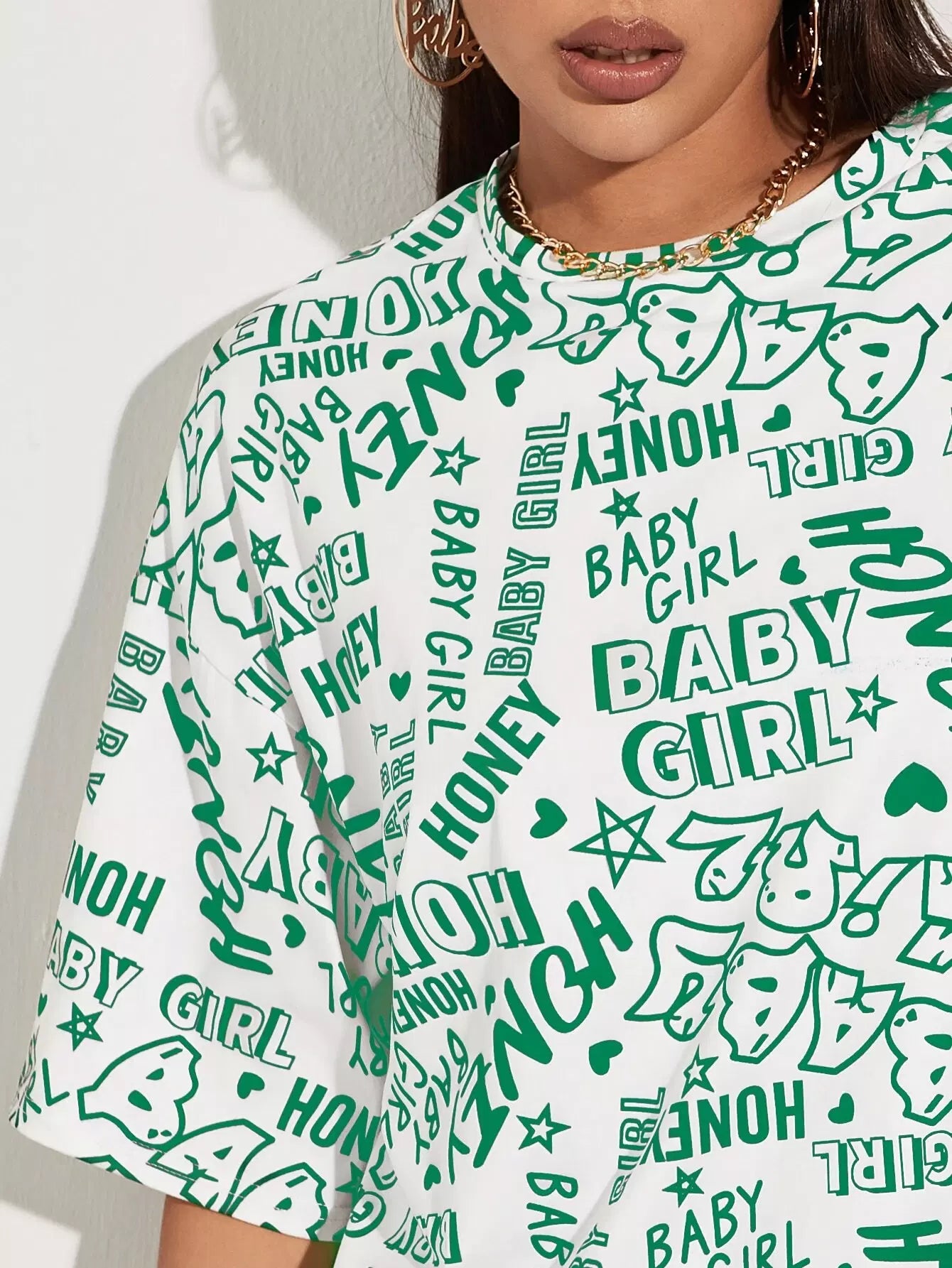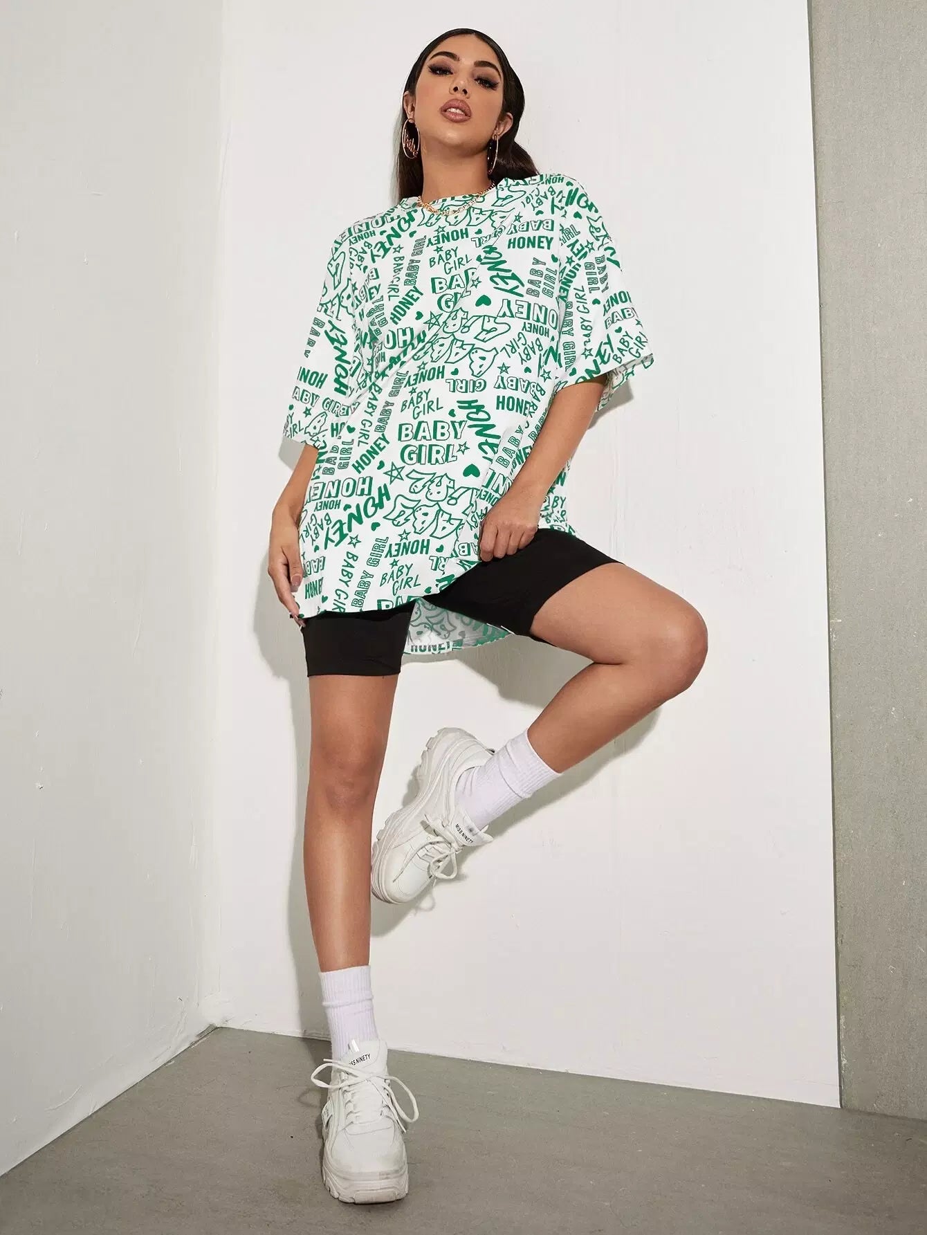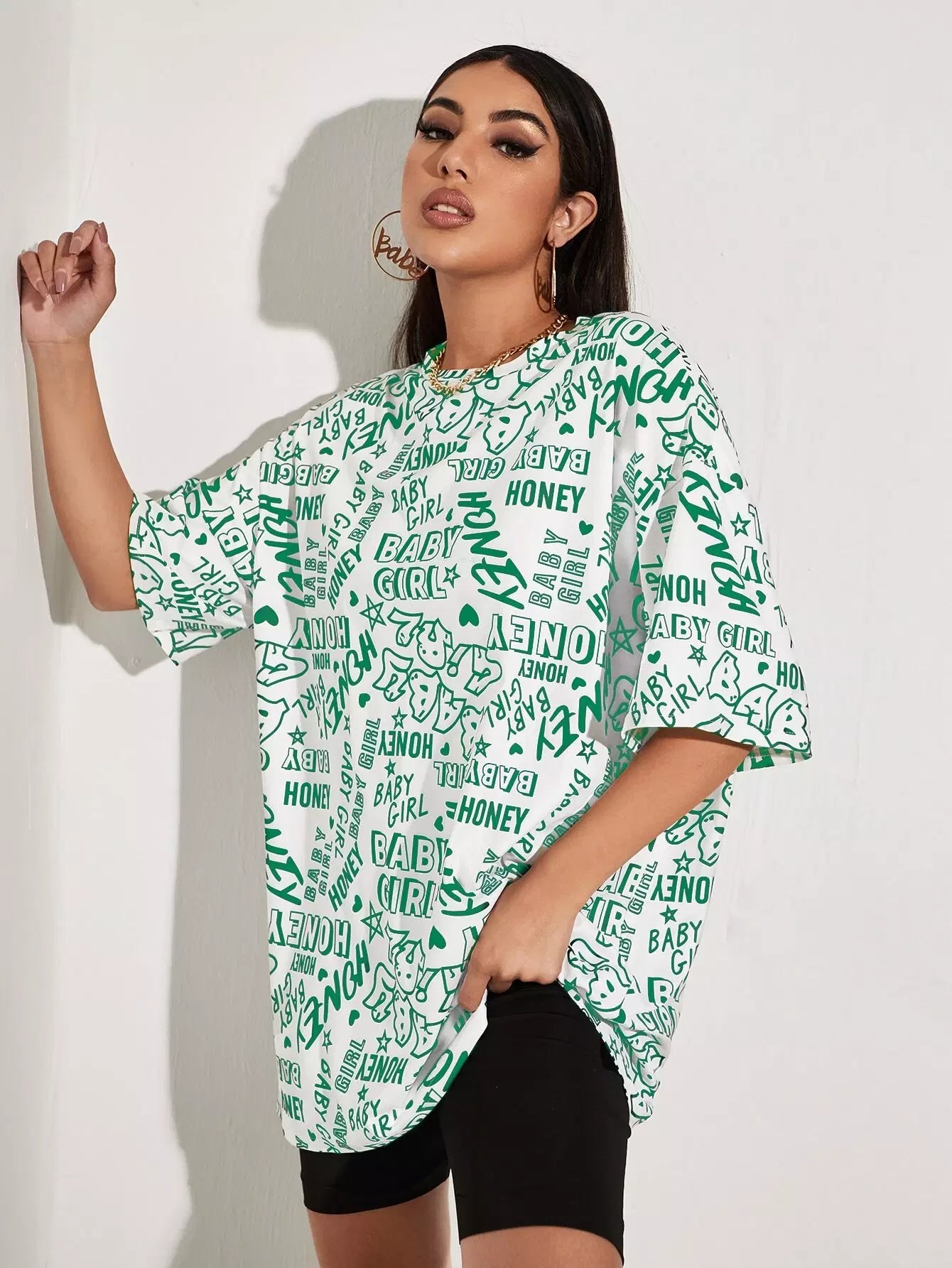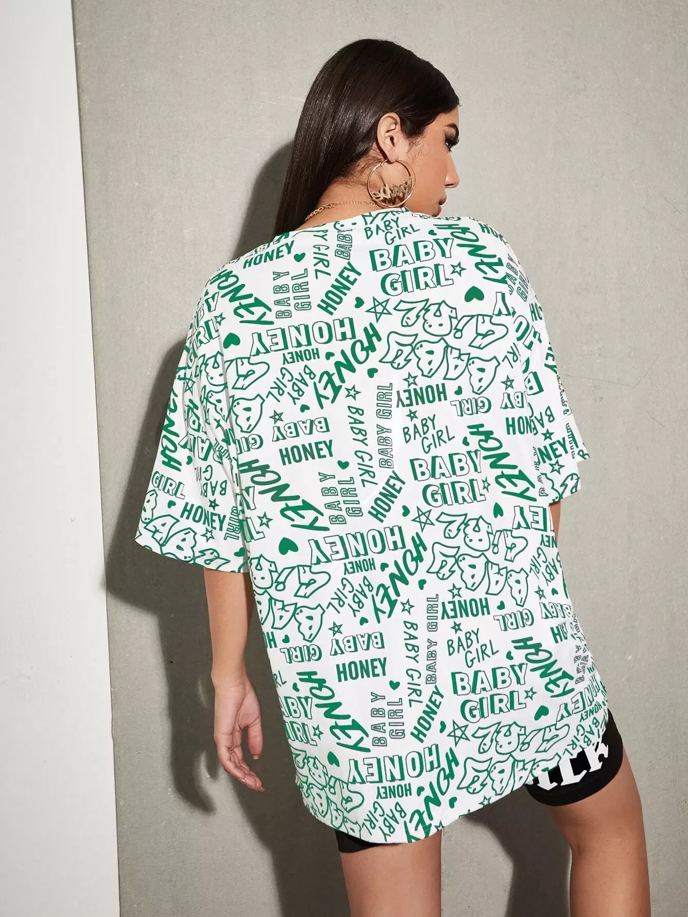 تي شيرت منسدل الكتفين مطبوع عليه حروف وقلب