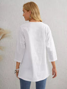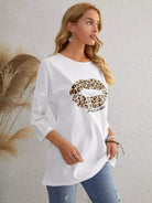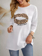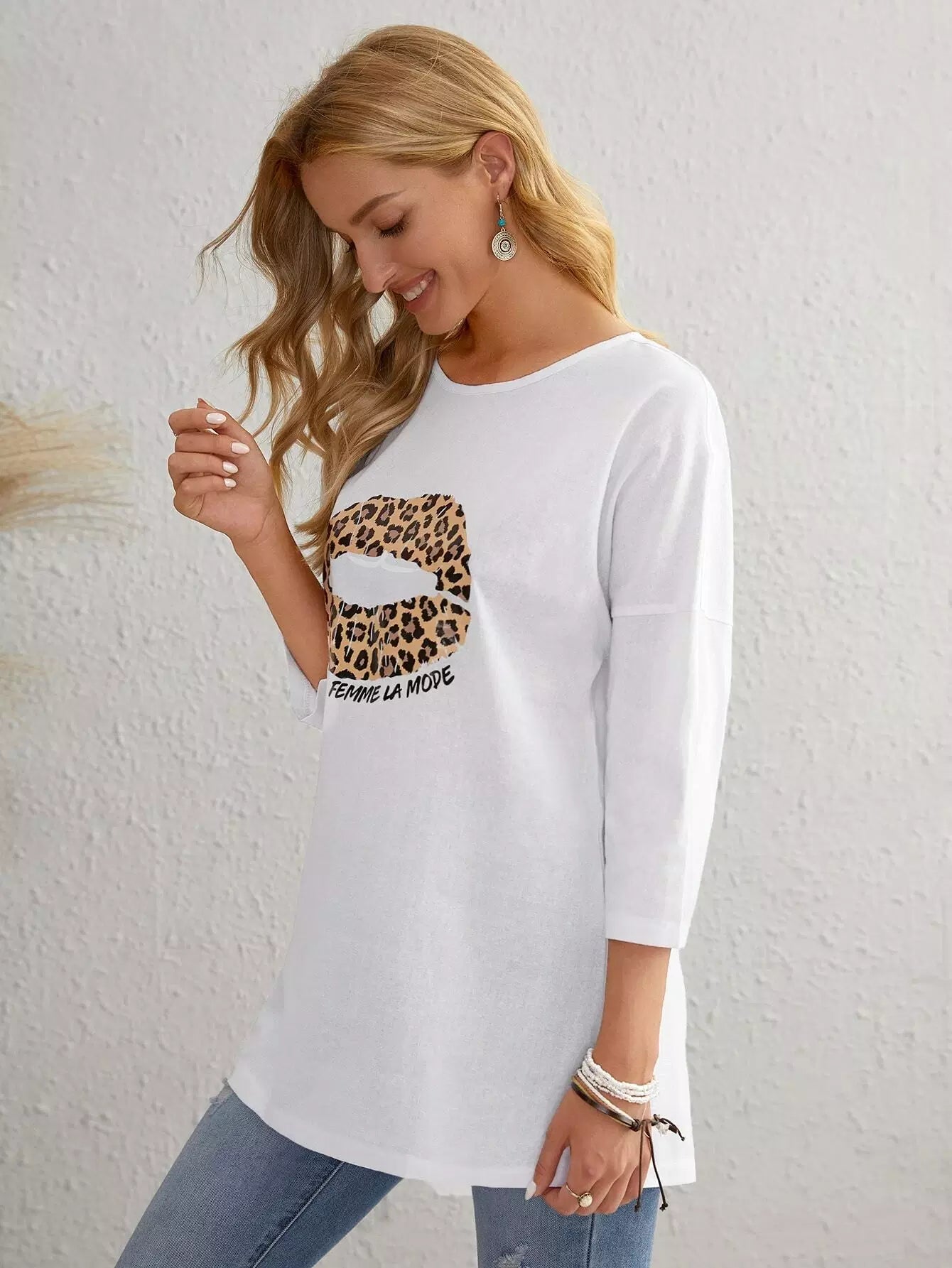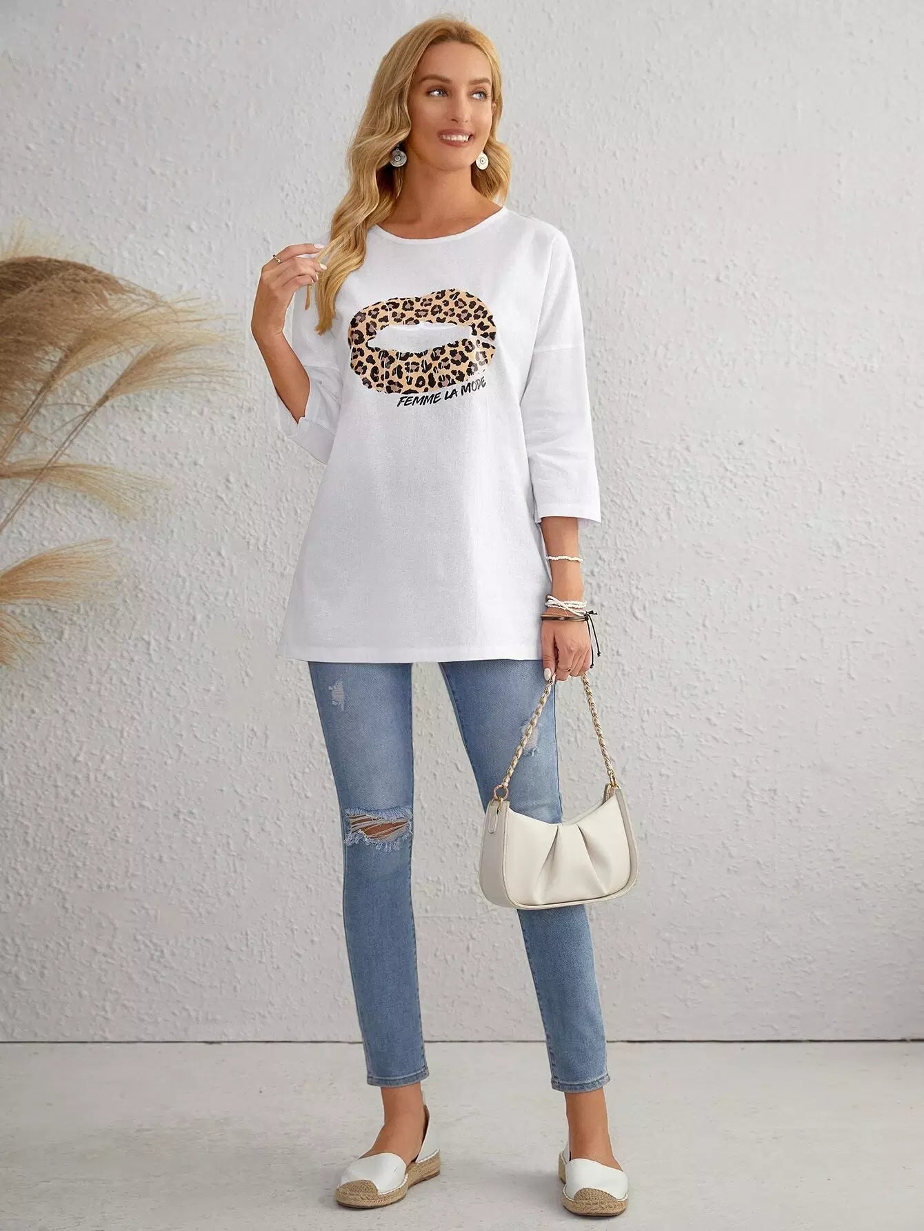 بلوزة منسدلة الكتفين مطبوع عليها حروف وشفاه