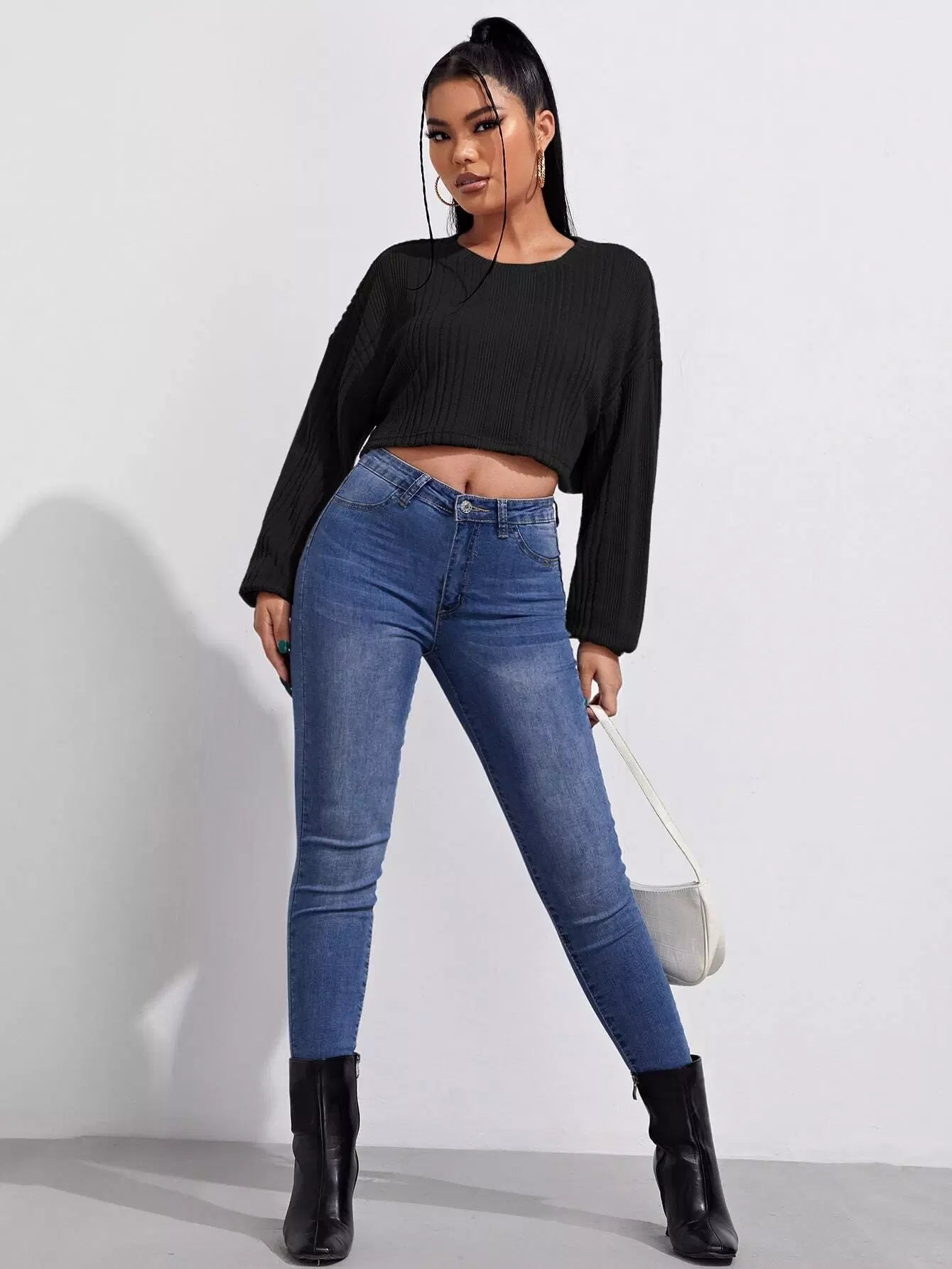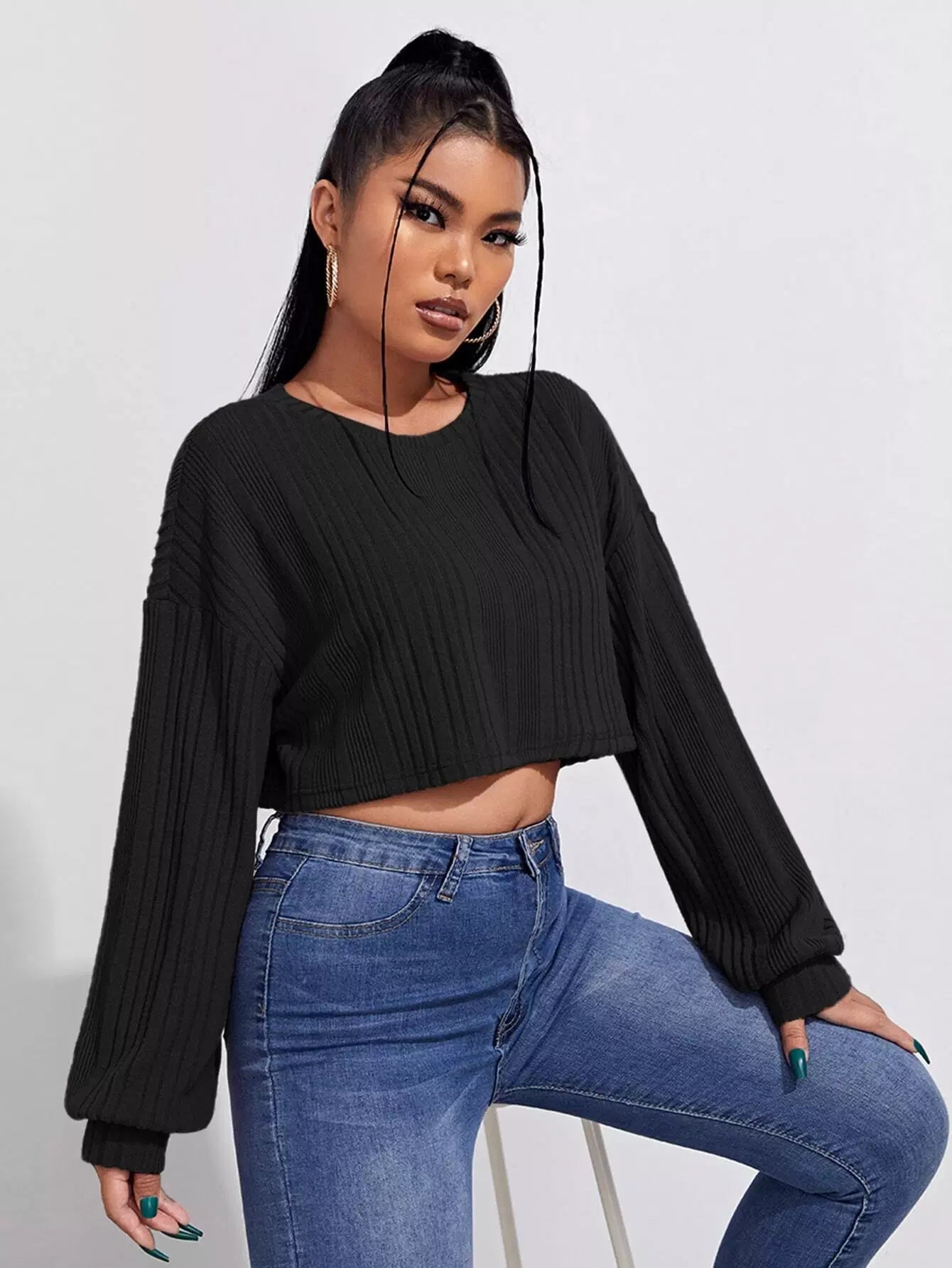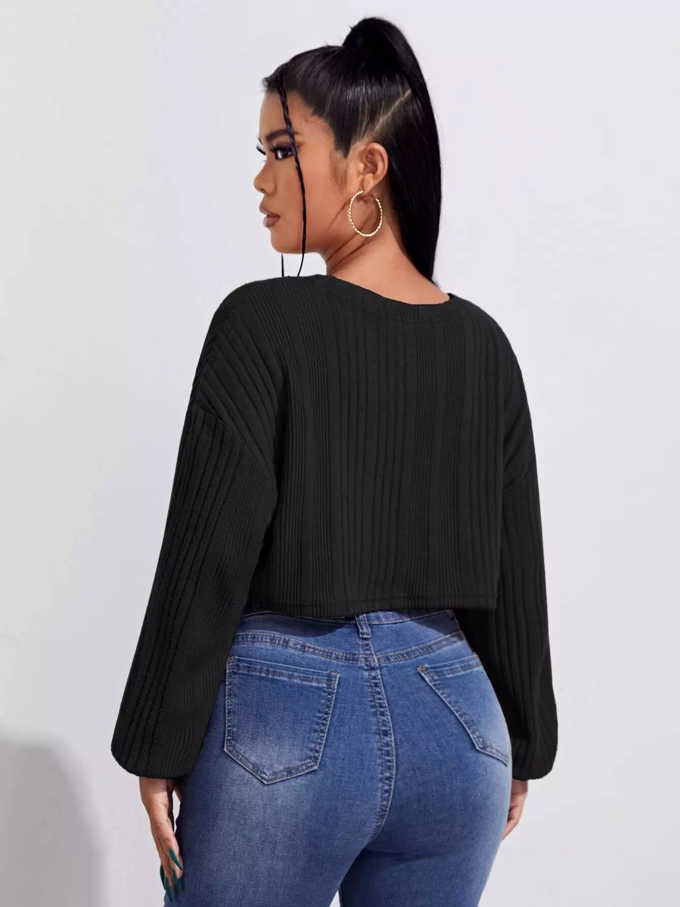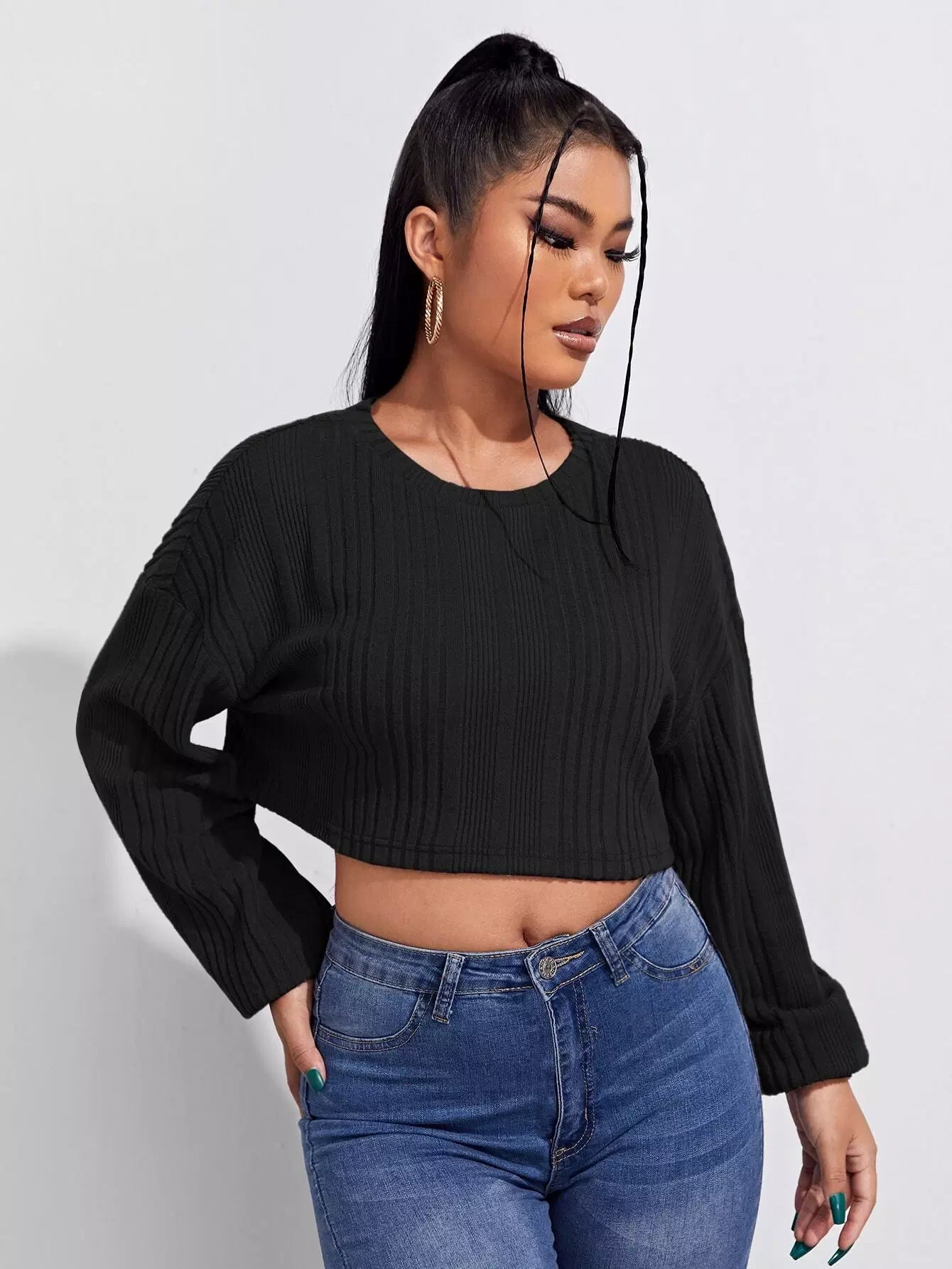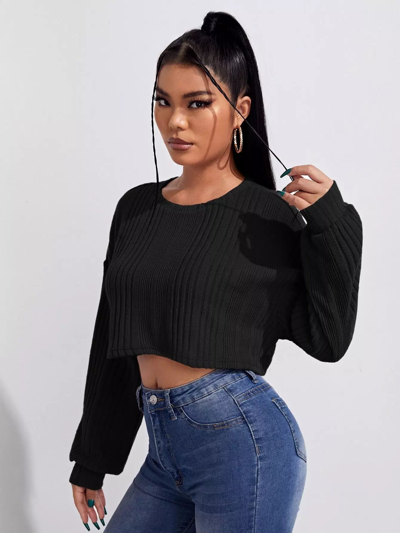 تي شيرت قصير منسدل الأكتاف محبوك على شكل ضلع منسدل