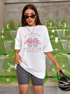للنساء - تي شيرت كبير الحجم برسومات الشعار وأكتاف منسدلة