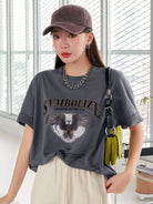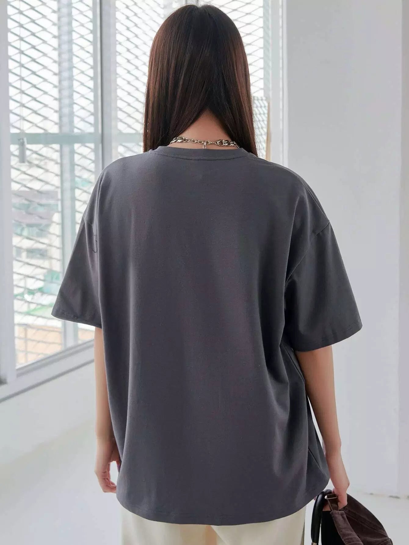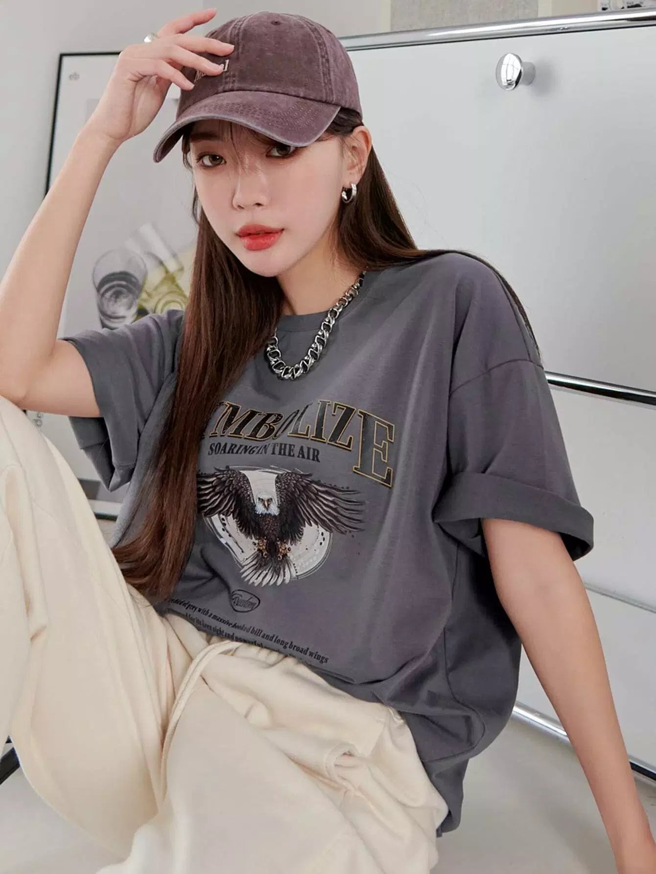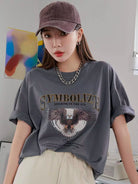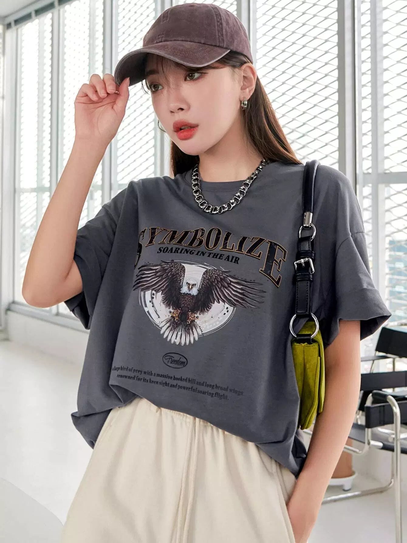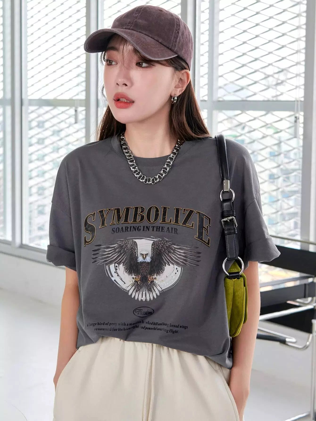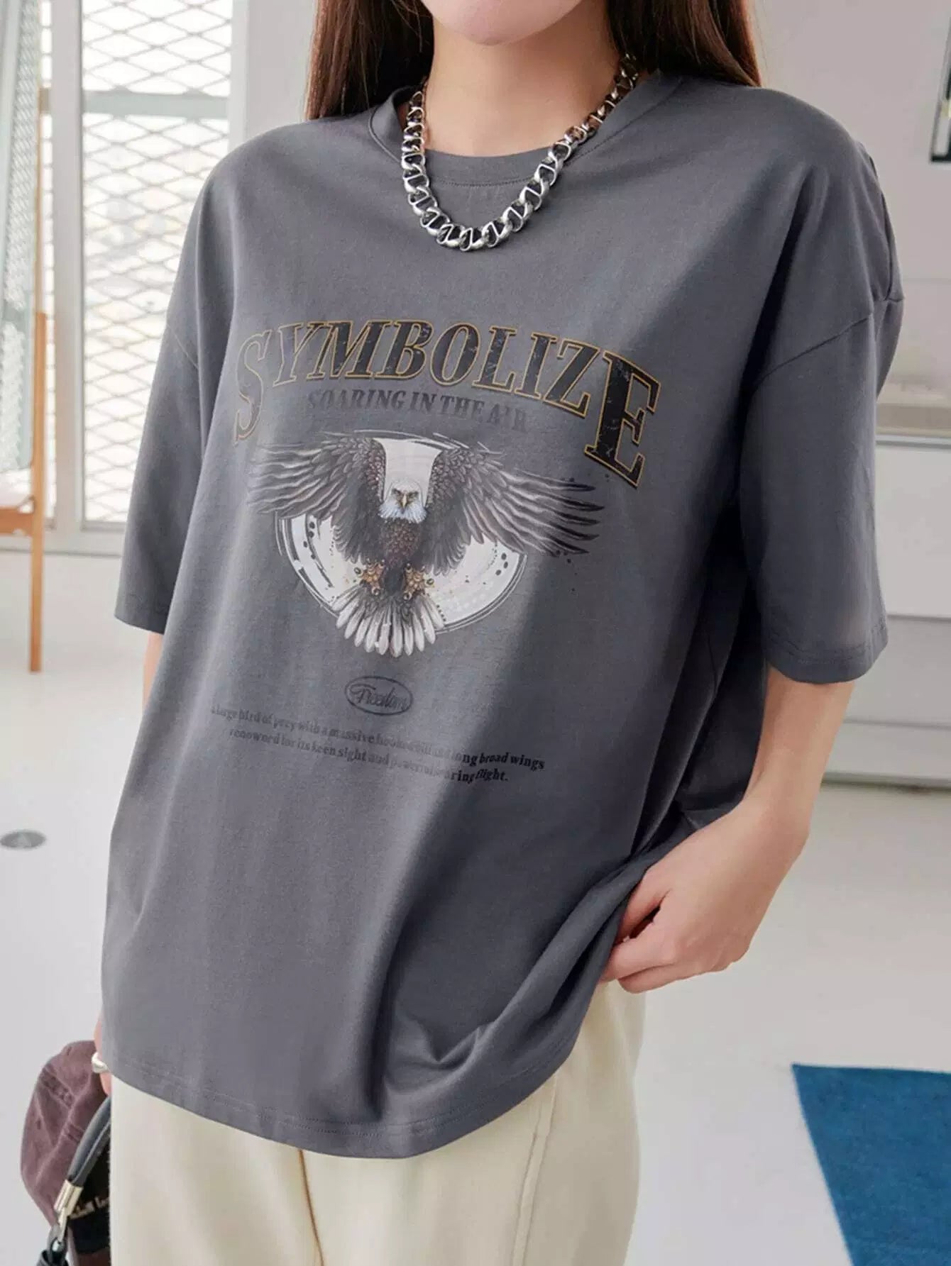 تي شيرت منسدل الكتف برسومات النسر والحروف
