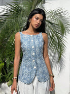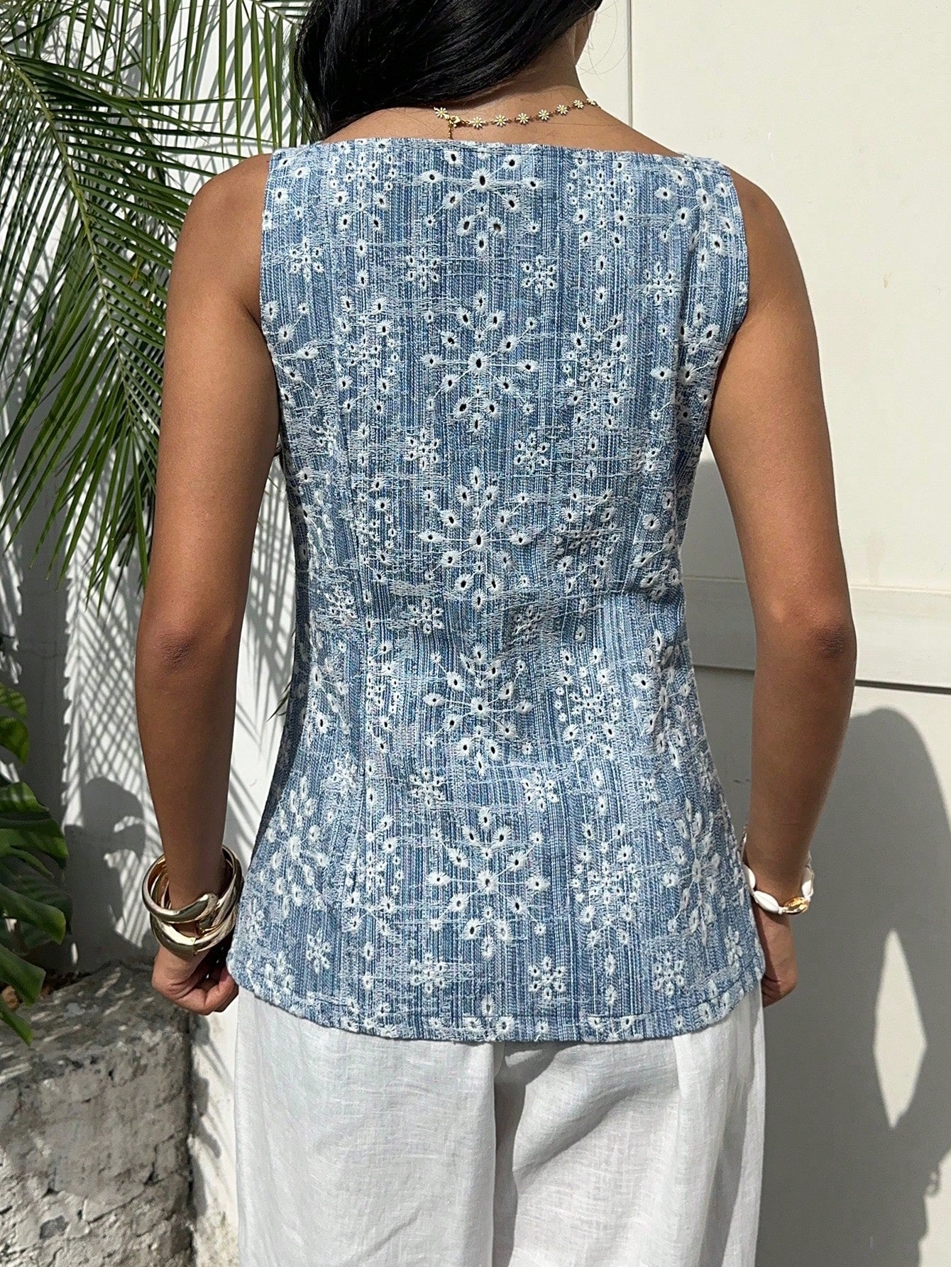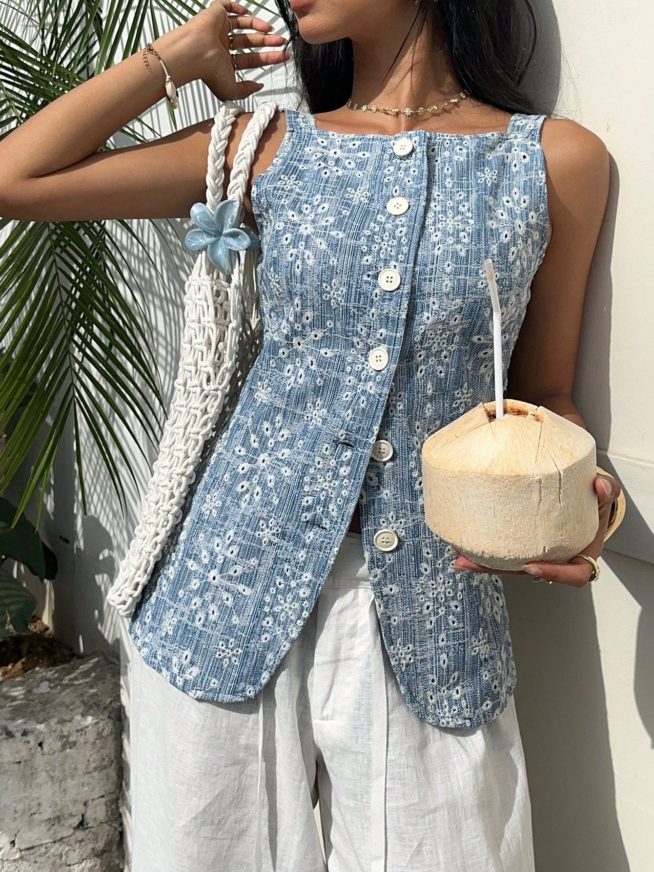 EZwear Women's Casual Blue Floral Embroidery Square Neck Button Front Regular Length Tank Top