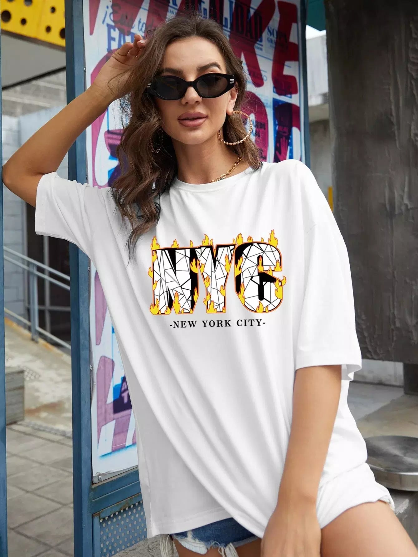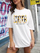 تي شيرت بتصميم منسدل الكتف منسدل الأكتاف برسومات النار والحروف