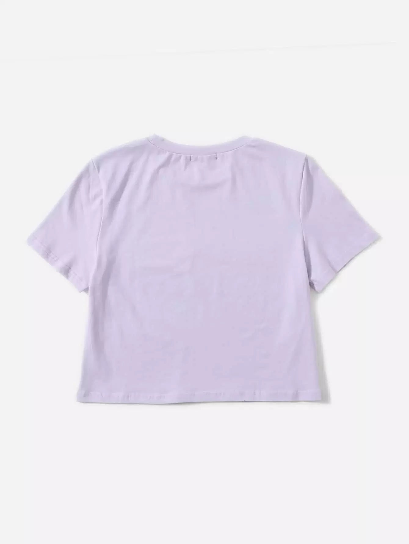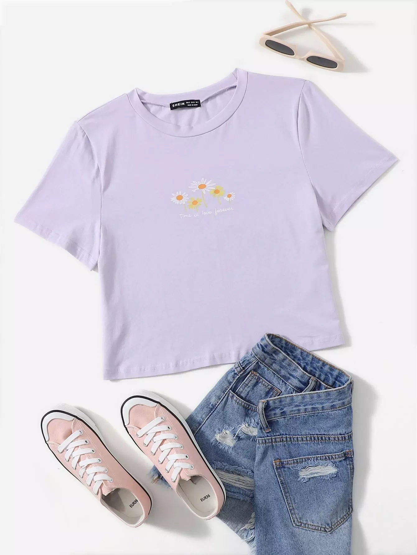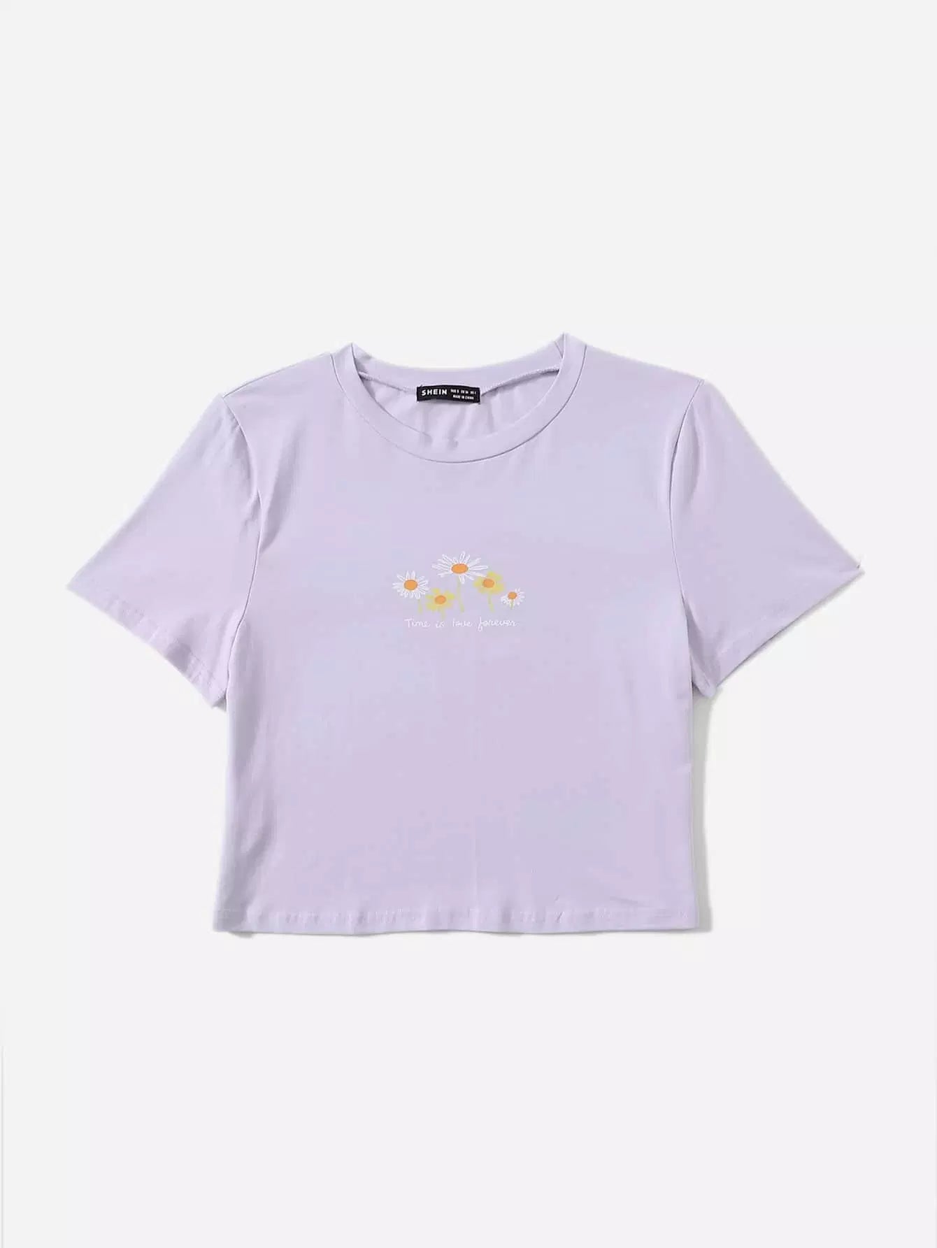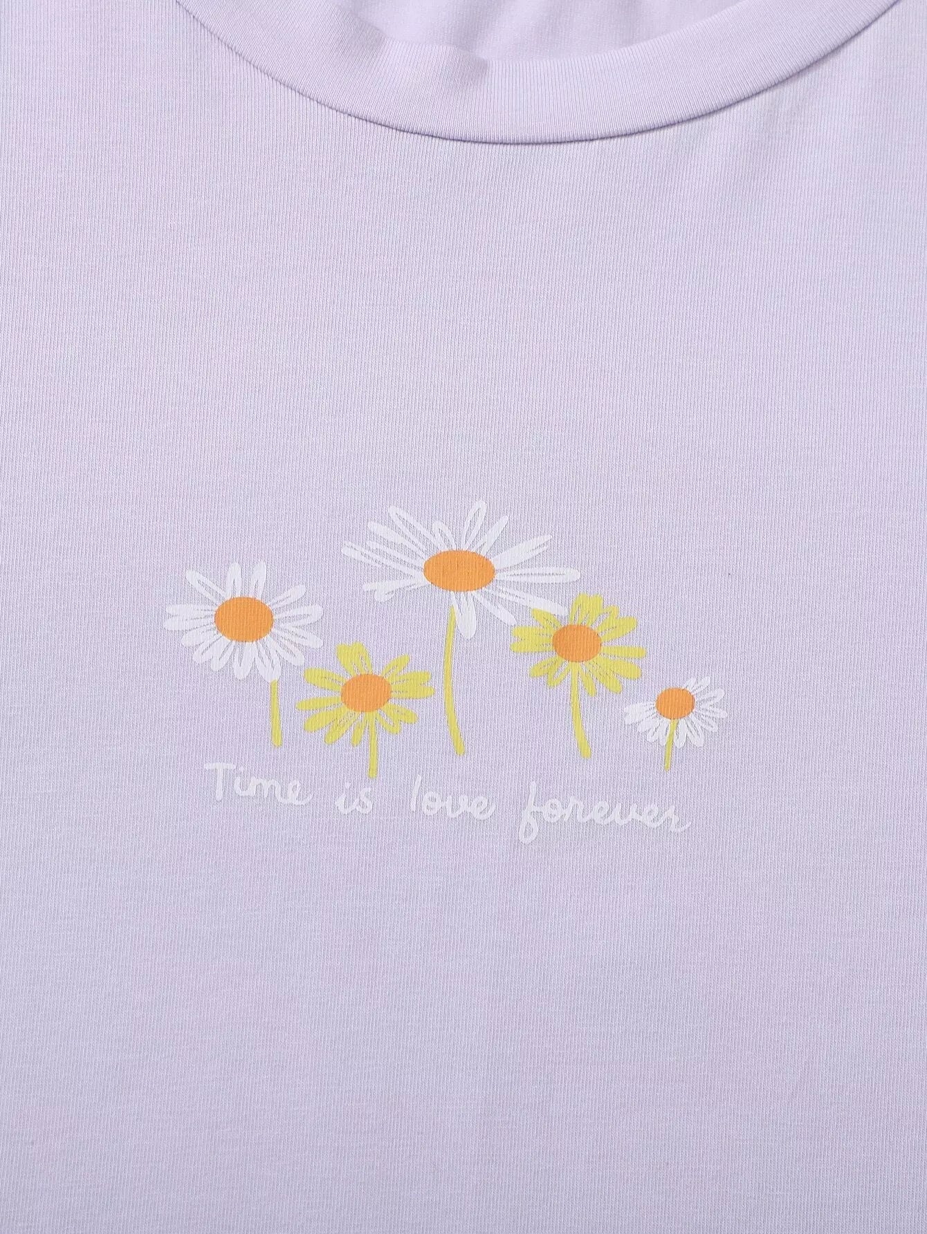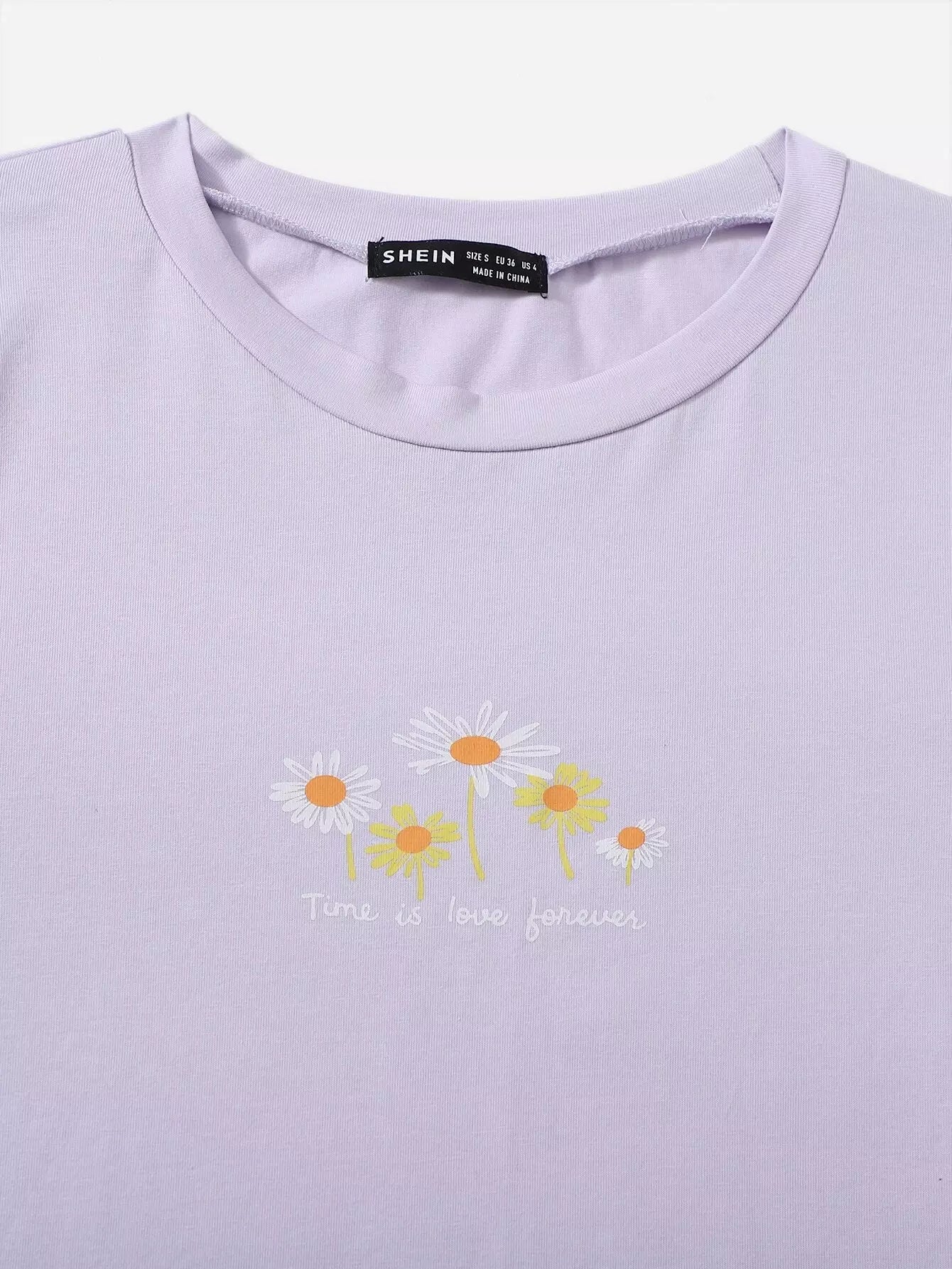 تي شيرت مطبوع عليه رسومات زهور وشعارات