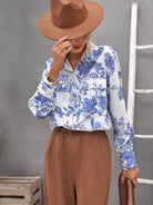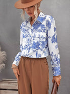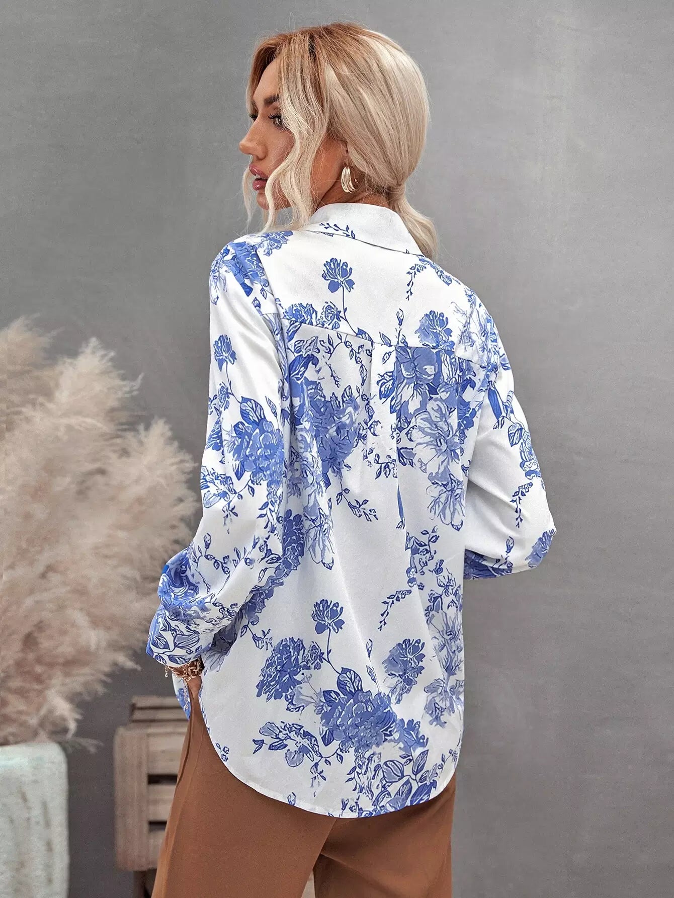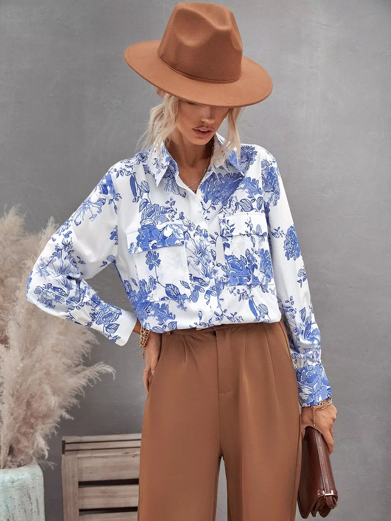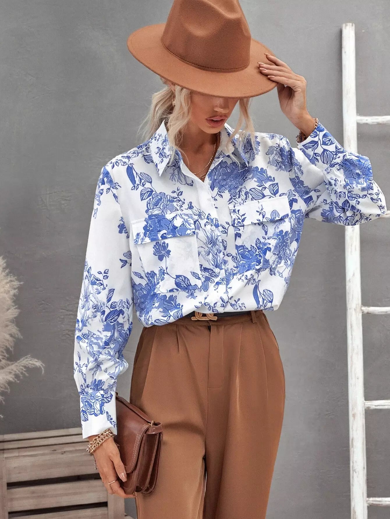 بلوزة بأكمام مطرزة بطبعة زهور وجيب بغطاء من الأسقف