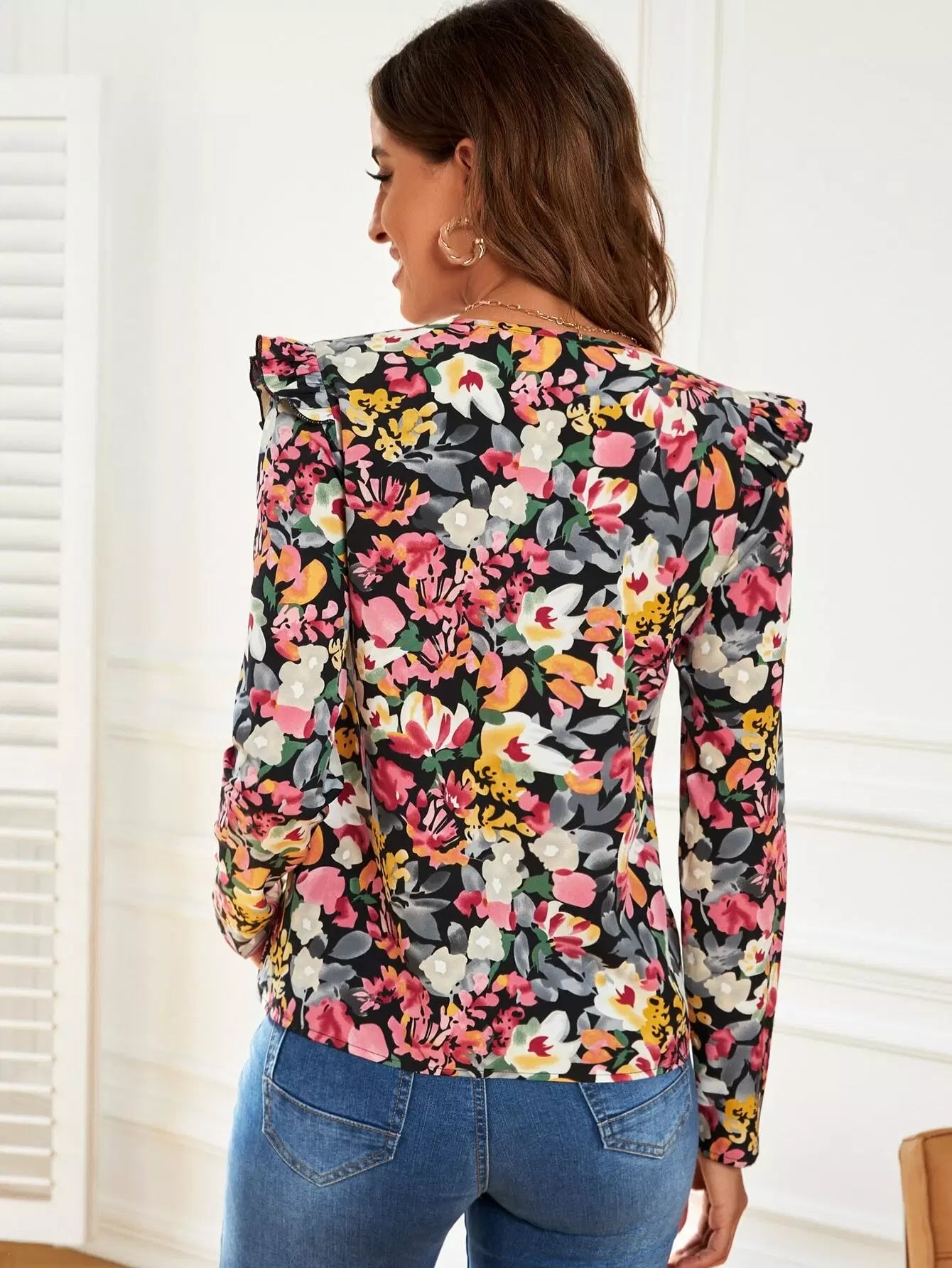 بلوزة بطبعة زهور برقبة على شكل V
