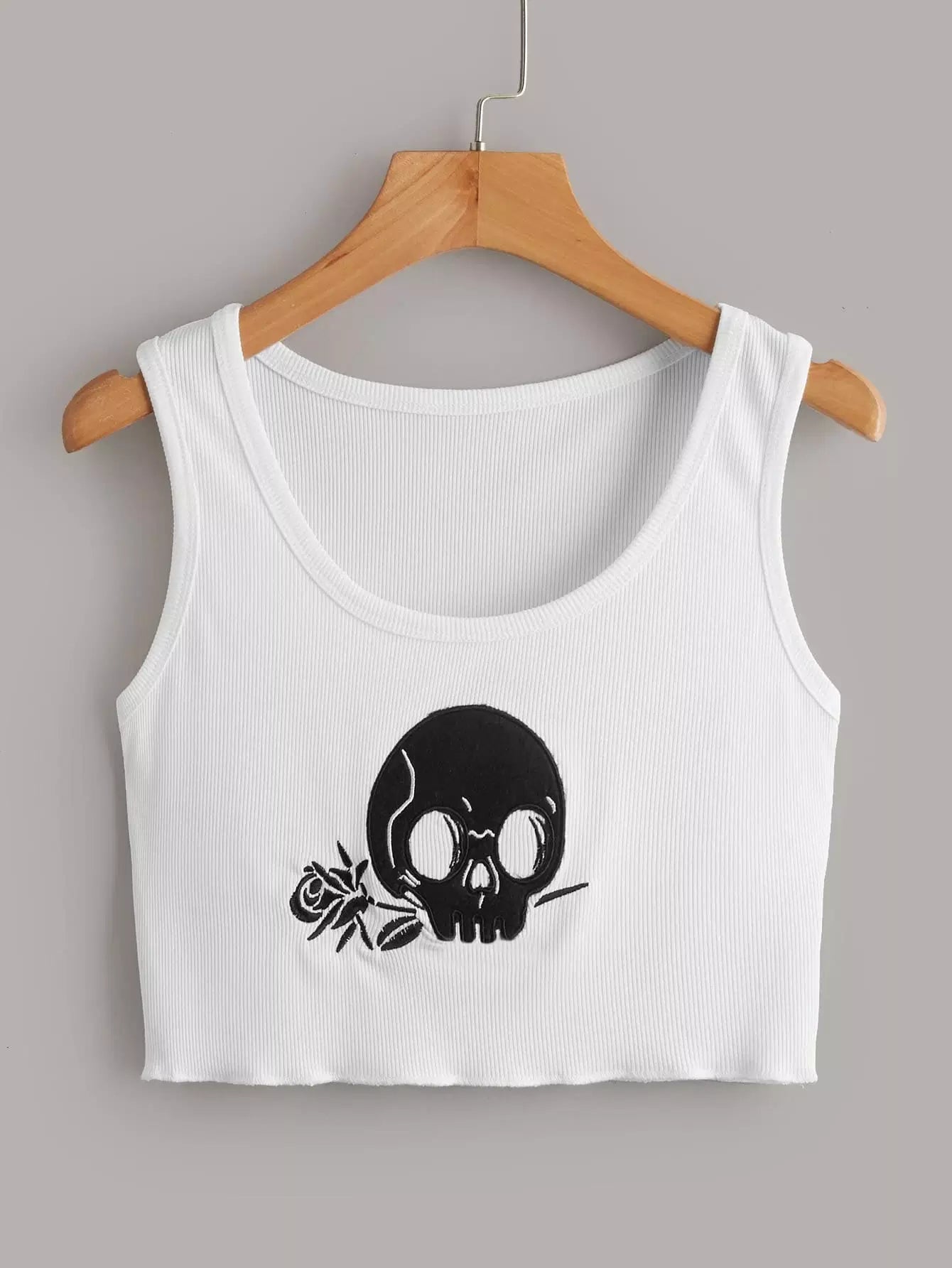 توب بدون أكمام مضلع مضلع بتطريزات زهور وجمجمة