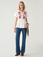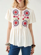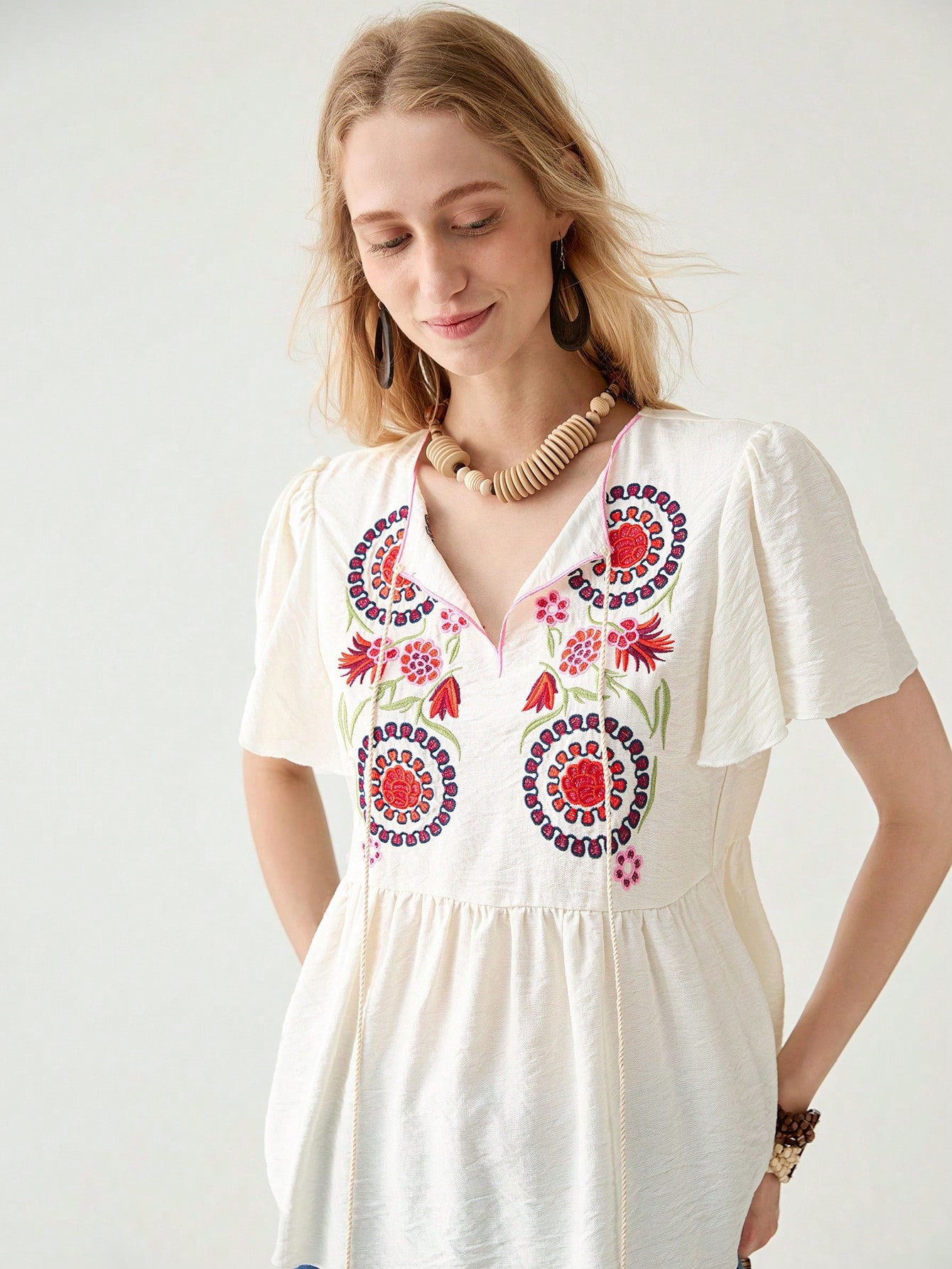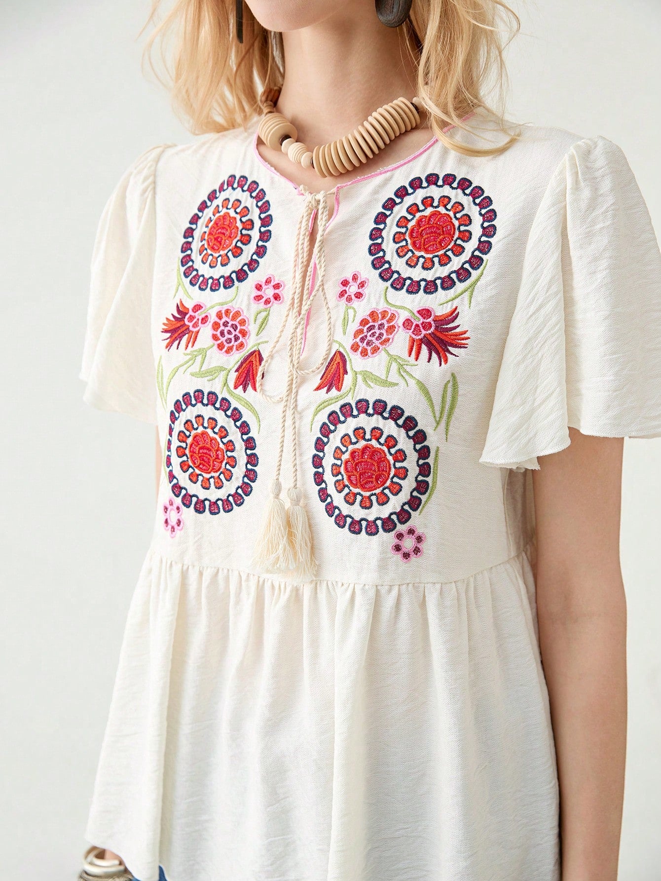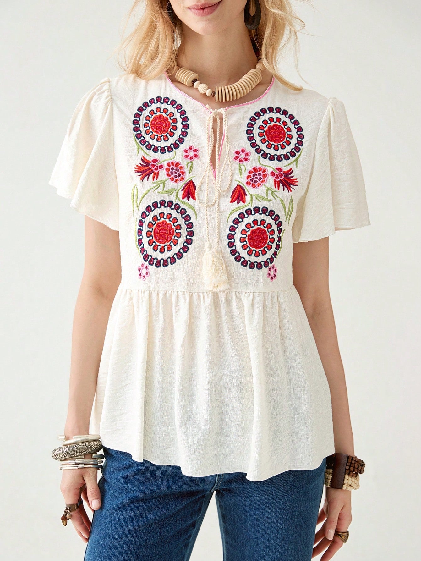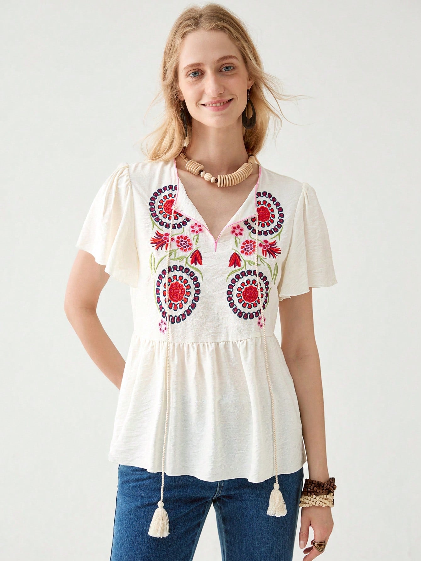 Florisole Women's Casual Loose V-Neck Retro Embroidered Ruffle Flare Sleeve Fringe Tie-Up Blouse, Spring/Summer