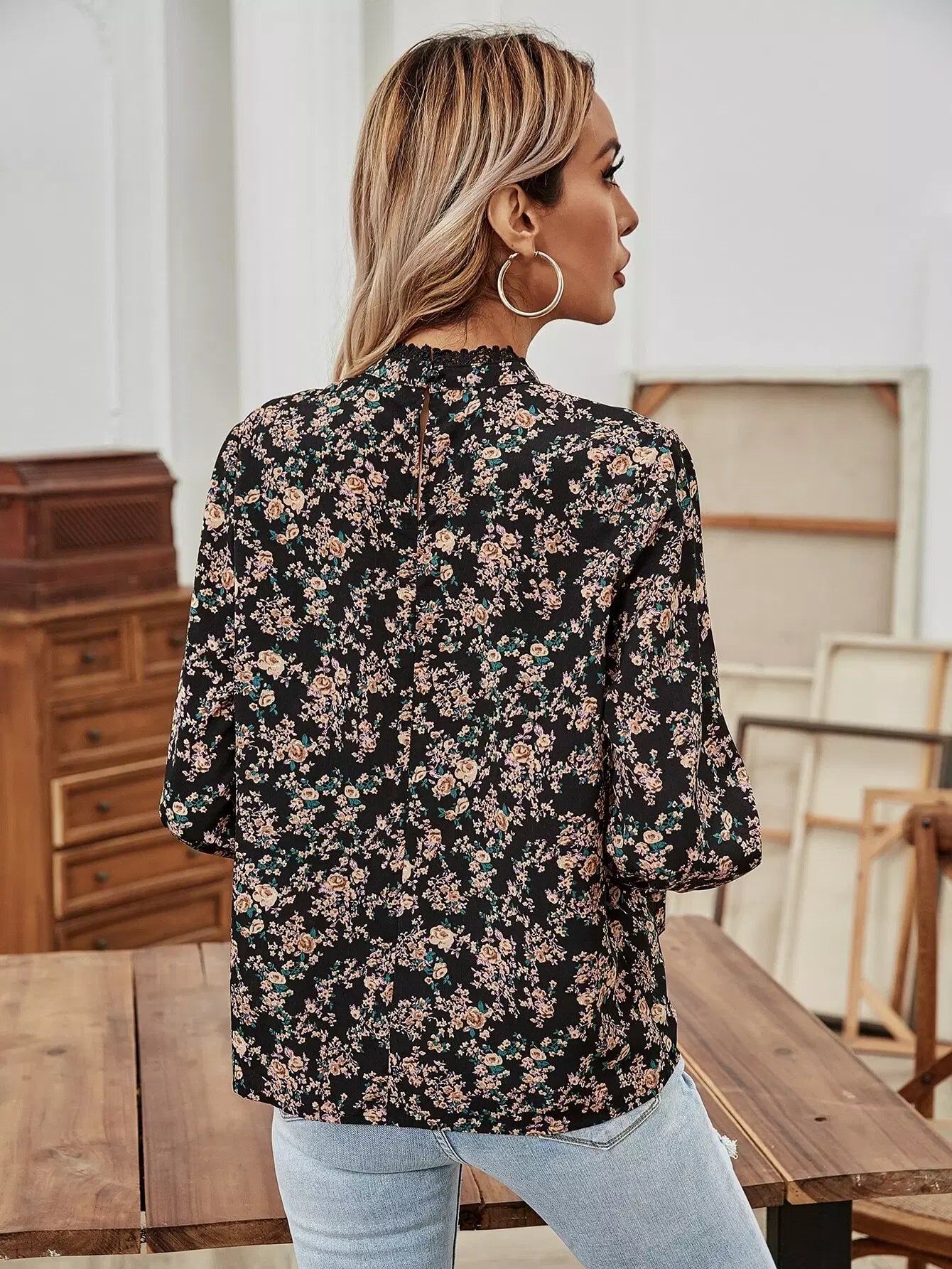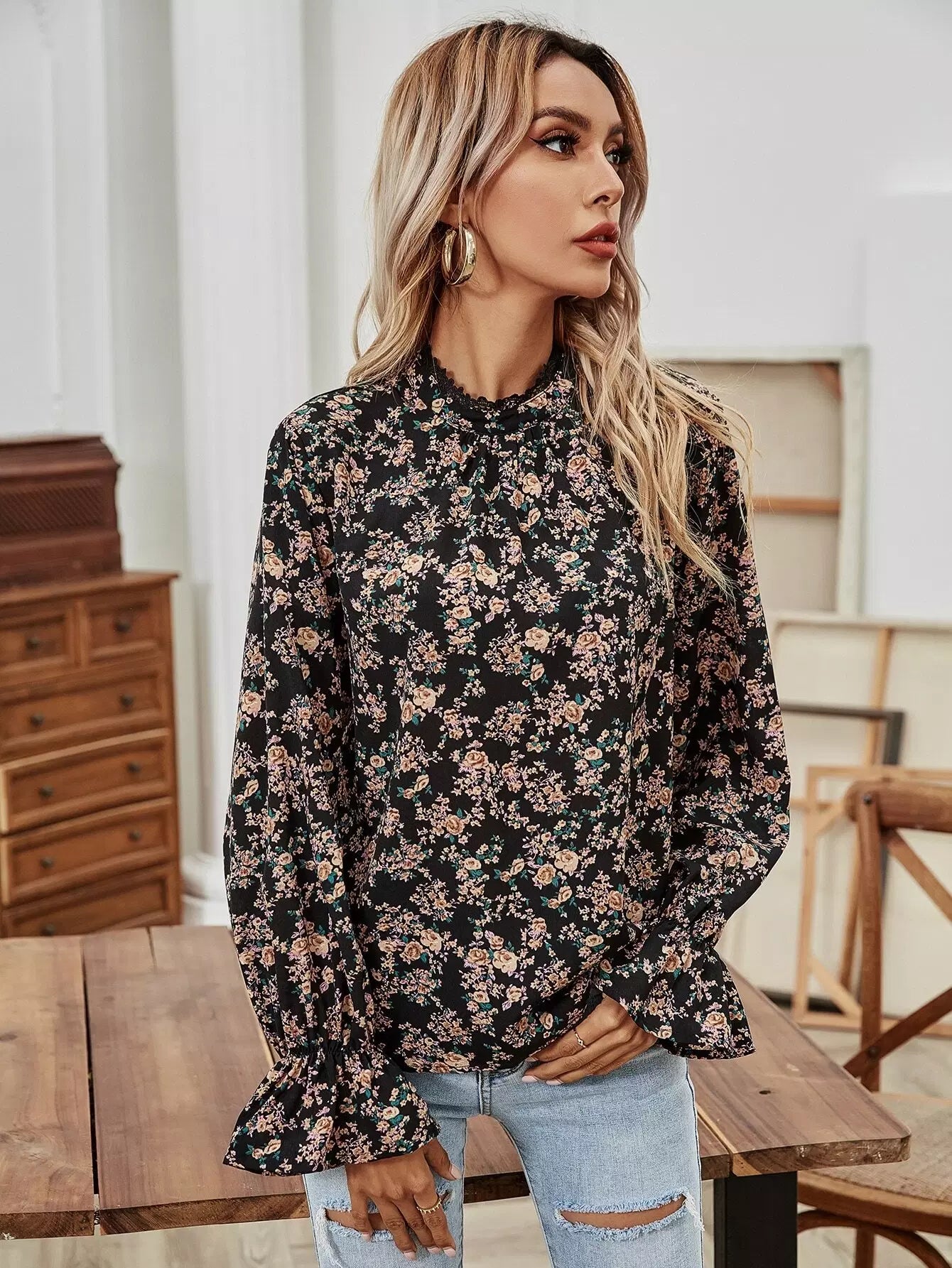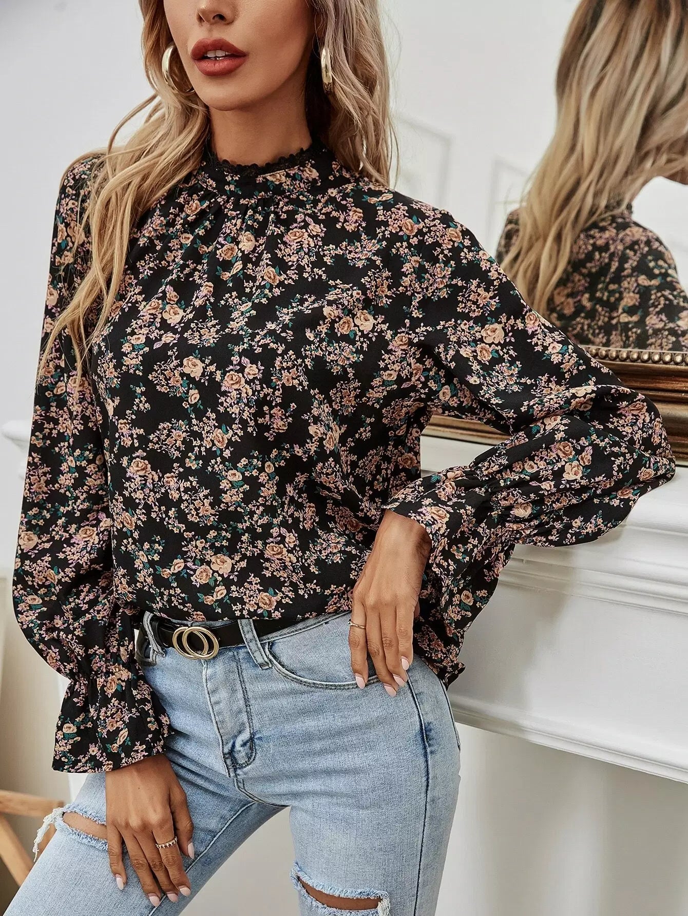 للنساء - بلوزة ذات رقبة وهمية وطبعة زهور