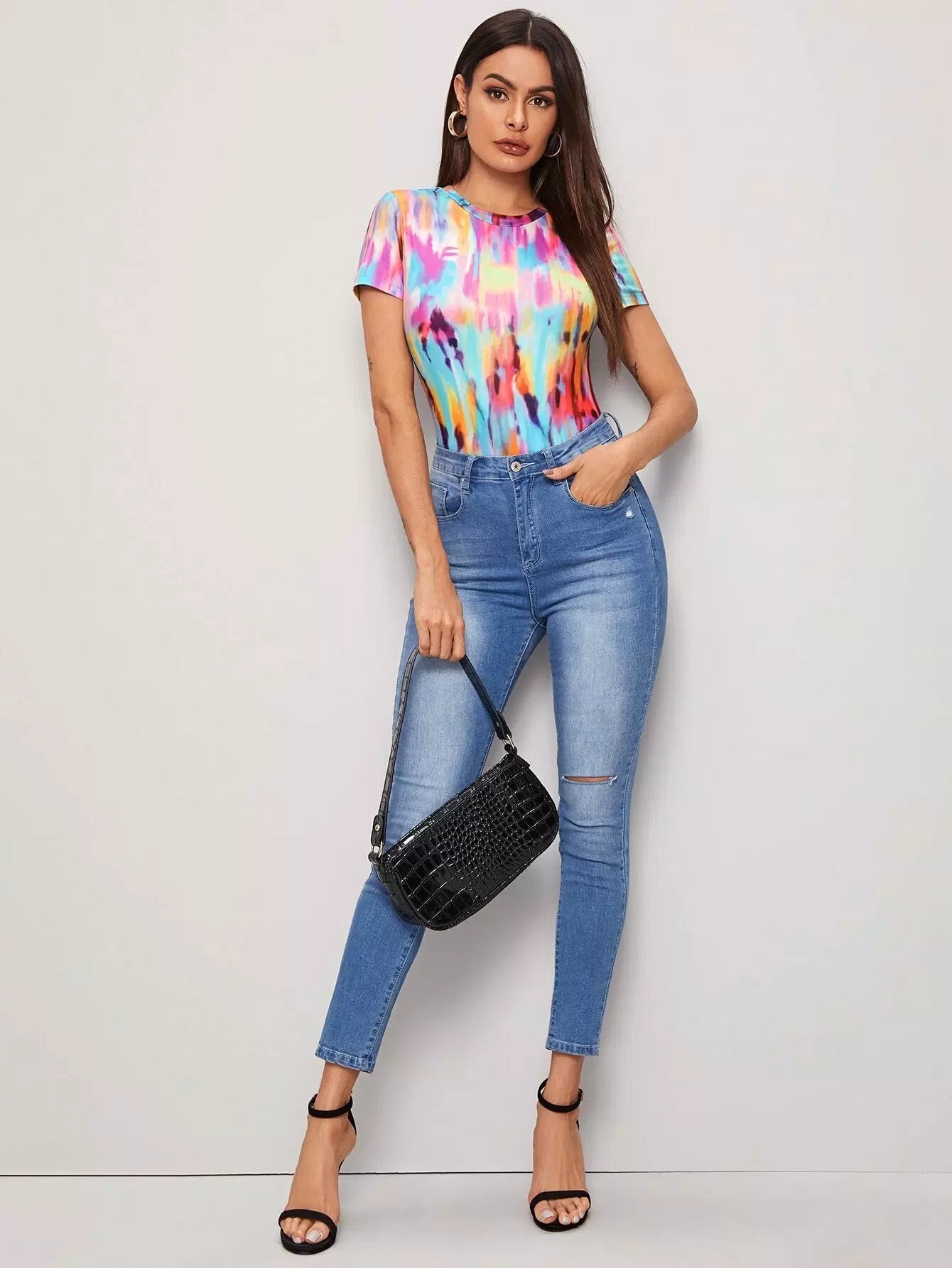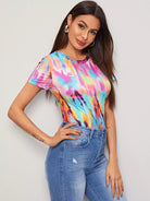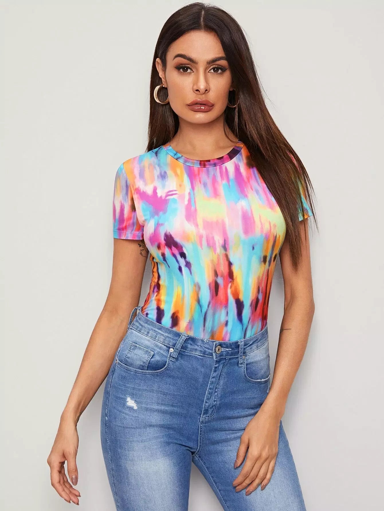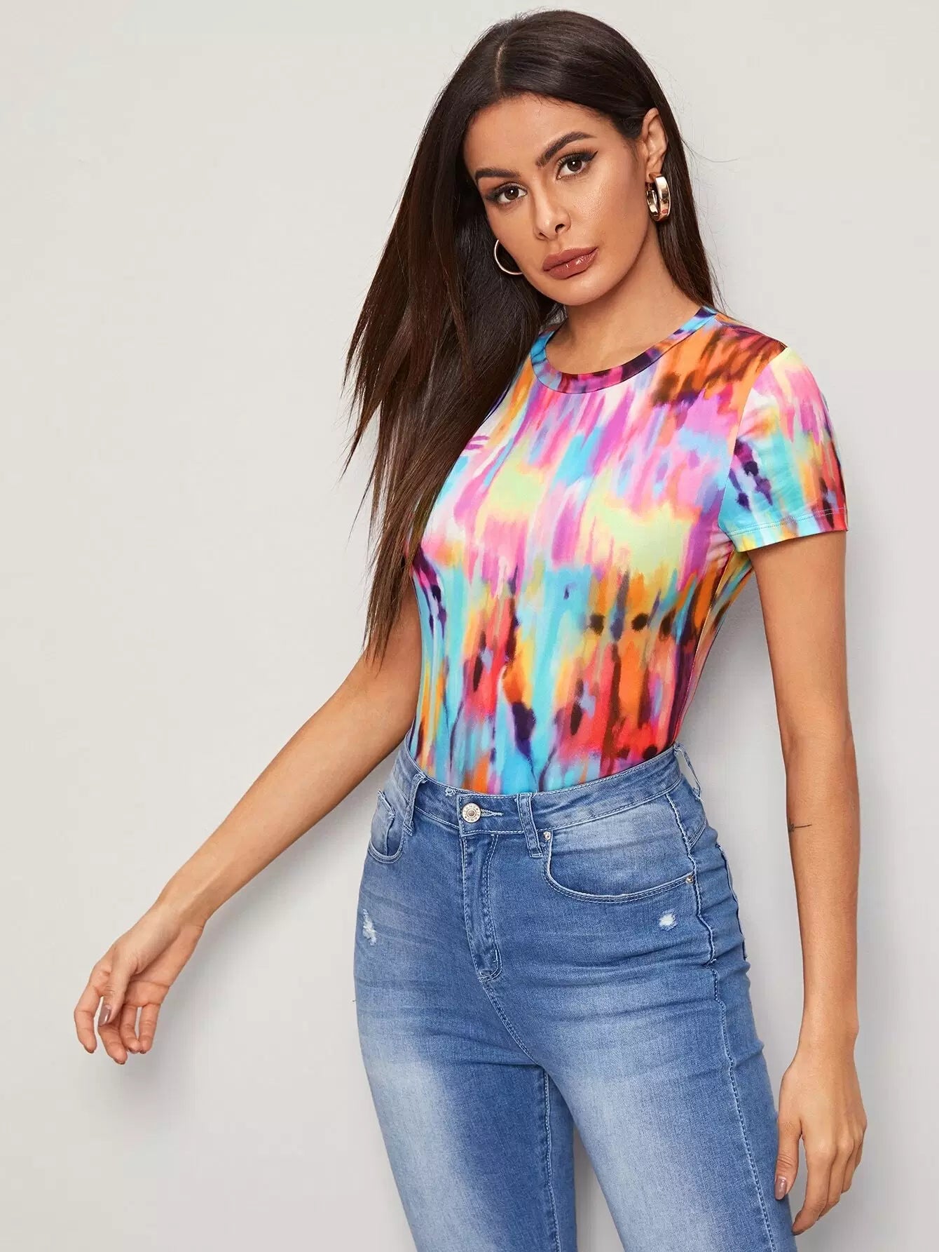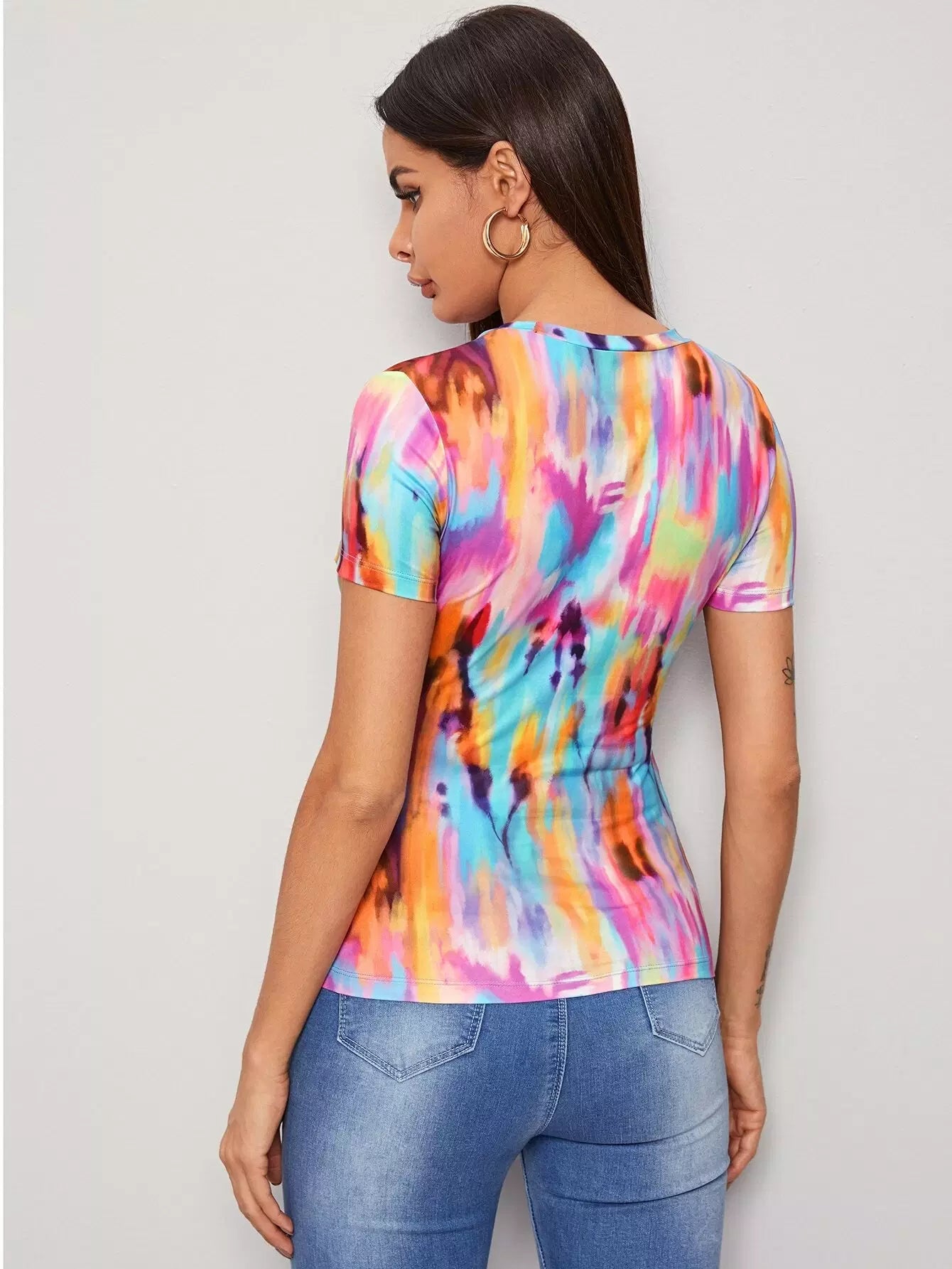 تي شيرت بقصّة قصيرة قصيرة على شكل ربطة عنق مصبوغة بالصبغة