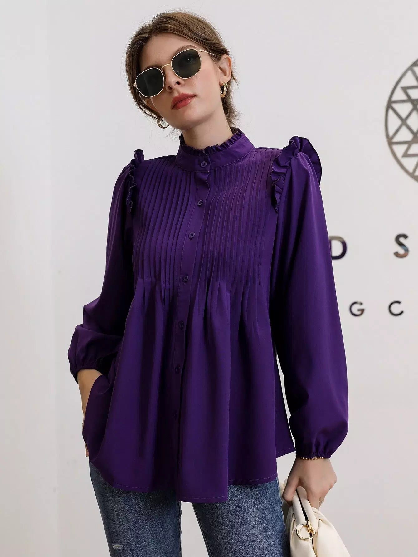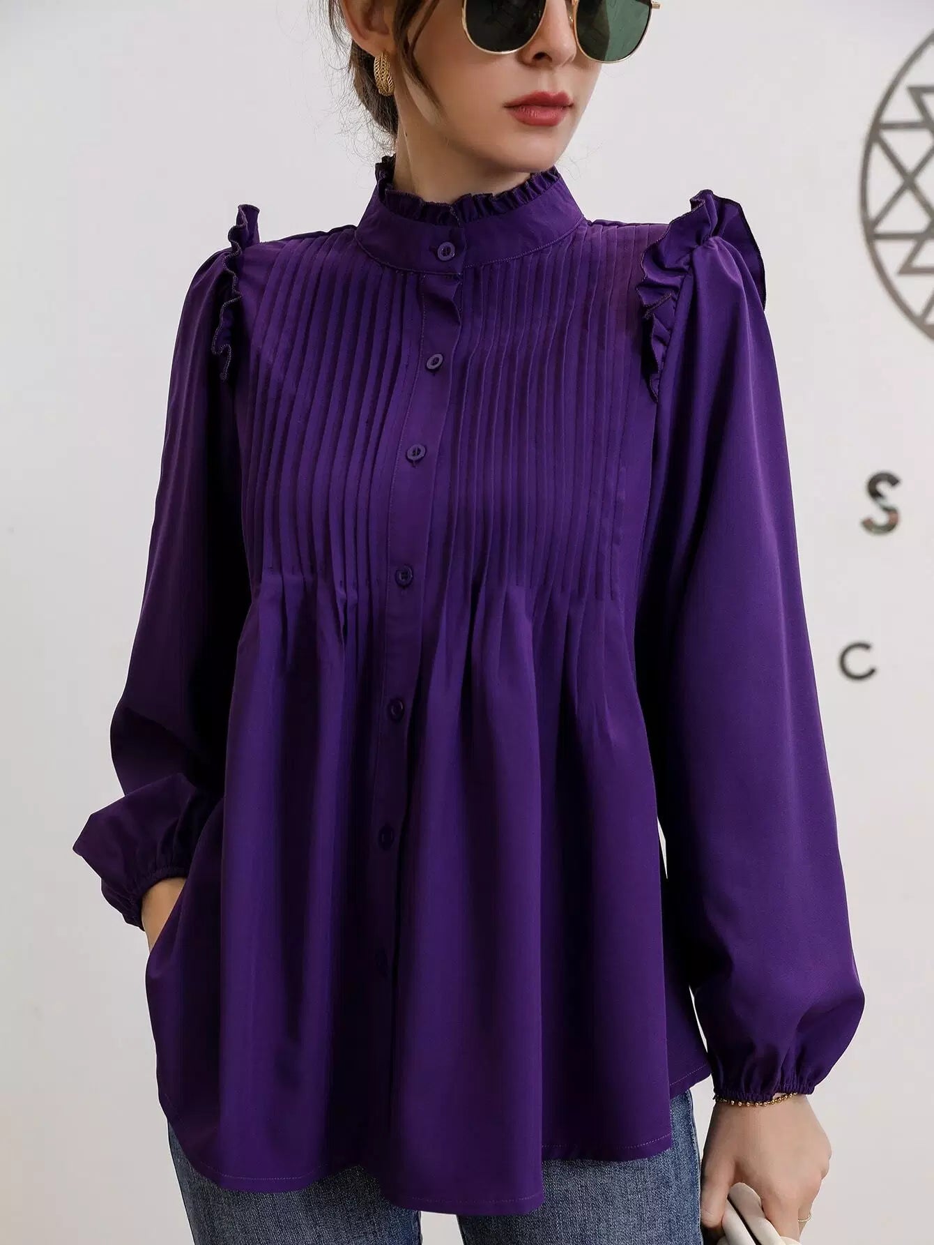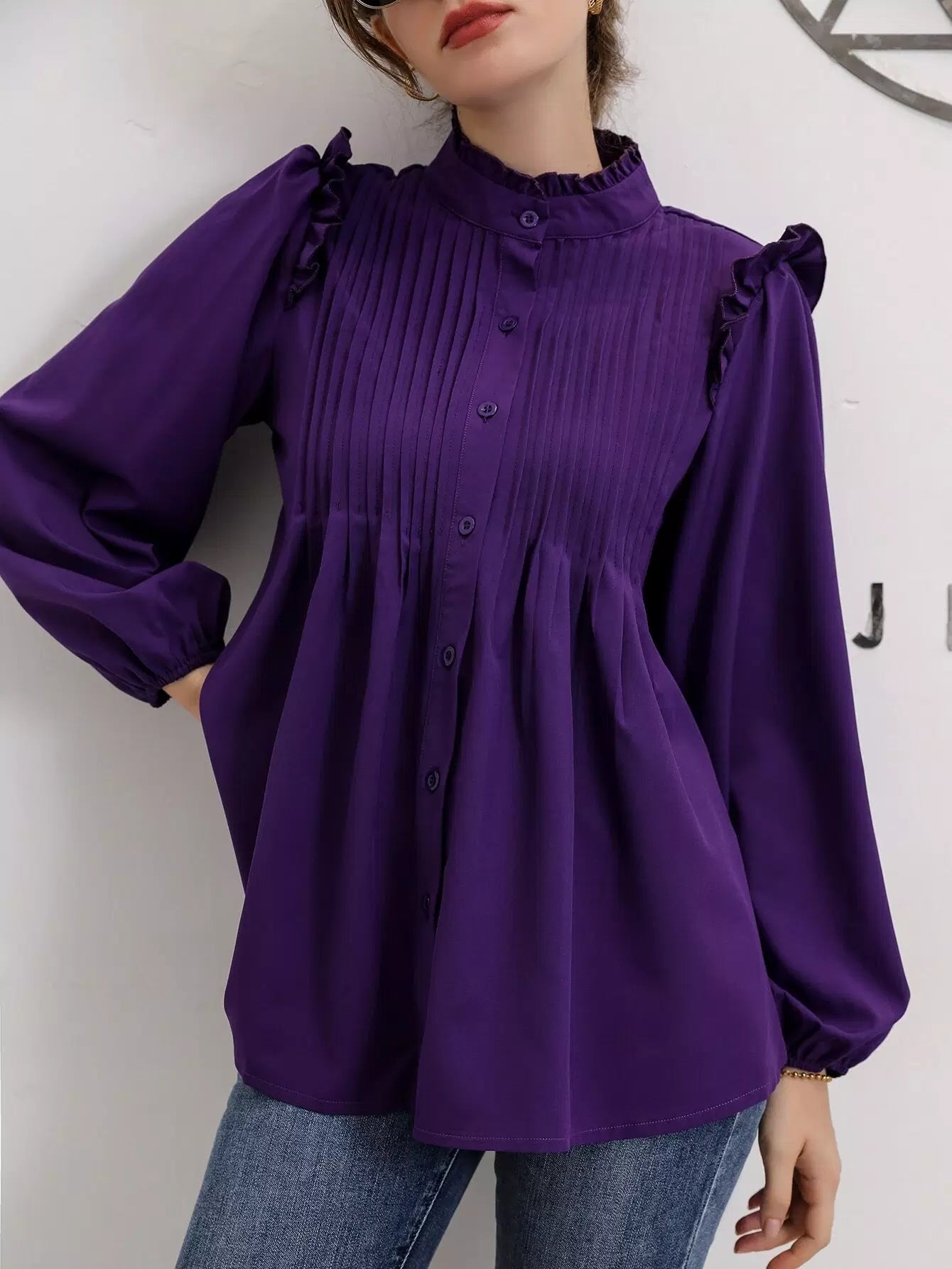 بلوزة مطوية ذات أزرار وفتحة رقبة مكشكشة