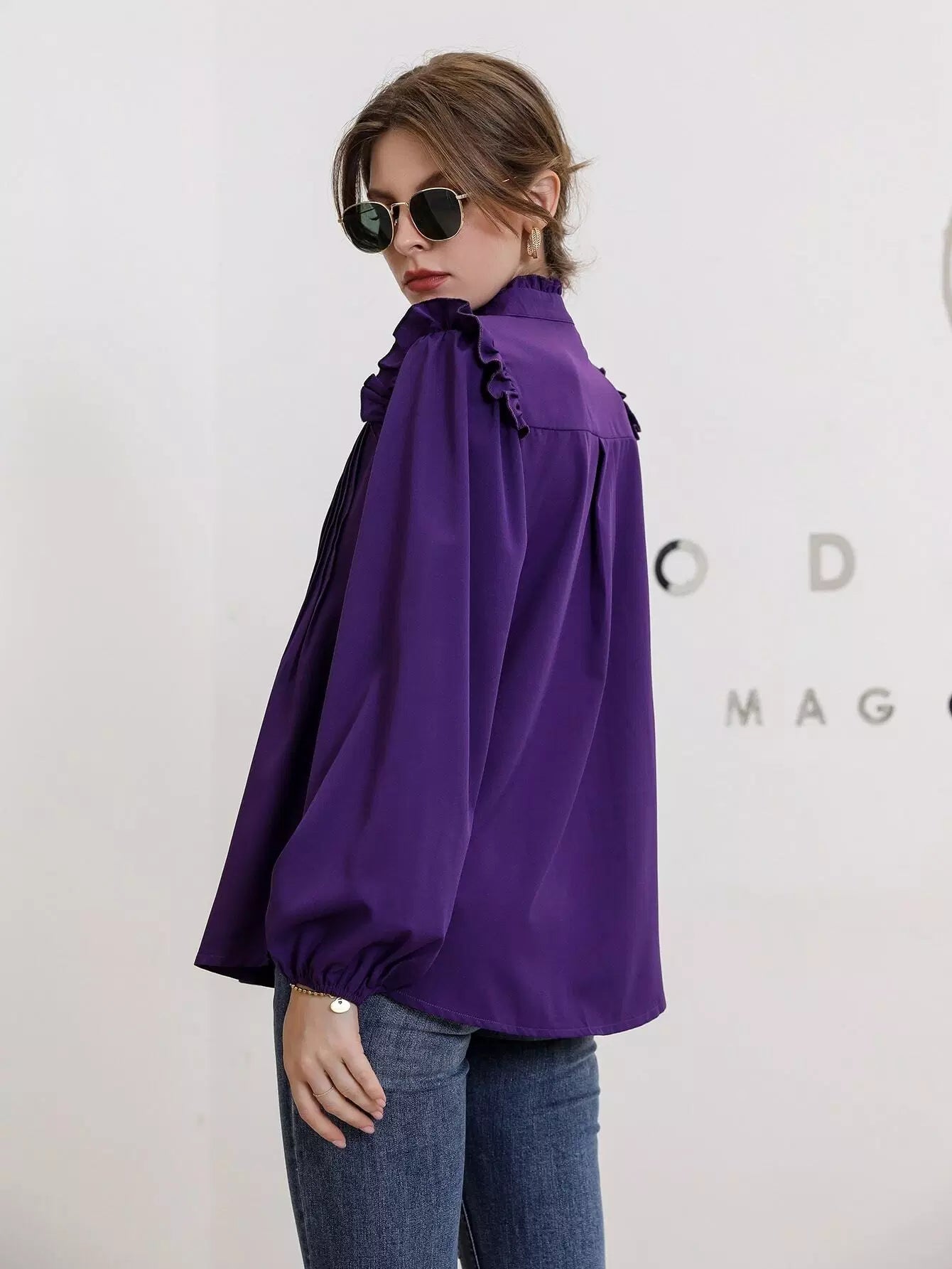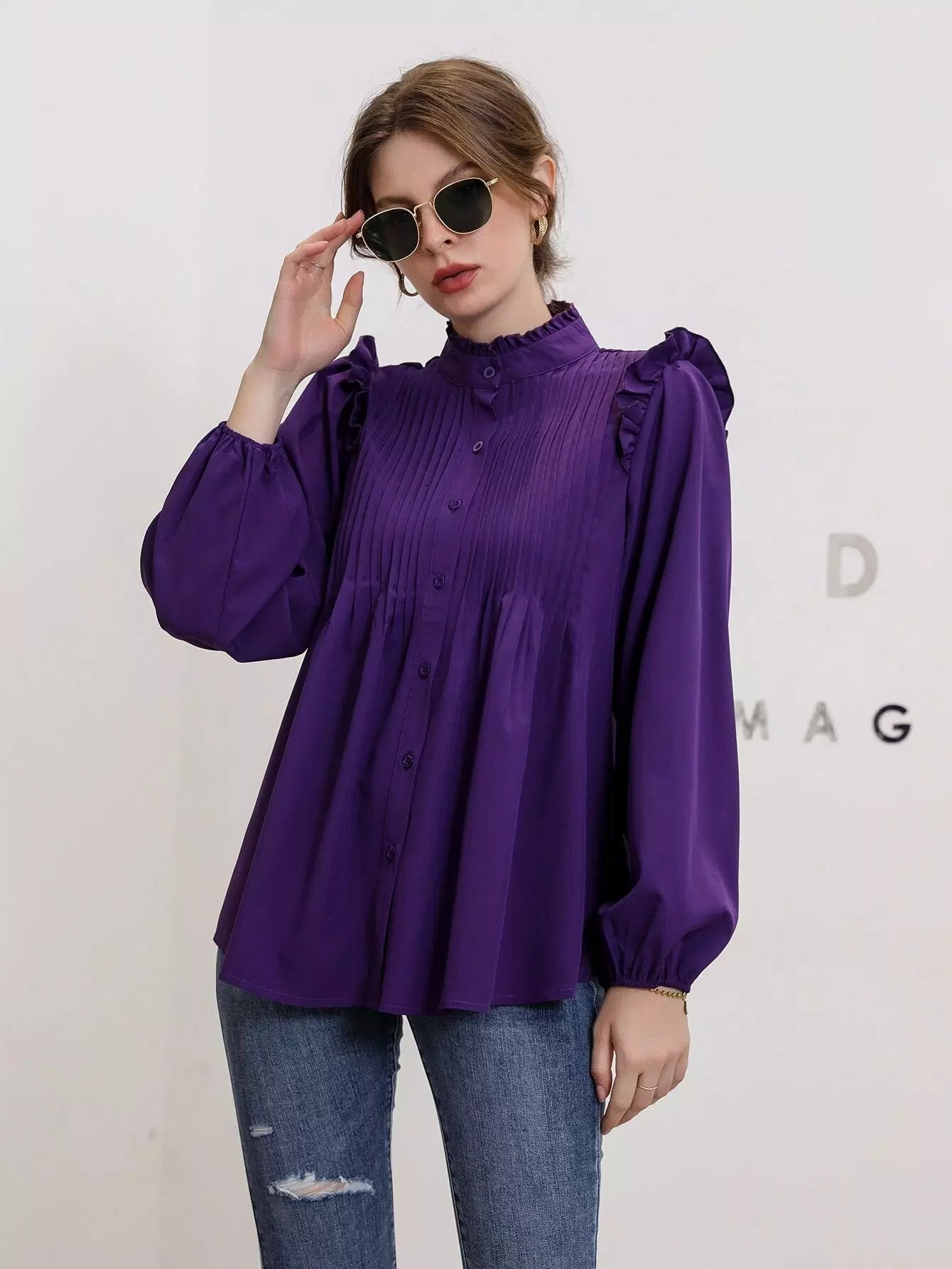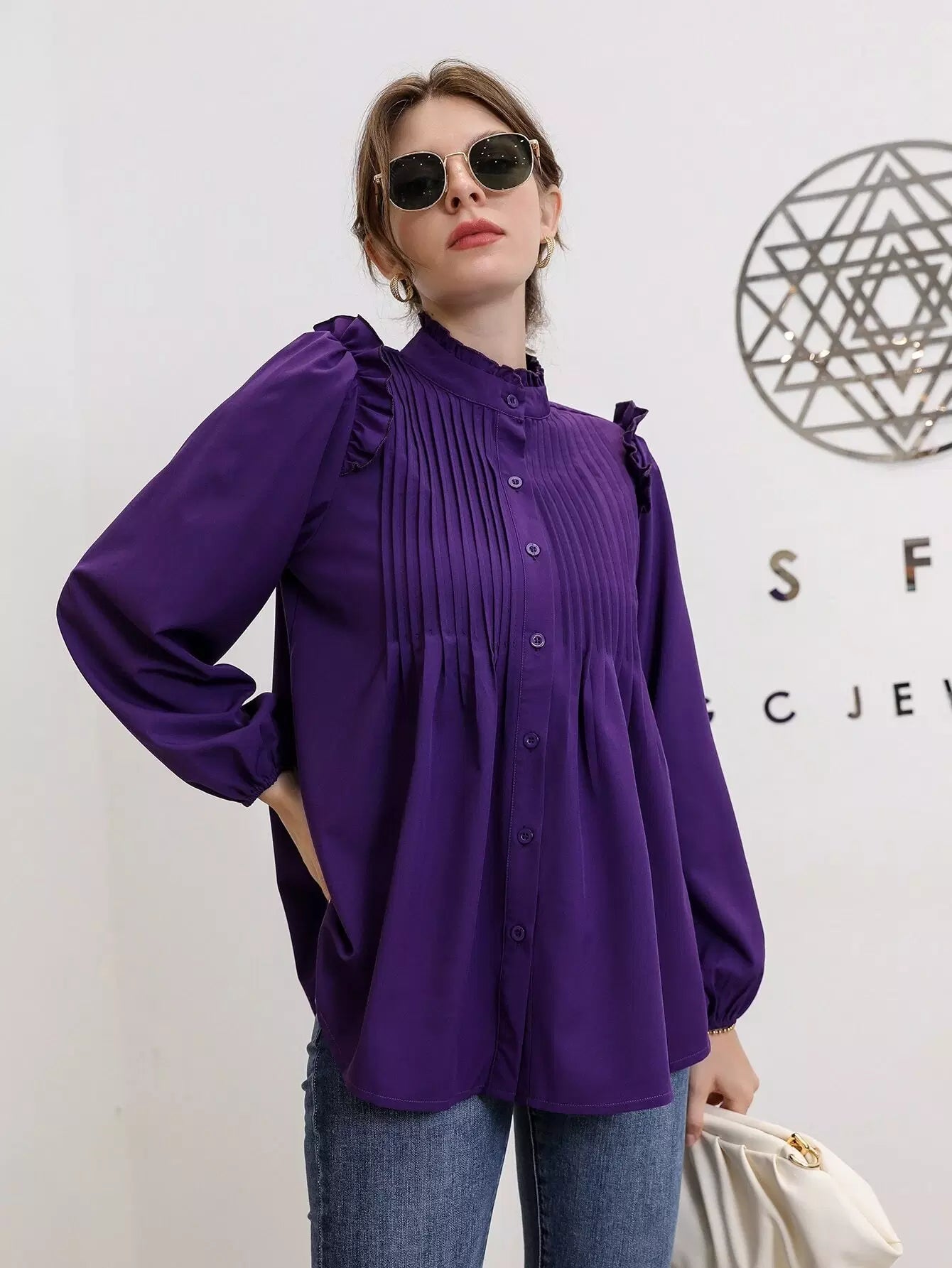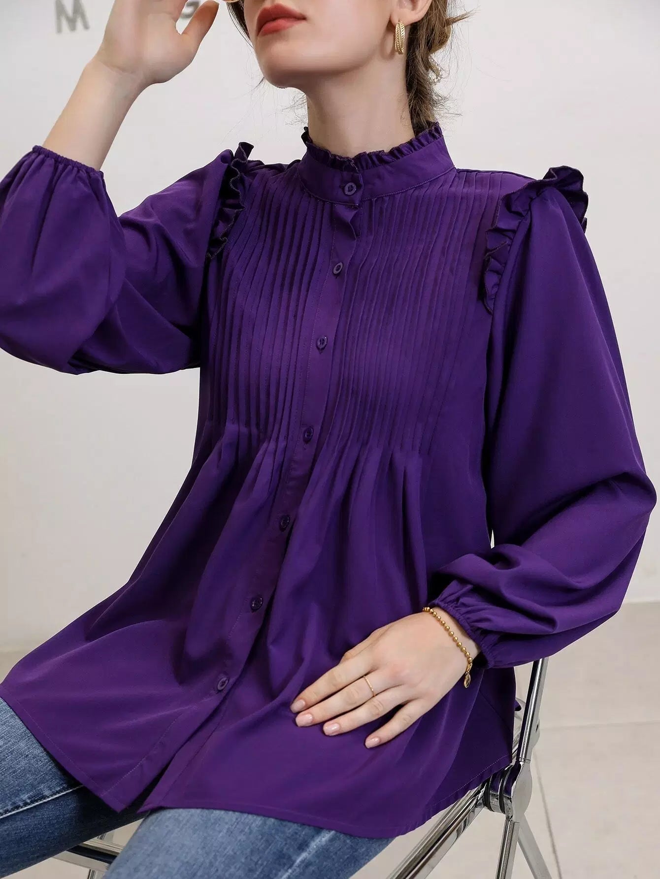 بلوزة مطوية ذات أزرار وفتحة رقبة مكشكشة