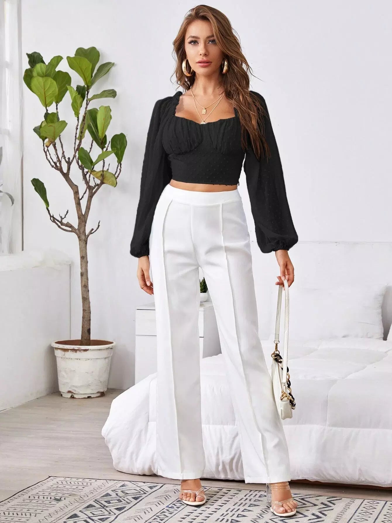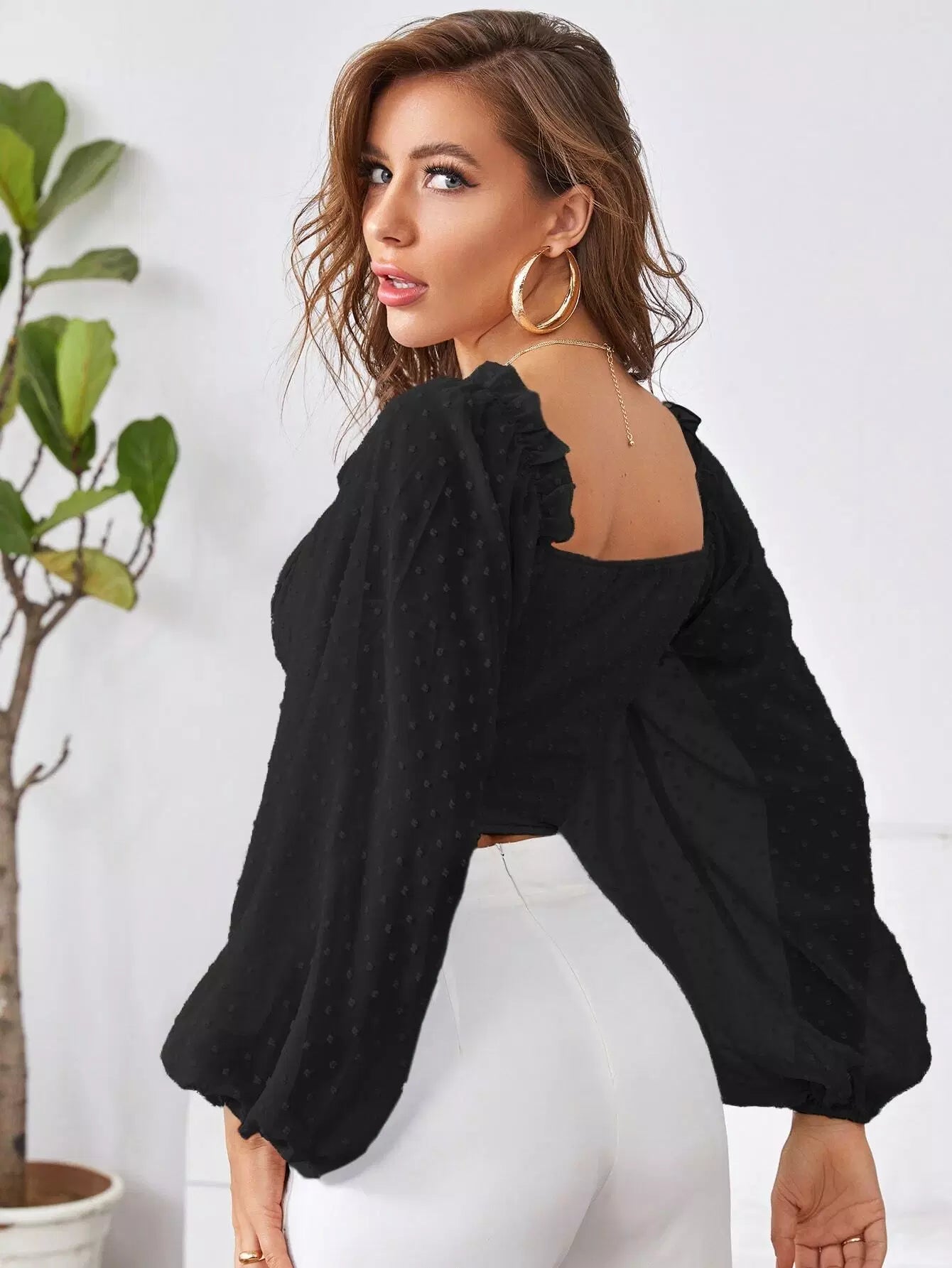 بلوزة سويسرية منقّطة بأكمام كشكش بحواف كشكش